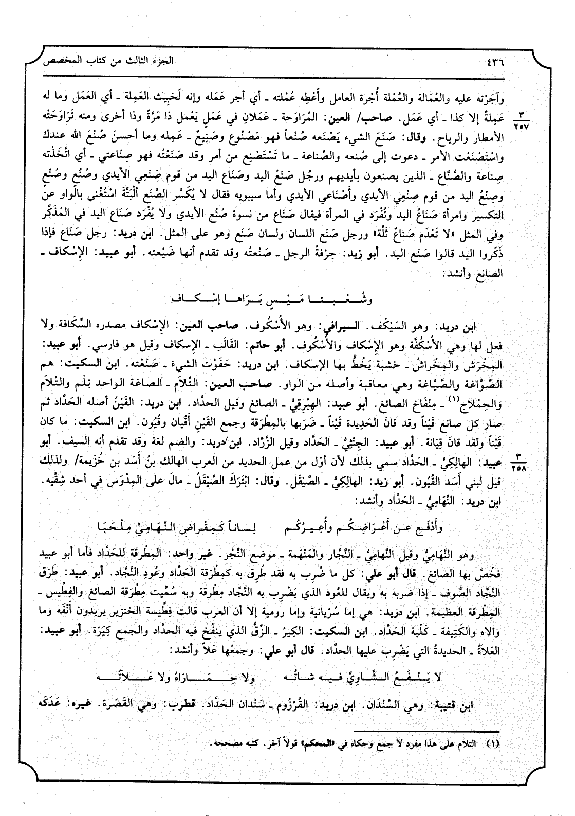 وآجرته عَلَيْهِ والعُمالة والعُملة أُجْرَة الْعَامِل وأعطِه عملته - أَي أجر عمله وَإنَّهُ لخبيث العمِلة - أَي الْعَمَل وَمَا لَهُ عملة إِلَّا كَذَا - أَي عمل. صَاحب الْعين: المُراوحة - عملان فِي عمل يعْمل ذَا مرّة وَذَا أُخْرَى وَمِنْه تراوحتْه الأمطار والرياح. وَقَالَ: صنع الشيءَ يصنعه صُنعاً فَهُوَ مَصْنُوع وصنيع - عمِله وَمَا أحسن صُنع الله عنْدك واستصنعت الْأَمر - دَعَوْت إِلَى صنعه والصناعة - مَا تستصنع من أَمر وَقد صَنعته فَهُوَ صناعتي - أَي اتّخذته صناعَة والصُنّاع - الَّذين يصنعون بأيديه وَرجل صنع الْيَد وصَناع الْيَد من قوم صنَعي الْأَيْدِي وصُنُع وصُنْع وصِنْع الْيَد من قوم صِنعي الْأَيْدِي وأصناعي الْأَيْدِي وَأما سِيبَوَيْهٍ فَقَالَ لَا يُكسّر الصّنَع البتّة استُغْني بِالْوَاو عَن التكسير وَامْرَأَة صَناع الْيَد وتُفرَد فِي الْمَرْأَة فَيُقَال صَناع من نسْوَة صُنُع الْأَيْدِي وَلَا يفرَد صناع الْيَد فِي المذكّر وَفِي الْمثل) لَا تعدَم صناع ثَلّة (وَرجل صنع اللِّسَان ولسان صنع وَهُوَ على الْمثل. ابْن دُرَيْد: رجل صَناع فَإِذا ذكرُوا الْيَد قَالُوا صنع الْيَد. أَبُو زيد: حِرفة الرجل - صَنعته وَقد تقدم أَنَّهَا ضيعته. أَبُو عبيد: الإسكاف - الصَّانِع وَأنْشد: وشُعبتا ميسٍ براها إسْكاف ابْن دُرَيْد: وَهُوَ السَيْكَف. السيرافي: وَهُوَ الأُسكوف. صَاحب الْعين: الإسكاف مصدره السِكافة وَلَا فعل لَهَا وَهِي الأُسْكُفّة وَهُوَ الإسكاف والأسكوف. أَبُو حَاتِم: القالَب - الإسكاف وَقيل هُوَ فَارسي. أَبُو عبيد: المِخرَش والمِخراش - خَشَبَة يخُطّ بهَا الإسكاف. ابْن دُرَيْد: حفَوْت الشَّيْء - صَنعته. ابْن السّكيت: هم الصّوّاغة والصّيّاغة وَهِي معاقبة وَأَصله من الْوَاو. صَاحب الْعين: التِلام - الصاغة الْوَاحِد تِلْم والتِلام والحملاج - منفاخ الصَّائِغ. أَبُو عبيد: الهِبْرِقيّ - الصَّائِغ وَقيل الحدّاد. ابْن دُرَيْد: القَيْن أَصله الحدّاد ثمَّ صَار كل صانع قيْناً وَقد قان الحديدة قيْناً - ضربهَا بالمطرقة وَجمع القَيْن أقْيان وقُيون. ابْن السّكيت: مَا كَانَ قينا وَلَقَد قان قِيانة. أَبُو عبيد: الجِنثيّ - الحدّاد وَقيل الزّرّاد. ابْن دُرَيْد: وَالضَّم لُغَة وَقد تقدم أَنه السَّيْف. أَبُو عبيد: الهالِكيّ - الحدّاد سمي بذلك لِأَن أول من عمل الْحَدِيد من الْعَرَب الْهَالِك بنُ أسَد بن خُزَيمة وَلذَلِك قيل لبني أَسد القُيون. أَبُو زيد: الهالكيّ - الصّيقَل. وَقَالَ: ابترك الصّيقَل - مَال على المِدوَس فِي أحد شقّيه. ابْن دُرَيْد: النِهاميّ - الحدّاد وَأنْشد: وأدفَع عَن أعراضِكم وأعيرُكم لِسَانا كمقراضِ النهامي مِلْحَبا وَهُوَ النّهامي وَقيل النّهامي - النّجار والمَنهَمة - مَوضِع النّجر. غير وَاحِد: المطرقة للحدّاد فَأَما أَبُو عبيد: فخصّ بهَا الصَّائِغ. قَالَ أَبُو عبيد: طرق النّجّاد الصُّوف - إِذا ضربه بِهِ وَيُقَال للعود الَّذِي يضرِب بِهِ النّجّاد مطرقة وَبِه سمّيت مطرقة الصَّائِغ والفِطّيس - المطرقة الْعَظِيمَة. ابْن دُرَيْد: هِيَ إِمَّا سريانية وَإِمَّا رُومِية إِلَّا أَن الْعَرَب قَالَت فِطّيسة الْخِنْزِير يُرِيدُونَ أَنفه وَمَا وَالَاهُ والكتيفة - كلبة الحدّاد. ابْن السّكيت: الكِير - الزِقّ الَّذِي ينفُخ فِيهِ الحدّاد وَالْجمع كيَرة. أَبُو عبيد: العَلاة - الحديدة الَّتِي يضرِب عَلَيْهَا الحدّاد. قَالَ أَبُو عَليّ: وَجَمعهَا علا وَأنْشد: ابْن قُتَيْبَة: وَهِي السّندان. ابْن دُرَيْد: القُرزوم - سَنْدان الحدّاد. قطرب: وَهِي القصَرة. غَيره: عدَكَه