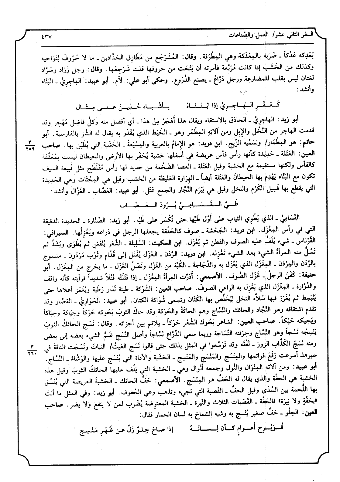 يعدِكه عدْكاً - ضربه بالمِعدَكة وَهِي المطرقة. وَقَالَ: المشَرْجَع من مَطارِق الحدّادين - مَا لَا حُروف لنواحيه وَكَذَلِكَ من الْخشب إِذا كَانَت مربّعة فَأَمَرته أَن ينْحَت من حروفها قلت شرْجِعْها. وَقَالَ: رجل زرّاد وسرّاد لُغَتَانِ لَيْسَ بقلب للمضارعة وَرجل درّاع - يصنع الدّروع. وَحكى أَبُو عَليّ: لأم. أَبُو عبيد: الهاجري - الْبناء وَأنْشد: كعَقْرِ الهاجريّ إِذا ابتناه بأشْباه حُذينَ على مِثَال أَبُو زيد: الهاجري - الحاذق بالاستقاء وَيُقَال هَذَا أَهجر من هَذَا - أَي أفضل مِنْهُ وكلّ فاضِل مُهجِر وَقد قدمت الهاجِر من النّخل وَالْإِبِل وَمن آلاته المطْمَر وَهُوَ - الْخَيط الَّذِي يقدّر بِهِ يُقَال لَهُ الشّز بِالْفَارِسِيَّةِ. أَبُو حَاتِم: هُوَ المِطْمار ونسميه الزّيج. ابْن دُرَيْد: هُوَ الإِمَام بِالْعَرَبِيَّةِ والمِسْيَعة - الْخَشَبَة الَّتِي يُطَيّن بهَا. صَاحب الْعين: العتَلة - حَدِيدَة كَأَنَّهَا رَأس فأس عريضة فِي أَسْفَلهَا خَشَبَة يُحفَر بهَا الأَرْض والحيطان لَيست بمعقّفة كالفأس وَلكنهَا مُسْتَقِيمَة مَعَ الْخَشَبَة وَقيل العتَلة - الْعَصَا الضّخْمة من حَدِيد لَهَا رزس مفلطَح مثل قَبيعة السَّيْف تكون مَعَ البنّاء يهدِم بهَا الْحِيطَان والعتلة أَيْضا - الهِراوة الغليظة من الْخشب وَقبل هِيَ المِجْثاث وَهِي الحديدة الَّتِي يقطع بهَا فَسيل الكرْم وَالنَّخْل وَقيل هِيَ بيْرَم النّجّار وَالْجمع عتَل. أَبُو عبيد: العصّاب - الغزّال وَأنْشد: طيَّ القَساميّ بُرودَ العصّاب القَساميّ - الَّذِي يطوي الثِّيَاب على أوّل طيّها حَتَّى تُكسَر على طيّه. أَبُو زيد: الضِنّارة - الحديدة الدقيقة الَّتِي فِي رَأس المغزل. ابْن دُرَيْد: الجَحْشة - صوف كالحلْقة يَجْعَلهَا الرجل فِي ذراعه ويغزلها. السيرافي: القُرْناس - شَيْء يلَفّ عَلَيْهِ الصُّوف والقطن ثمَّ يُغزل. ابْن السّكيت: السّليلة - الشّعر يُنفَش ثمَّ يُطوى ويُشدّ ثمَّ تَسُلّ مِنْهُ الْمَرْأَة الشيءَ بعد الشَّيْء تغزِله. ابْن دُرَيْد: الرّدَن - الغزْل يُفتَل إِلَى قُدّام وثوب مردون - منسوج بالرّدَن والمِردَن - المغزَل الَّذِي يغزَل بِهِ والدّجاجة - الكُبّة من الغزْل ونصل الغزْل - مَا يخرج من المغزَل. أَبُو حنيفَة: كفَن الرجل - غزَل الصُّوف. الْأَصْمَعِي: أدرّت الْمَرْأَة المغزَل - إِذا فتلتْه فتْلاً شَدِيدا فرأيته كَأَنَّهُ وَاقِف والدّرّارة - المغزَل الَّذِي يغزِل بِهِ الرَّاعِي الصُّوف. صَاحب الْعين: الشّوكة - طِينَة تُدار رطْبة ويغمَز أَعْلَاهَا حَتَّى ينبسط ثمَّ يُغرَز فِيهَا سُلاّء النّخل ليخلّص بهَا الكتّان وَتسَمى شُواكة الْكَتَّان. أَبُو عبيد: الحَواريّ - القَصّار وَقد تقدم اشتقاقه وَهُوَ النّجّاد والحائك والنّسّاج وهم الحاكة والحَوَكة وَقد حاك الثوبَ يحوكه حوْكاً وحِياكة وحِياكاً ويَحيكه حيْكاً. صَاحب الْعين: الشَّاعِر يحوك الشِعْر حوْكاً - يلائم بَين أَجْزَائِهِ. وَقَالَ: نسج الحائك الثَّوْب ينسجه نسجاً وَهُوَ النّسّاج وحرْفته النِساجة وَرُبمَا سمي الدّرّاع نسّاجاً وأصل النّسْج ضمّ الشَّيْء بعضه إِلَى بعض وَمِنْه نسج الكذّاب الزورَ - لفّقه وَقد توسّعوا فِي الْمثل حَتَّى قَالُوا نسج الْغَيْث النَّبَات ونسجت النَّاقة فِي سَيرهَا - أسرعت رفْع قَوَائِمهَا والمِنسَج والمنسَج والمَنسِج - الْخَشَبَة والأداة الَّتِي يُنسج عَلَيْهَا والوشّاء - النّسّاج. أَبُو عبيد: وَمن آلاته المِنوال والنّول وَجمعه أنوال وَهِي - الْخَشَبَة الَّتِي يلُف عَلَيْهَا الحائك الثَّوْب وَقيل هَذِه الْخَشَبَة هِيَ الحفّة وَالَّذِي يُقَال لَهُ الحفّ هُوَ المِنسَج. الْأَصْمَعِي: حفّ الحائك - الْخَشَبَة العريضة الَّتِي ينسّق بهَا اللُحمة بَين السّدى وَقيل الحفّ - القصبة الَّتِي تَجِيء وَتذهب وَهِي الحُفوف. أَبُو زيد: وَفِي الْمثل) مَا أَنْت بحفّة وَلَا نيرَة (فالحفّة - القصبات الثَّلَاثَة والنّيرة - الْخَشَبَ
