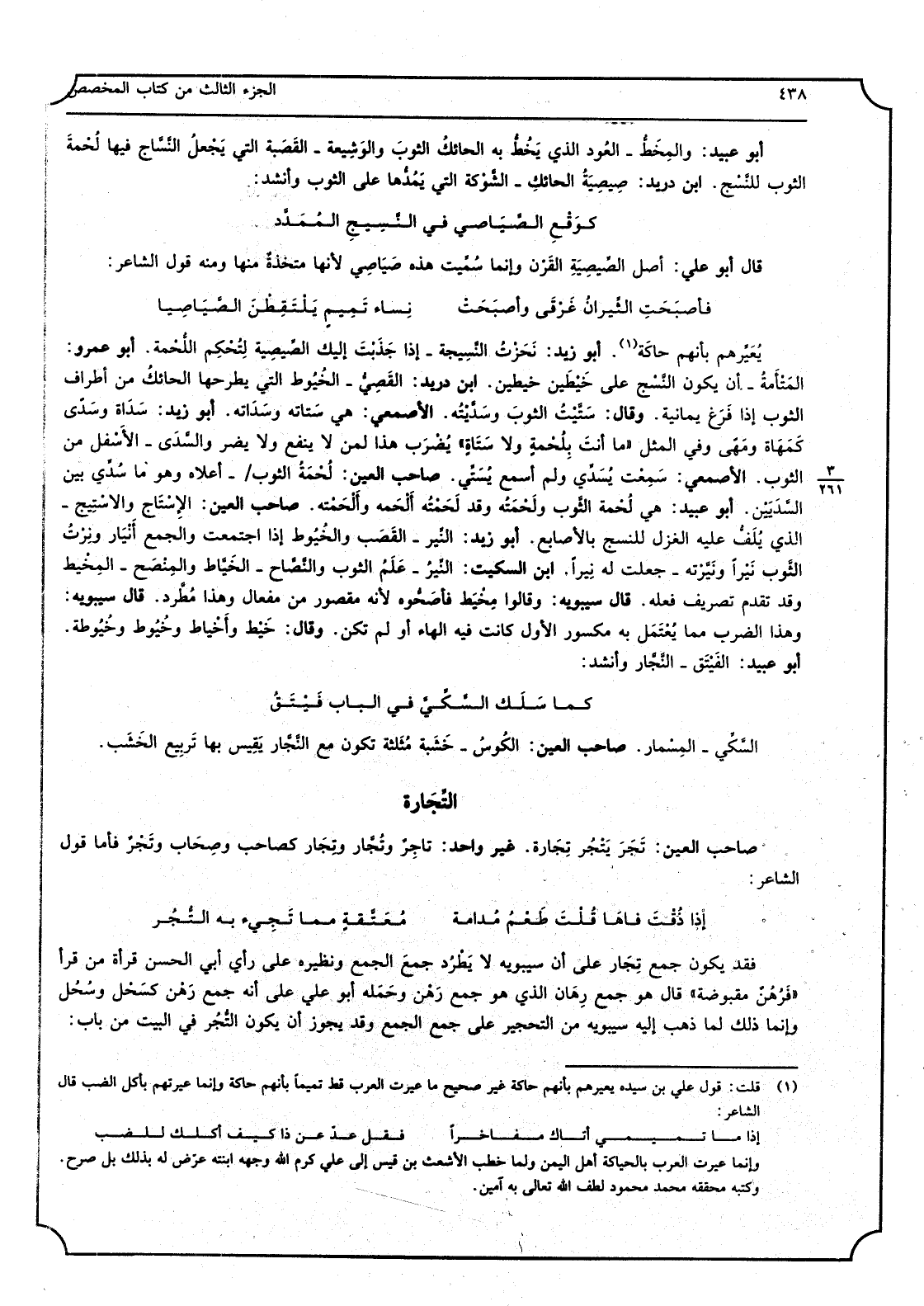 أَبُو عبيد: والمِخَطّ - الْعود الَّذِي يخطّ بِهِ الحائك الثَّوْب والوشيعة - القصبة الَّتِي يَجْعَل النّسّاج فِيهَا لُحمة الثَّوْب للنسج. ابْن دُرَيْد: صيصيَة الحائك - الشّوكة الَّتِي يمدّها على الثَّوْب وَأنْشد: كوقع الصّياصي فِي النسيج الممدّد قَالَ أَبُو عَليّ: أصل الصّيصية القرْن وَإِنَّمَا سمّيت هَذِه صَياصي لِأَنَّهَا متخذة مِنْهَا وَمِنْه قَول الشَّاعِر: فأصبحتِ الثّيران غرْقى وأصبحت نِساء تَمِيم يلتقِطْن الصّياصيا يعيّرِهم بِأَنَّهُم حاكَة. أَبُو زيد: نحزْت النّسيجة - إِذا جذَبْت إِلَيْك الصّيصية لتُحكِم اللُحْمة. أَبُو عَمْرو: المتأمة - أَن يكون النّسْج على خيْطين خيطين. ابْن دُرَيْد: القصيّ - الخيوط الَّتِي يَطْرَحهَا الحائك من أَطْرَاف الثَّوْب إِذا فرغ يَمَانِية. وَقَالَ: ستّيت الثوبَ وسدّيته. الْأَصْمَعِي: هِيَ سَتاته وسَداته. أَبُو زيد: سَداة وسَدًى كمَهاة ومهًى وَفِي الْمثل) مَا أَنْت بلُحمة وَلَا سَتاة (يُضرب هَذَا لمن لَا ينفع وَلَا يضر والسّدى - الْأَسْفَل من الثَّوْب. الْأَصْمَعِي: سمعْت يُسَدّي وَلم أسمع يُستّي. صَاحب الْعين: لُحمة الثَّوْب - أَعْلَاهُ وَهُوَ مَا سُدّي بَين السّدَيين. أَبُو عبيد: هِيَ لُحمة الثّوب ولحْمَته وَقد لحَمْته ألحَمه وألحمْته. صَاحب الْعين: الإسْتاج والإستيج - الَّذِي يُلَفّ عَلَيْهِ الْغَزل للنسج بالأصابع. أَبُو زيد: النّير - القصَب والخيوط إِذا اجْتمعت وَالْجمع أنْيار ونِرْت الثّوب نيْراً ونيّرته - جعلت لَهُ نِيراً. ابْن السّكيت: النّير - علَم الثَّوْب والنّصّاح - الخيّاط والمِنصَح - المِخْيط وَقد تقدم تصريف فعله. قَالَ سِيبَوَيْهٍ: وَقَالُوا مِخيَط فأصحّوه لِأَنَّهُ مَقْصُور من مفعال وَهَذَا مطّرد. قَالَ سِيبَوَيْهٍ: وَهَذَا الضَّرْب مِمَّا يفعتمَل بِهِ مكسور الأول كَانَت فِيهِ الْهَاء أَو لم تكن. وَقَالَ: خيط وأخياط وخُيوط وخُيوطة. أَبُو عبيد: الفَيْتَق - النّجّار وَأنْشد: كَمَا سلك السّكّي فِي الْبَاب فيتَق السّكّي - المِسمار. صَاحب الْعين: الكُوس - خَشَبَة مُثَلّثَة تكون مَعَ النّجار يقيس بهَا تربيع الْخشب.