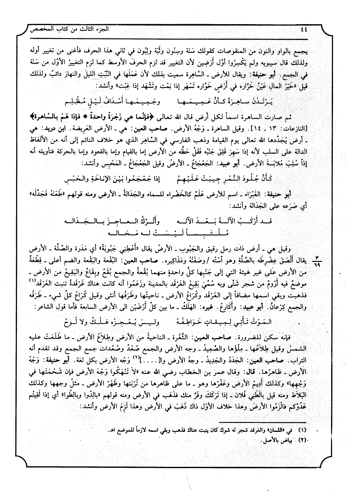 يجمع بِالْوَاو وَالنُّون من المنقوصات كَقَوْلِك سنة وسنون وثبة وثبون فِي ثَانِي هَذَا الْحَرْف فأغثى من تَغْيِير أَوله وَلذَلِك قَالَ سِيبَوَيْهٍ وَلم يكسروا أَو لأرضين لِأَن التَّغْيِير قد لزم الْحَرْف الْأَوْسَط كَمَا لزم التَّغْيِير الأول من سنة فِي الْجمع أَبُو حنيفَة وَيُقَال للْأَرْض - الساهرة سميت بذلك لِأَن عَملهَا فِي النبت اللَّيْل وَالنَّهَار دائب وَلذَلِك قيل: (خير المَال عين خراره فِي أَرض خواره تسهر إِذا نمت وَتشهد إِذا غبت) وَأنْشد: يرتدن ساهرة كَأَن عميمها وجميمها أسداف ليل مظلم ثمَّ صَارَت الساهرة أسما لكل أَرض قَالَ الله تَعَالَى: (فَإِنَّمَا هِيَ زَجْرَة وَاحِدَة فَإِذا هم بالساهرة) وَقيل الساهرة - وَجه الأَرْض صَاحب الْعين هِيَ - الأَرْض العريضة ابْن دُرَيْد هِيَ - أَرض يجددها الله تَعَالَى يَوْم الْقِيَامَة وَذهب الْفَارِسِي فِي الساهر الَّذِي هُوَ خلاف النَّائِم إِلَى أَنه من الالفاظ الدَّالَّة على السَّلب لِأَنَّهُ إِذا سهر قلق جنبه فَقل حَظه من الأَرْض إِمَّا بِالْقيامِ وَإِمَّا بالقعود وَإِمَّا بالحركة فتاويله أَنه إِذا سلب مُلَابسَة الأَرْض أَبُو عبيد الجعجاع - الأَرْض وَقيل الجعجاع - الْمحبس وَأنْشد: كَأَن جُلُود النمر جيبت عَلَيْهِم إِذا جعجعوا بَين الاناخة وَالْحَبْس أَبُو حنيفَة الغبراء - اسْم للْأَرْض علم كالخضراء للسماء والجدالة - الأَرْض وَمِنْه قَوْلهم (طعنه فجدله) أَي صرعه على الجدالة وَأنْشد: قد أركب الْآلَة بعد الْآلَة وأترك الْعَاجِز بالجدالة ملتبسا لَيست لَهُ محاله وَقيل هِيَ - أَرض ذَات رمل رَقِيق والجبوب - الأَرْض يُقَال (أَعْطِنِي جبوبة) أَي مدرو والصلة - الأَرْض يُقَال ألصق عضرطه بالصلة وَهُوَ ىسته وصفنه ومذاكيره صَاحب الْعين الْبقْعَة والبقعة وَالضَّم أَعلَى - قِطْعَة من الأَرْض على غير هَيْئَة الَّتِي إِلَى جنبها كل وَاحِدَة مِنْهُمَا بقْعَة وَالْجمع بقع وبقاع وَالْبَقِيع من الأَرْض - مَوضِع فِيهِ آروم من شجر شَتَّى وَبِه سمي بَقِيع الْغَرْقَد بِالْمَدِينَةِ وَزَعَمُوا أَنه كَانَت هُنَاكَ غرقدة تنْبت الْغَرْقَد فَذَهَبت وَبَقِي اسْمهَا مُضَافا إِلَى الْغَرْقَد وكراع الأَرْض - ناحيتها وطرفها أُنْثَى وَقيل كرَاع كل شَيْء - طرفه وَالْجمع كرعان أَبُو عبيد وأكارع غَيره الهلك - مَا بَين كل أَرضين إِلَى الأَرْض السَّابِعَة فَأَما قَول الشَّاعِر: الْمَوْت تَأتي لميقات خواطفه وَلَيْسَ يعجزه هلك وَلَا لوح فَإِنَّهُ سكن للضَّرُورَة صَاحب الْعين الثغرة - النَّاحِيَة من الأَرْض وطلاع الأَرْض - مَا طلعت عَلَيْهِ الشَّمْس وَقيل طلاعها - ملؤُهَا والصعيد - وَجه الأَرْض وَالْجمع صعد وصعدات جمع الْجمع وَقد تقدم أَنه التُّرَاب صَاحب الْعين الجدد والجديد - وَجه الأَرْض وَجه الأَرْض بِكُل لُغَة أَبُو حنيفَة وَجه الأَرْض - ظَاهرهَا قَالَ وَقَالَ عمر بن الْخطاب رَضِي الله عَنهُ: (لَا تنهكوا وَجه الأَرْض فَإِن شحمتها فِي وَجههَا) وَكَذَلِكَ أَدِيم الأَرْض وعفرها وَهُوَ - مَا على ظَاهرهَا من تربَتهَا وَظهر الأَرْض - مثل وَجههَا وَكَذَلِكَ البلاط وَمِنْه قيل بالطني فلَان - إِذا تَركك وفر مِنْك فَذهب فِي الأَرْض وَمِنْه قَوْلهم (بالدوا وبالطوا) أَي إِذا لَقِيتُم عَدوكُمْ فالزموا الأَرْض وَهَذَا خلاف الأول ذَاك ذهب فِي الأَرْض وَهَذَا لزم الأَرْض وَأنْشد:
