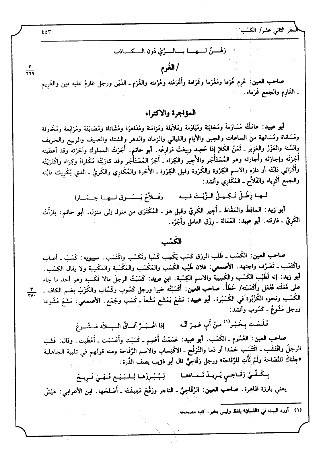 أَبُو عبيد: عاملْته مساوَعة ومُحايَنة ومياوَمة وملايلة ومُزامنة ومُداهرَة ومشاتاة ومُصايفة ومُرابَعة ومخارفة ومُساناة ومسانهة من السَّاعَات والحين وَالْأَيَّام والليالي وَالزَّمَان والدهر والشتاء والصيف وَالربيع والخريف والسَّنة والعزْرُ والعَزير - ثمن الْكلأ إِذا حُصِد وبيعَت مزارِعه. أَبُو حَاتِم: أجَرْت الْمَمْلُوك وآجرْته وَقد أَعْطيته أجرَته وإجارتَه وأجارته وَهُوَ المستأجَر والأجير والكِراء - أجْر المستأجَر وَقد كارَيته مُكاراة وكِراء واكتريته وأكراني دابّته أَو دَاره وَالِاسْم الكِرْوة والكُرْوة وَقيل الكِرْوة - الْأُجْرَة والمُكاري والكَريّ - الَّذِي يُكريك دابّته وَالْجمع أكرياء والفلاّح - المُكاري وَأنْشد: لَهَا رِطل تكيل الزّيتَ فِيهِ وفلاّح يَسُوق لَهَا حِمارا أَبُو زيد: الماقِط والمقّاط - أجِير الكَريّ وَقيل هُوَ - المُكترَى من منزل إِلَى منزل. أَبُو حَاتِم: بارأت الكريّ - فارقته. أَبُو عبيد: العُمالة - رِزْق الْعَامِل وأجرُه.