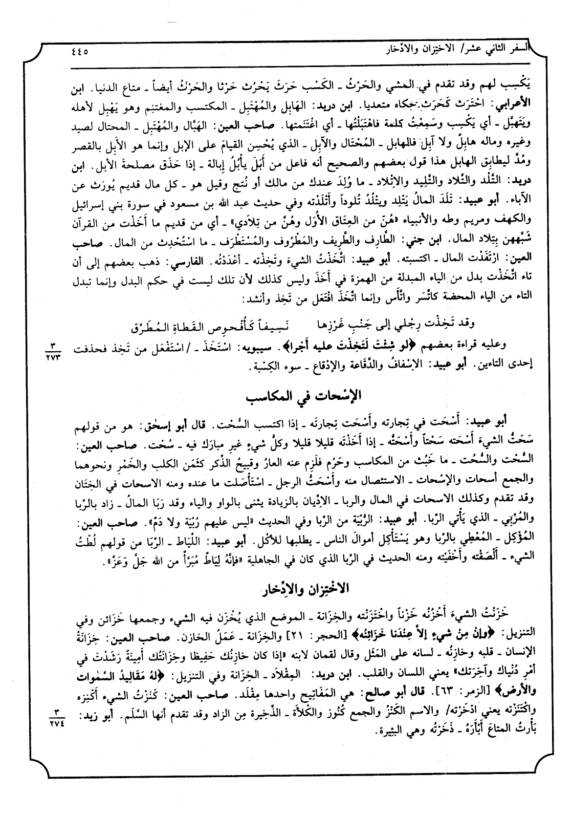 يكسِب لَهُم وَقد تقدم فِي الْمَشْي والحرْث - الكسْب حرثَ يحرُث حرْثاً والحرْث أَيْضا - مَتَاع الدُّنْيَا. ابْن الْأَعرَابِي: احترث كحرَث حَكَاهُ مُتَعَدِّيا. ابْن دُرَيْد: الهابِل والمهتَبِل - المكتسب والمغتنِم وَهُوَ يهْبِل لأَهله ويتهبّل - أَي يكسِب وسمعْت كلمة فاهتبلْتها - أَي اغتنمتها. صَاحب الْعين: الهبّال والمهتبِل - الْمُحْتَال لصيد وَغَيره وَمَا لَهُ هابِل وَلَا آبِل فالهابل - الْمُحْتَال والآبِل - الَّذِي يُحسن الْقيام على الْإِبِل وَإِنَّمَا هُوَ الأبِل بِالْقصرِ ومُدّ ليطابق الهابل هَذَا قَول بَعضهم وَالصَّحِيح أَنه فَاعل من أبَل يأبُل إبالة - إِذا حذَق مصلحَة الْإِبِل. ابْن دُرَيْد: التّلْد والتِلاد والتّليد والاتّلاد - مَا وُلِد عنْدك من مَالك أَو نُتج وَقيل هُوَ - كل مَال قديم يورَث عَن الْآبَاء. أَبُو عبيد: تلَد المالُ يتْلِد ويتْلُد تُلوداً وأتلَدْته وَفِي حَدِيث عبد الله بن مَسْعُود فِي سُورَة بني إِسْرَائِيل والكهف وَمَرْيَم وطه والأنبياء) هنّ من العِتاق الأُوَل وهنّ من تِلادي (- أَي من قديم مَا أخذْت من الْقُرْآن شبّهن بتِلاد المَال. ابْن جني: الطّارِف والطّريف والمطروف والمستَطْرَف - مَا استحدث من المَال. صَاحب الْعين: ارتَفَدْت المَال - اكتسبته. أَبُو عبيد: اتّخذْت الشيءَ وتخِذته - أعددته. الْفَارِسِي: ذهب بَعضهم إِلَى أَن تَاء اتّخَذْت بدل من الْيَاء المبدلة من الْهمزَة فِي أَخذ وَلَيْسَ كَذَلِك لِأَن تِلْكَ لَيست فِي حكم الْبَدَل وَإِنَّمَا تبدل التَّاء من الْيَاء الْمَحْضَة كاتّسر واتّأس وَإِنَّمَا اتّخذ افتَعل من تخِذ وَأنْشد: وَقد تخِذْت رِجلي إِلَى جنبِ غرْزِها نسيفاً كأُفحوصِ القَطاةِ المُطرِّق وَعَلِيهِ قِرَاءَة بَعضهم) لَو شِئتَ لتخذْت عَلَيْهِ أجرا (. سِيبَوَيْهٍ: استخذَ - استفعَل من تخِذ فحذفت إِحْدَى التَّاءَيْنِ. أَبُو عبيد: الإسفاف والدّقاعة والإدْقاع - سوء المكسبة.