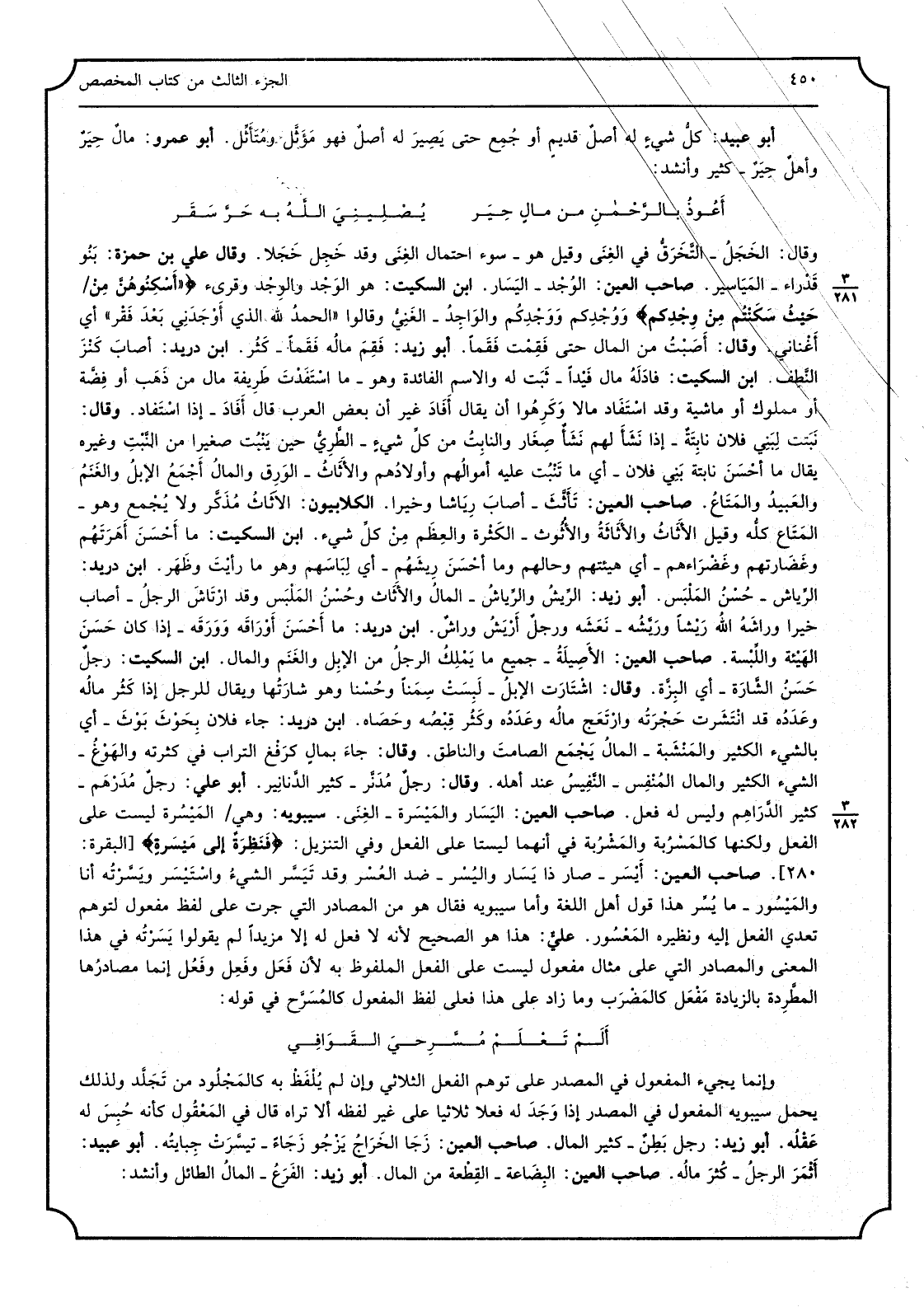 أَبُو عبيد: كل شَيْء لَهُ أصلٌ قديم أَو جُمِع حَتَّى يَصير لَهُ أصل فَهُوَ مؤثّل ومتأثّل. أَبُو عَمْرو: مَال حِيَر وَأهل حيَر - كثير وَأنْشد: أعوذ بالرّحمن من مالٍ حِيَر يُصليني اللهُ بِهِ حرّ سَقَر وَقَالَ: الخجَل - التّخرّق فِي الغِنى وَقيل هُوَ - سوء احْتِمَال الغِنى وَقد خجِل خجَلاً. وَقَالَ عَليّ بن حَمْزَة: بَنو قَدْراء - المَياسير. صَاحب الْعين: الوُجْد - اليَسار. ابْن السّكيت: هُوَ الوجْد والوِجْد وَقُرِئَ) أسكِنوهنّ من حيثُ سكنْتم من وِجْدِكم ووُجدِكم ووَجْدِكم (والواجد - الْغَنِيّ وَقَالُوا الْحَمد لله الَّذِي أوجدَني بعدَ فقْر أَي أغناني. وَقَالَ: أصبْت من المَال حَتَّى فقِمْت فَقَماً. أَبُو زيد: فقِم مالُه فقَماً - كثُر. ابْن دُرَيْد: أصَاب كنْزَ النّطِف. ابْن السّكيت: فادَلَه مَال فَيْداً - ثَبت لَهُ وَالِاسْم الْفَائِدَة وَهُوَ - مَا استفدْتَ طَريفة مَال من ذهَب أَو فضّة أَو مَمْلُوك أَو مَاشِيَة وَقد اسْتَفَادَ مَالا وكرِهوا أَن يُقَال أفادَ غير أَن بعض الْعَرَب قَالَ أَفَادَ - إِذا اسْتَفَادَ. وَقَالَ: نبَتت لبَني فلَان نابِتة - إِذا نَشأ لَهُم نشأٌ صِغار والنابِت من كل شَيْء - الطّريّ حِين ينبُت صَغِيرا من النّبْت وَغَيره يُقَال مَا أحسَن نابتة بَني فلَان - أَي مَا تنْبُت عَلَيْهِ أموالُهم وأولادُهم والأثاث - الوَرِق والمالُ أجمَع الإبلُ والغنمُ وَالْعَبِيد وَالْمَتَاع. صَاحب الْعين: تأثّث - أصَاب رِياشاً وَخيرا. الكلابيون: الأثاث مذكّر وَلَا يُجمع وَهُوَ - الْمَتَاع كلّه وَقيل الأثاث والأثاثة والأثوث - الكثْرة والعِظَم من كل شَيْء. ابْن السّكيت: مَا أحْسَن أهرَتَهُم وغَضارتهم وغضْراءهم - أَي هيئتهم وحالهم وَمَا أحسَن ريشَهُم - أَي لِباسَهم وَهُوَ مَا رأيْت وَظهر. ابْن دُرَيْد: الرِّياش - حُسْن المَلْبَس. أَبُو زيد: الريش والرِياش - المَال والأثاث وحُسْن الملْبَس وَقد ارْتاش الرجل - أصَاب خيرا وراشَه الله رَيْشاً وريّشُه - نعشَه وَرجل أرْيَش وراش. ابْن دُرَيْد: مَا أحسنَ أوراقه وورَقَه - إِذا كَانَ حسن الْهَيْئَة واللِّبْسة. صَاحب الْعين: الأصيلة - جَمِيع مَا يملِك الرجل من الْإِبِل والغنَم وَالْمَال. ابْن السّكيت: رجل حسن الشّارة - أَي البِزّة. وَقَالَ: اشْتارَت الْإِبِل - لبِسَت سِمَناً وحُسْناً وَهُوَ شارَتُها وَيُقَال للرجل إِذا كثر مَاله وعدده قد انتشرت حجرَته وارتعج مالُه وعدده وكثُر قبْصُه وحَصاه. ابْن دُرَيْد: جَاءَ فلَان بِحَوْث بَوث - أَي بالشَّيْء الْكثير والمنْشَبة - المَال يجمَع الصَّامِت والناطق. وَقَالَ: جَاءَ بِمَال كرفْغ التُّرَاب فِي كثرته والهَوْغ - الشَّيْء الْكثير وَالْمَال المنْفِس - النّفيس عِنْد أَهله. وَقَالَ: رجل مدَثّر - كثير الدَّنَانِير. أَبُو عَليّ: رجل مدَرْهَم - كثير الدّراهم وَلَيْسَ لَهُ فعل. صَاحب الْعين: اليَسار والميْسَرة - الغِنى. سِيبَوَيْهٍ: وَهِي الميسرة لَيست على الْفِعْل وَلكنهَا كالمَسْرُبة والمشرَبة فِي أَنَّهُمَا ليستا على الْفِعْل وَفِي التَّنْزِيل) فنَظِرة إِلَى ميسُرة (. صَاحب الْعين: أيسَر - صَار ذَا يَسار واليُسْر - ضد العُسْر وَقد تيسّر الشيءُ واستيْسَر ويسّرته أَنا والميسور - مَا يُسّر هَذَا قَول أهل اللُّغَة وَأما سِيبَوَيْهٍ فَقَالَ هُوَ من المصادر الَّتِي جرت على لفظ مفعول لتوهم تعدِي الْفِعْل إِلَيْهِ وَنَظِيره المَعْسور. عليّ: هَذَا هُوَ الصَّحِيح لِأَنَّهُ لَا فعل لَهُ إِلَّا مزيداً لم يَقُولُوا يسَرْته فِي هَذَا الْمَعْنى والمصادر الَّتِي على مِثَال مفعول لَيست على الْفِعْل الملفوظ بِهِ لِأَن فعَل وفعِل وفعُل إِنَّمَا مصادرُها المطّردة بِالزِّيَادَةِ مَفْعَل كالمَضْرَب وَمَا زَاد على هَذَا فعلى لفظ الْمَفْعُول كالمُسرَّح فِي قَوْله: ألم تعْلَمْ مُسرّحي القَوافي وَإِنَّمَا يَجِيء الْمَفْعُول فِي الْمصدر على توهّم الْفِعْل الثلاثي وَإِن لم يُلْفَظ بِهِ كالمَجْلود من تج
