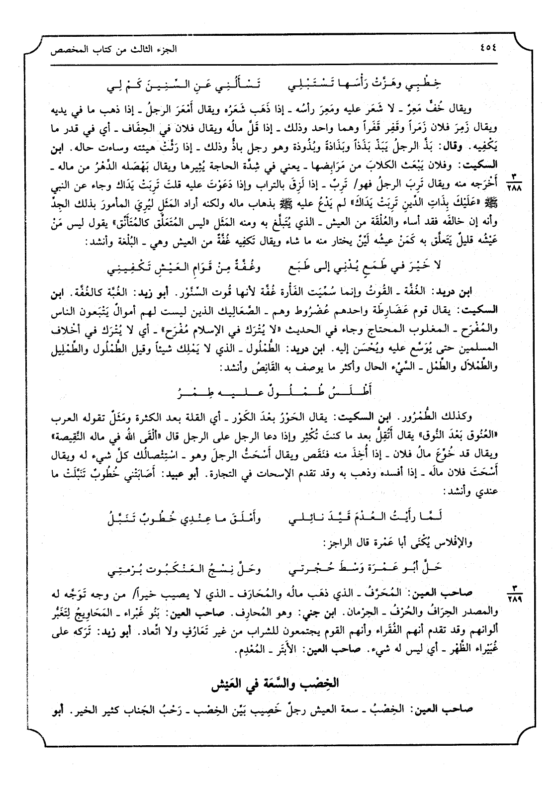 خِطبي وهزّت رأسَها تستبلي تَسْأَلنِي عَن السّنين كم لي وَيُقَال خُفّ معِر - لَا شعر عَلَيْهِ ومعِر رأسُه - إِذا ذهب شعره وَيُقَال أمْعَر الرجل - إِذا ذهب مَا فِي يَدَيْهِ وَيُقَال زمِر فلَان زمَراً وقَفِر قَفَراً وهما وَاحِد وَذَلِكَ - إِذا قلّ مالُه وَيُقَال فلَان فِي الحِفاف - أَي فِي قدر مَا يَكْفِيهِ. وَقَالَ: بذّ الرجل يبَذّ بذَذاً وبَذاذة وبُذوذة وَهُوَ رجل باذّ وَذَلِكَ - إِذا رثّت هَيئته وَسَاءَتْ حَاله. ابْن السّكيت: وَفُلَان يبعَث الكلابَ من مرابضها - يَعْنِي فِي شدّة الْحَاجة يُثيرها وَيُقَال بهْصَله الدّهر من مَاله - أخرجه مِنْهُ وَيُقَال ترِب الرجل فَهُوَ ترِب - إِذا لزِق بِالتُّرَابِ وَإِذا دعوْت عَلَيْهِ قلت ترِبَتْ يداك وَجَاء عَن النَّبِي صلى الله عَلَيْهِ وَسلم) عَلَيْك بذاتِ الدِّين ترِبَتْ يَداك (لم يدْع عَلَيْهِ صلى الله عَلَيْهِ وَسلم بذهاب مَاله وَلكنه أَرَادَ المثَل ليُرى المآمورَ بذلك الجِدّ وَأَنه إِن خَالفه فقد أَسَاءَ والعُلْقَة من الْعَيْش - الَّذِي يُتبلّغ بِهِ وَمِنْه المثَل) لَيْسَ المتعلّق كالمتأنّق (يَقُول لَيْسَ مَنْ عيشُه قَلِيل يتعلّق بِهِ كمَن عيشُه ليّن يخْتَار مِنْهُ مَا شَاءَ وَيُقَال تكفيه غُفّة من الْعَيْش وَهِي - البُلْغة وَأنْشد: لَا خير فِي طمع يُدني إِلَى طبَع وغُفّة من قَوام الْعَيْش تكفيني ابْن دُرَيْد: الغُفّة - الْقُوت وَإِنَّمَا سمّيت الْفَأْرَة غُفّة لِأَنَّهَا قوت السِّنّور. أَبُو زيد: الغُبّة كالغفّة. ابْن السّكيت: يُقَال قوم عضارِطة واحدهم عُضْروط وهم - الصّعاليك الَّذين لَيست لَهُم أَمْوَال يتبَعون النَّاس والمُفْرَح - المغلوب الْمُحْتَاج وَجَاء فِي الحَدِيث) لَا يُترَك فِي الْإِسْلَام مُفرَح (- أَي لَا يترَك فِي أخلاف الْمُسلمين حَتَّى يوسّع عَلَيْهِ ويُحسَن إِلَيْهِ. ابْن دُرَيْد: الطُّمْلول - الَّذِي لَا يملك شَيْئا وَقيل الطّملول والطِمليل والطِملال والطِّمْل - السَّيئ الْحَال وَأكْثر مَا يُوصف بِهِ القانِص وَأنْشد: أطلَسُ طُملول عَلَيْهِ طِمْر وَكَذَلِكَ الطُمْرور. ابْن السّكيت: يُقَال الحَوْر بعدَ الكَوْر - أَي الْقلَّة بعد الْكَثْرَة ومثَل تَقوله الْعَرَب) العُتوق بعدَ النّوق (يُقَال أتقِلّ بَعْدَمَا كَانَت تكْثر وَإِذا دَعَا الرجل على الرِّجَال قَالَ ألْقى الله فِي مَاله النّقيصة وَيُقَال قد خُوّع مَال فلَان - إِذا أخِذ مِنْهُ فنقص وَيُقَال أسْحَتّ الرجل وَهُوَ - استئصالُك كل شَيْء لَهُ وَيُقَال أسْحَتَ فلَان مَاله - إِذا أفْسدهُ وَذهب بِهِ وَقد تقدم الإسحات فِي التِّجَارَة. أَبُو عبيد: أصابتْني خُطوب تنبّلتْ مَا عِنْدِي وَأنْشد: لمّا رَأَيْت العُدْمَ قيّد نائلي وأملَقَ مَا عِندي خُطوب تنبّل والإفلاس يُكْنى أَبَا عمْرة قَالَ الراجز: حلّ أَبُو عَمرة وسْط حجْرتي وحلّ نِسجُ العنكبوت برمتي صَاحب الْعين: المحرَّف - الَّذِي ذهب مالُه والمُحارَف - الَّذِي لَا يُصِيب خيرا من وَجه توجّه لَهُ والمصدر الحِراف والحُرْف - الحِرمان. ابْن جني: وَهُوَ المُحارِف. صَاحب الْعين: بَنو غَبْراء - المحاويج لتغبّر ألوانهم وَقد تقدم أَنهم الفُقَراء وَأَنَّهُمْ الْقَوْم يَجْتَمعُونَ للشراب من غير تعارف وَلَا اتّعاد. أَبُو زيد: تَركه على غُبَيْراء الظّهر - أَي لَيْسَ لَهُ شَيْء. صَاحب الْعين: الأبْتَر - المعدِم.
