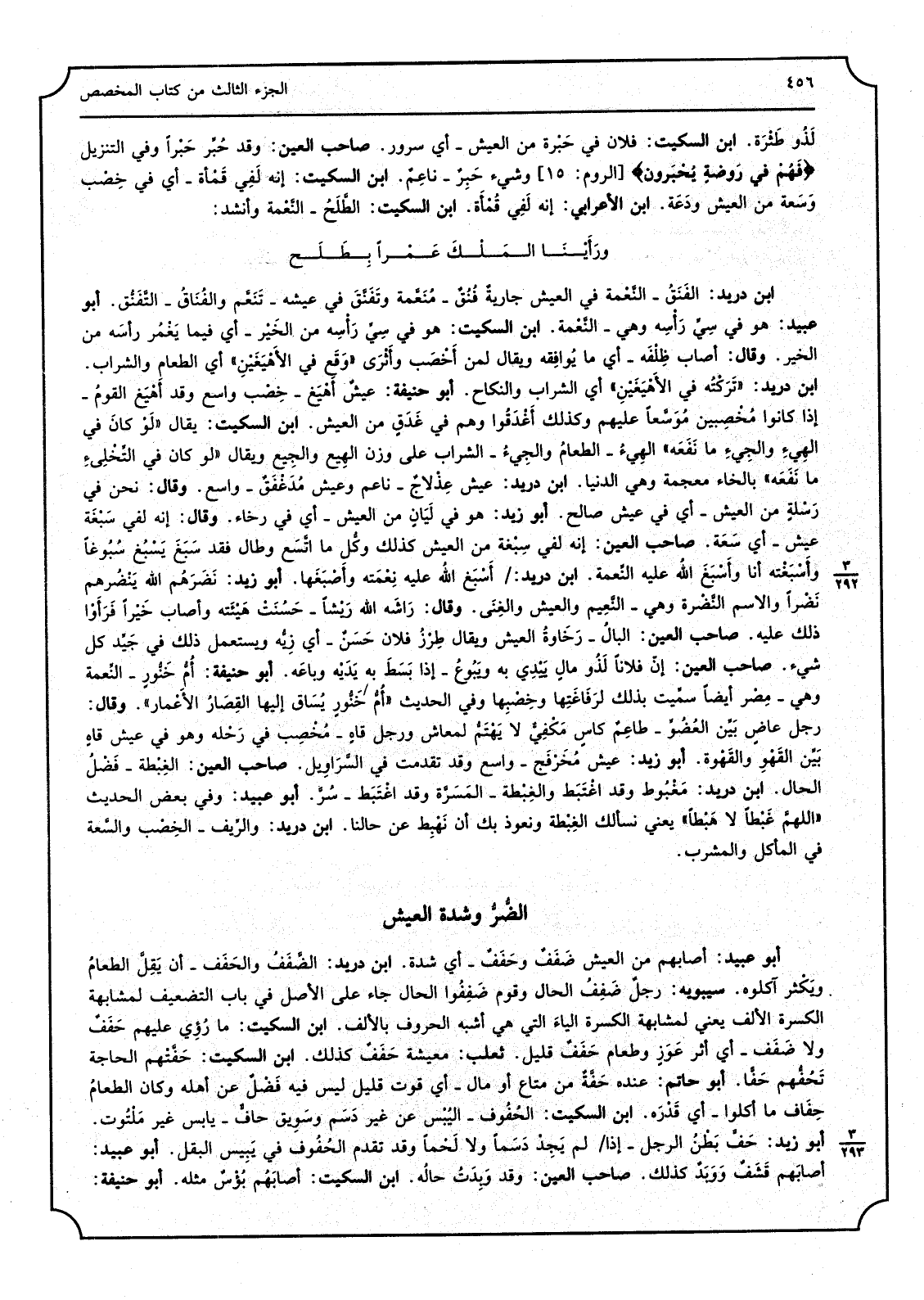 لَذو طَثْرة. ابْن السّكيت: فلَان فِي حبرَة فِي الْعَيْش - أَي سرُور. صَاحب الْعين: وَقد حُبِر حبْراً وَفِي التَّنْزِيل) فهُم فِي رَوْضَة يُحْبَرون (وَشَيْء حبِر - ناعم. ابْن السّكيت: إِنَّه لَفي قمْأة - أَي فِي خِصب وسَعة من الْعَيْش ودَعَة. ابْن الْأَعرَابِي: إِنَّه لفي قُمْأة. ابْن السّكيت: الطّلَح - النِّعْمَة وَأنْشد: ورأينا الملْك عَمْراً بطَلَح ابْن دُرَيْد: الفنَق - النّعْمة فِي الْعَيْش جَارِيَة فُنُق - منعّمة وتفنّق فِي عيشه - تنعّم والفُناق - التفنّق. أَبُو عبيد: هُوَ فِي سِيّ رَأسه وَهِي - النّعمة. ابْن السّكيت: هُوَ فِي سيّ رَأسه من الخيْر - أَي فِيمَا يغمُر رأسَه من الْخَيْر. وَقَالَ: أصَاب ظِلْفَه - أَي مَا يُوَافقهُ وَيُقَال لمن أخصب وأثرى وَقع فِي الأهيَغيْن أَي الطَّعَام وَالشرَاب. ابْن دُرَيْد: تركته فِي الأهيغَيْن أَي الشَّرَاب وَالنِّكَاح. أَبُو حنيفَة: عَيْش أهيَغ - خِصْب وَاسع وَقد أهْيَغ الْقَوْم - إِذا كَانُوا مُخصِبين موسّعاً عَلَيْهِم وَكَذَلِكَ أغدَقوا وهم فِي غدَق من الْعَيْش. ابْن السّكيت: يُقَال لَو كَانَ فِي الهِيء والجِيء مَا نَفعه الهيء - الطَّعَام والجيءُ - الشَّرَاب على وزن الهيع والجيع وَيُقَال لَو كَانَ فِي التِخْلِئِ مَا نَفعه بِالْخَاءِ مُعْجمَة وَهِي الدُّنْيَا. ابْن دُرَيْد: عَيْش عِذْلاج - ناعم وعيش مُدَغْفَق - وَاسع. وَقَالَ: نَحْو فِي رَسْلة من الْعَيْش - أَي فِي عَيْش صَالح. أَبُو زيد: هُوَ فِي لَيان من الْعَيْش - أَي فِي رخاء. وَقَالَ: إِنَّه لفي سَبْغة عَيْش - أَي سَعَة. صَاحب الْعين: إِنَّه لفي سِبْغة من الْعَيْش كَذَلِك وكلّ مَا اتّسع وَطَالَ فقد سبَغ يسبُغ سُبوغاً وأسبغْته أَنا وأسبَغ الله عَلَيْهِ النِّعْمَة. ابْن دُرَيْد: أَسْبغ الله عَلَيْهِ نعمتَه وأصبغَها. أَبُو زيد: نضرَهم الله ينضُرهم نضْراً وَالِاسْم النّضْرة وَهِي - النّعيم والعيش والغِنى. وَقَالَ: راشَه الله رَيْشاً - حسُنَت هَيئته وَأصَاب خيرا فَرَأَوْا ذَلِك عَلَيْهِ. صَاحب الْعين: البال - رخاوة الْعَيْش وَيُقَال طِرْز فلَان حسن - أَي زِيّه وَيسْتَعْمل ذَلِك فِي جيّد كل شَيْء. صَاحب الْعين: إِن فلَانا لَذو مالٍ يَيْدي بِهِ ويَبوع - إِذا بسط بِهِ يَدَيْهِ وباعَه. أَبُو حنيفَة: أمّ خَنّور - النِّعْمَة وَهِي - مِصر أَيْضا سمّيت بذلك لرفاغَتِها وخِصبها وَفِي الحَدِيث) أم خَنّور يُساق إِلَيْهَا القِصار الْأَعْمَار (. وَقَالَ: رجل عاضٍ بيّن العُضُوّ - طاعم كاسٍ مكْفيّ لَا يهتمّ لِمَعَاش وَرجل قاهٍ - مُخصِب فِي رحْله وَهُوَ فِي عَيْش قاهٍ بيّن القَهْو والقهوة. أَبُو زيد: عَيْش مخرْفَج - وَاسع وَقد تقدّمت فِي السّراويل. صَاحب الْعين: الغِبْطة - فضْل الْحَال. ابْن دُرَيْد: مَغْبوط وَقد اغتبَطَ والغِبطة - المسرّة وَقد اغتبط - سفرّ. أَبُو عبيد: وَفِي بعض الحَدِيث) اللهمّ غَبْطاً لَا هَبْطاً (يَعْنِي نَسْأَلك الغِبْطة ونعوذ بك أَن نهبِط عَن حَالنَا. ابْن دُرَيْد: والرّيف - الخصْب والسّعة فِي المأكل وَالْمشْرَب.