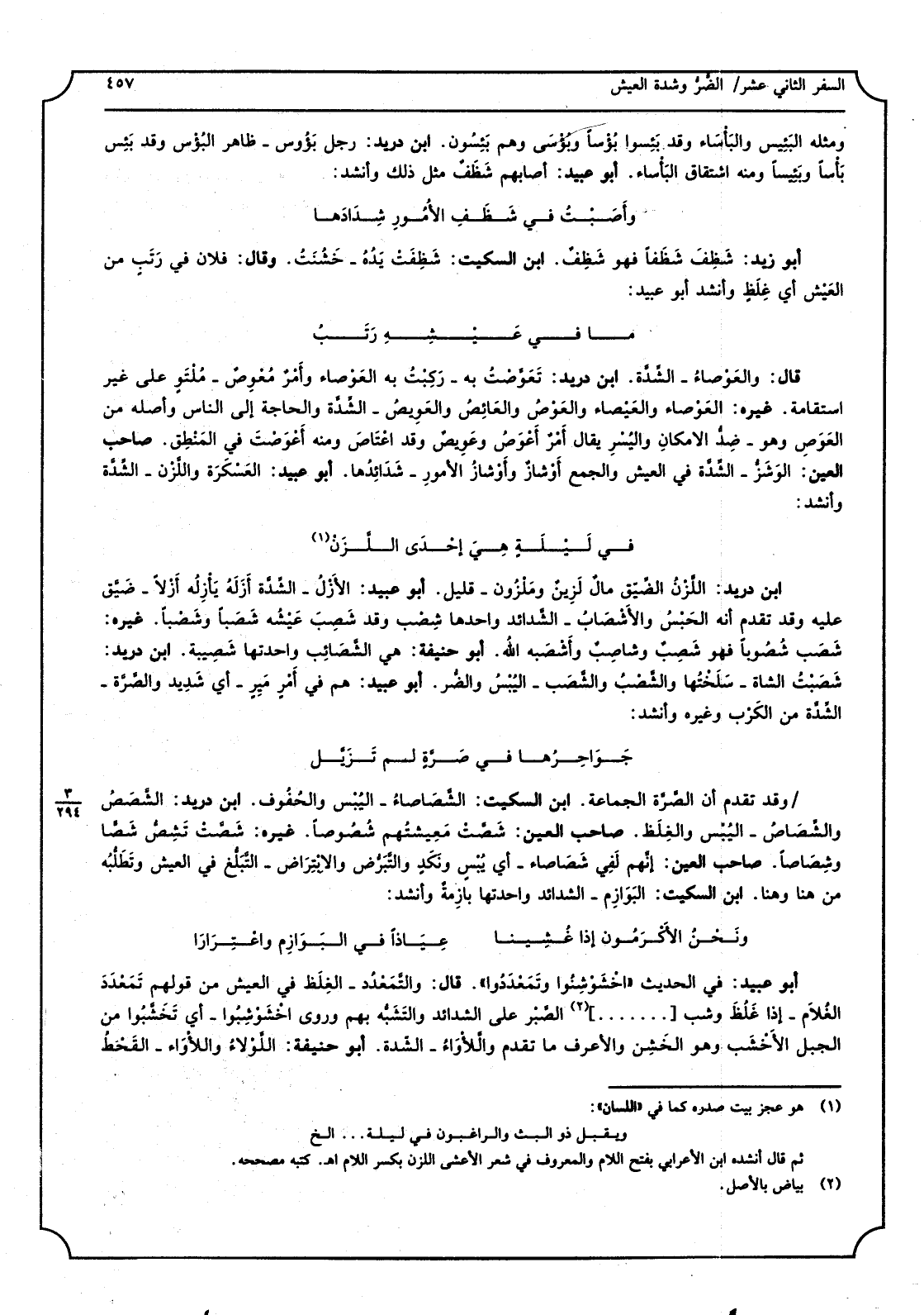 وَمثله البَئيس والبأساء وَقد بئسوا بؤساً وبؤسى وهم بئسون. ابْن دُرَيْد: رجل بَؤوس - ظَاهر الْبُؤْس وَقد بَئس بَأْسا وبئيساً وَمِنْه اشتقاق البأساء. أَبُو عبيد: أَصَابَهُم شظَف مثل ذَلِك وَأنْشد: وأصبْت فِي شظَف الْأُمُور شِدادَها أَبُو زيد: شظِف شظَفاً فَهُوَ شظِف. ابْن السّكيت: شظِفَتْ يدُه - خشُنَت. وَقَالَ: فلَان فِي رتب من الْعَيْش أَي غلظ وَأنْشد أَبُو عبيد: مَا فِي عيشِه رَتَبُ قَالَ: والعوْصاء - الشدَّة. ابْن دُرَيْد: تعوّصْت بِهِ - ركبْت بِهِ العوْصاء وَأمر مُعوِص - ملتوٍ على غير استقامة. غَيره: العَوْصاء والعَيْصاء والعوْص والعائِص والعَويص - الشدَّة وَالْحَاجة إِلَى النَّاس وَأَصله من العوَص وَهُوَ - ضد الْإِمْكَان واليُسْر يُقَال أَمر أعوَص وعَويص وَقد اعتاص وَمِنْه أعوصْت فِي الْمنطق. صَاحب الْعين: الوشَز - الشدّة فِي الْعَيْش وَالْجمع أوشاز وأوشازُ الْأُمُور - شدائِدُها. أَبُو عبيد: العسْكرة واللّزْن - الشدَّة وَأنْشد: فِي لَيْلَة هِيَ إِحْدَى اللزَنْ ابْن دُرَيْد: اللّزْن الضّيق مَال لَزين ومَلزون - قَلِيل. أَبُو عبيد: الأزْل - الشدَّة أزَله يأزِله أزْلاً - ضيّق عَلَيْهِ وَقد تقدم أَنه الْحَبْس والأشصاب - الشدائد وَاحِدهَا شِصْب وَقد شصِب عيشُه شَصَباً وشصْباً. غَيره: شصَب شُصوباً فَهُوَ شَصِب وشاصب وأشصَبه الله. أَبُو حنيفَة: هِيَ الشّصائب واحدتها شَصيبة. ابْن دُرَيْد: شصَبْت الشَّاة - سلحْتُها والشّصْب والشصَب - اليُبْس والضُرّ. أَبُو عبيد: هم فِي أَمر ميَر - أَي شَدِيد والصّرّة - الشدَّة من الكرْب وَغَيره وَأنْشد: جواحِرُها فِي صَرّة لم تزَيّل وَقد تقدم أَن الصَّرّة الْجَمَاعَة. ابْن السّكيت: الشّصاصاء - اليُبْس والحُفوف. ابْن دُرَيْد: الشّصَص والشِصاص - اليُبس والغِلَظ. صَاحب الْعين: شصّت معيشتُهم شُصوصاً. غَيره: شصّت تشِصّ شصّاً وشِصاصاً. صَاحب الْعين: إِنَّهُم لفي شَصاصاء - أَي يُبْس ونكد والنّبَرُّض والابتِراض - التبلّغ فِي الْعَيْش وتطلّبه من هُنَا وَهنا. ابْن السّكيت: البَوازِم - الشدائد واحدتها بازِمة وَأنْشد: وَنحن الأكرمون إِذا غُشينا عِياذاً فِي البوازم واعتِرارا أَبُو عبيد: فِي الحَدِيث) اخشَوشِنوا وتمعْدَدوا (. قَالَ: والتمعدد - الغلظ فِي الْعَيْش من قَوْلهم تمعدَد الْغُلَام - إِذا غلظ وشب ... . الصَّبْر على الشدائد والتشبّه بهم وَرُوِيَ اخشَوشِبوا - أَي تخشّبوا من الْجَبَل الأخشَب وَهُوَ الخشِن والأعرف مَا تقدم واللأواء - الشدَّة. أَبُو حنيفَة: اللولاء واللأواء - القحْط