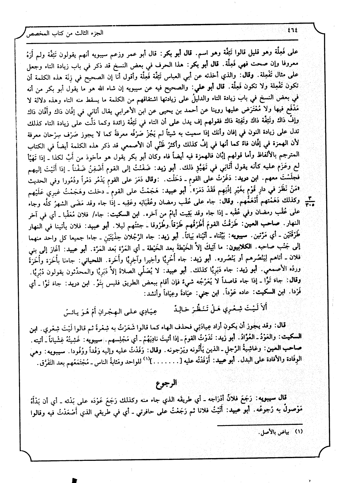 على فَعِلّة وَهُوَ قَلِيل قَالُوا تئفّة وَهُوَ اسْم. قَالَ أَبُو بكر: قَالَ أَبُو عمر وَزعم سِيبَوَيْهٍ أَنهم يَقُولُونَ تئفّة وَلم أرَه مَعْرُوفا وَإِن صحت فَهِيَ فعلّة. قَالَ أَبُو بكر: هَذَا الْحَرْف فِي بعض النّسخ قد ذكر فِي بَاب زِيَادَة التَّاء وَجعل عَليّ مِثَال تفْعِلة. قَالَ: وَالَّذِي أَخَذته عَن أبي الْعَبَّاس تئفّة فعِلّة وَأَقُول أَنا إِن الصَّحِيح فِي زِنة هَذِه الْكَلِمَة أَن تكون تفعِلة وَلَا تكون فعِلّة. قَالَ أَبُو عَليّ: وَالصَّحِيح فِيهِ عَن سِيبَوَيْهٍ إِن شَاءَ الله هُوَ مَا يَقُول أَبُو بكر من أَنه فِي بعض النّسخ فِي بَاب زِيَادَة التَّاء وَالدَّلِيل على زيادتها اشتقاقهم من الْكَلِمَة مَا يسْقط مِنْهُ التَّاء وَهَذِه دلَالَة لَا مَدفَع فِيهَا وَلَا معتَرَض عَلَيْهَا روينَا عَن أَحْمد بن يحيى عَن ابْن الْأَعرَابِي يُقَال أَتَانِي فِي إفّان ذَاك وأفّان ذَاك وإفِّ ذَاك وتئفّة ذَاك وتفِئة ذَاك فَقَوْلهم إف يدل على أَن التَّاء فِي تئفّة زَائِدَة وكما دلّت على زِيَادَة التَّاء كَذَلِك تدل على زِيَادَة النُّون فِي إفان وَأَنَّك إِذا سميت بِهِ شَيْئا لم يجُزْ صرْفُه معرفَة كَمَا لَا يجوز صَرْف سِرحان معرفَة لِأَن الْهمزَة فِي إفّان فَاء كَمَا أَنَّهَا إفّ كَذَلِك وَأكْثر ظَنِّي أَن الْأَصْمَعِي قد ذكر هَذِه الْكَلِمَة أَيْضا فِي الْكتاب المترجم بالألفاظ وَأما قَوْلهم إبّان فالهمزة فِيهِ أَيْضا فَاء وَكَانَ أَبُو بكر يَقُول هُوَ مَأْخُوذ من أبّ لكذا - إِذا تهيّأ لَهُ وعزَم عَلَيْهِ كَأَنَّهُ يَقُول أَتَانِي فِي تهيّؤ ذَلِك. أَبُو زيد: ضفَنْت إِلَى الْقَوْم أضفِن ضَفْناً - إِذا أتيتَ إِلَيْهِم فجلسْت مَعَهم. ابْن دُرَيْد: دغَرْت على الْقَوْم - دخلْت. وَقَالَ: دمَر على الْقَوْم يدمُر دمْراً ودُموراً وَفِي الحَدِيث) من نظر فِي دَار قوم بِغَيْر إذنِهم فقد دمَر (. أَبُو عبيد: هجمْت على الْقَوْم - دخلت وهجمْت غَيْرِي عَلَيْهِم وَكَذَلِكَ دهَمْته أدهَمفهم. وَقَالَ: جَاءَ على عُقب رَمَضَان وعُقْبانه وعقِبه ? ? إِذا جَاءَ وَقد مضى الشَّهْر كُله وَجَاء على عُقْب رَمَضَان وَفِي عُقْبه - إِذا جَاءَ وَقد بقيت أَيَّام من آخِره. ابْن السّكيت: جَاءَ فلَان معقّباً - أَي فِي آخر النَّهَار. صَاحب الْعين: طرقْت الْقَوْم أطرُقُهم طرْقاً وطُروقاً - جئتهم لَيْلًا. أَبُو عبيد: فلَان يأتينا فِي النَّهَار طرْقَتين - أَي مرّتين. سِيبَوَيْهٍ: بيّتناه - أتيناه بَياتاً. أَبُو زيد: جَاءَ الرّجلَانِ حِذْيَتَين - جَاءَا جَمِيعًا كل وَاحِد مِنْهُمَا إِلَى جنْب صَاحبه. الكلابيون: مَا آتِيك إِلَّا الخَيْطة بعد الخيْطة - أَي المرّة بعد المرّة. أَبُو عبيد: أغار إِلَى بني فلَان - أَتَاهُم لينصُرهم أَو ينصُروه. أَبُو زيد: جاءأُخْريّاً وأخيراً وآخرياً وأخَرة. اللحياني: جَاءَنَا بأُخَرة وأخَرَة ورده الْأَصْمَعِي. أَبُو زيد: جَاءَ دَبَريّاً كَذَلِك. أَبُو عبيد: لَا يصلّي الصَّلَاة إِلَّا دَبَريّاً والمحدّثون يَقُولُونَ دُبُريّاً. وَقَالَ: جَاءَ توّاً - إِذا جَاءَ قَاصِدا لَا يعرّجه شَيْء فَإِن أَقَامَ بِبَعْض الطَّرِيق فَلَيْسَ بتوّ. ابْن دُرَيْد: جَاءَ تواً - أَي فَردا. ابْن السّكيت: عَاده عَوْداً. ابْن جني: عَيادة وعِياداً وَأنْشد: د: أغار إِلَى بني فلَان - أَتَاهُم لينصُرهم أَو ينصُروه. أَبُو زيد: جاءأُخْريّاً وأخيراً وآخرياً وأخَرة. اللحياني: جَاءَنَا بأُخَرة وأخَرَة ورده الْأَصْمَعِي. أَبُو زيد: جَاءَ دَبَريّاً كَذَلِك. أَبُو عبيد: لَا يصلّي الصَّلَاة إِلَّا دَبَريّاً والمحدّثون يَقُولُونَ دُبُريّاً. وَقَالَ: جَاءَ توّاً - إِذا جَاءَ قَاصِدا لَا يعرّجه شَيْء فَإِن أَقَامَ بِبَعْض الطَّرِيق فَلَيْسَ بتوّ. ابْن دُرَيْد: جَاءَ تواً - أَي فَردا. ابْن السّكيت: عَاده عَوْداً. ابْن جني: عَيادة وعِياداً وَأنْشد: أَلا لَيْت شِعري هَل تنظّرَ خالدٌ عِيادي على الهِجرانِ أ