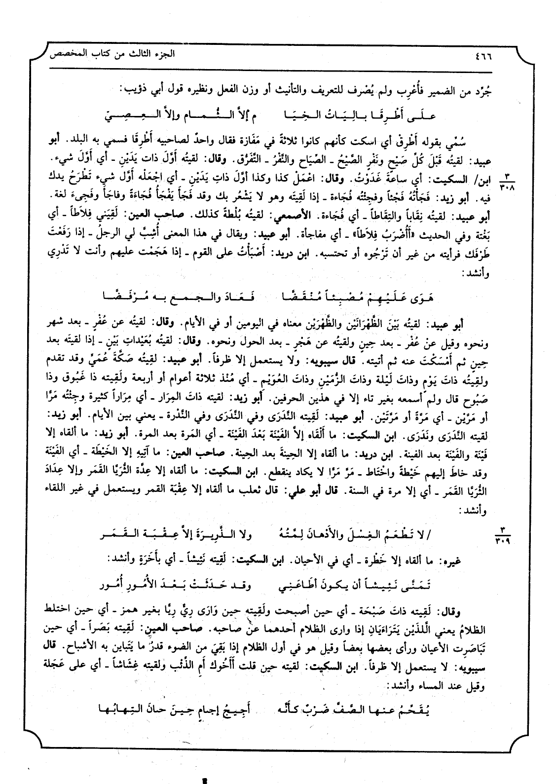 جُرّد من الضَّمِير فأُعرِب وَلم يُصرف للتعريف والتأنيث أَو وزن الْفِعْل وَنَظِيره قَول أبي ذُؤَيْب: على أطرِقا بالِياتُ الخِيا م إِلَّا الثُّمام وَإِلَّا العِصيّ سمّي بقوله أطرِقْ أَي اسْكُتْ كَأَنَّهُمْ كَانُوا ثَلَاثَة فِي مَفازة فَقَالَ وَاحِد لصاحبيه أطرِقا فَسمى بِهِ الْبَلَد. أَبُو عبيد: لَقيته قبل كلّ صيْح ونفْرٍ الصّيْح - الصِياح والنّفْر - التفرّق. وَقَالَ: لَقيته أول ذَات يدين - أَي أول شَيْء. ابْن السّكيت: أَي سَاعَة غدوْت. وَقَالَ: اعمَل كَذَا وَكَذَا أول ذَات يدين - أَي اجعلْه أول شَيْء تطرَح يدك فِيهِ. أَبُو زيد: فجأتُه فجئاً وفجِئتُه فُجاءة - إِذا لَقيته وَهُوَ لَا يشعرُ بك وَقد فجأ يفجأ فُجاءة وفاجأ وفجئ لُغَة. أَبُو عبيد: لَقيته نِقاباً والتِقاطاً - أَي فجاءة. الْأَصْمَعِي: لَقيته بُلْطة كَذَلِك. صَاحب الْعين: لقيَني فِلاطاً - أَي بغْتة وَفِي الحَدِيث) أأُضْرَب فِلاطاً (- أَي مفاجأة. أَبُو عبيد: وَيُقَال فِي هَذَا الْمَعْنى أُشِبّ لي الرجل - إِذا رفَعْت طرْفَك فرأيته من غير أَن ترجوه أَو تحتسبه. ابْن دُرَيْد: أصْبأت على الْقَوْم - إِذا هجمْت عَلَيْهِم وَأَنت لَا تَدْرِي وَأنْشد: هوى عَلَيْهِم مُصبئاً منقَضّاً فَعَاد وَالْجمع بِهِ مُرْفَضّا أَبُو عبيد: لقيتُه بَين الظّرانَين والظهرَيْن مَعْنَاهُ فِي الْيَوْمَيْنِ أَو فِي الْأَيَّام. وَقَالَ: لقيتُه عَن عُفْر - بعد شهر وَنَحْوه وَقيل عَن عُفْر - بعد حِين ولقيتُه عَن هجْر - بعد الْحول وَنَحْوه. وَقَالَ: لَقيته بُعَيْدات بيْن - إِذا لقيتَه بعد حِين ثمَّ أمسكْت عَنهُ ثمَّ أَتَيْته. قَالَ سِيبَوَيْهٍ: وَلَا يسْتَعْمل إِلَّا ظرفا. أَبُو عبيد: لقيتُه صكّة عُمَيّ وَقد تقدم ولقيته ذَات يومٍ وَذَات لَيْلَة وَذَات الزُّمَيْن وَذَات العُوَيْم - أَي مُنْذُ ثَلَاثَة أَعْوَام أَو أَرْبَعَة ولقيته ذَا غَبوق وَذَا صَبوح قَالَ وَلم أسمعهُ بِغَيْر تَاء إِلَّا فِي هذَيْن الحرفين. أَبُو زيد: لَقيته ذَات المِرار - أَي مِراراً كَثِيرَة وجئتُه مَرّاً أَو مرّين - أَي مرّة أَو مرّتين. أَبُو عبيد: لَقيته النّدَرَى وَفِي النّدَرى وَفِي النَّدْرة - يَعْنِي بَين الْأَيَّام. أَبُو زيد: لَقيته النّدَرَى ونَدَرى. ابْن السّكيت: مَا أَلْقَاهُ إِلَّا الفَيْنة بعد الفَيْنة - أَي الْمرة بعد الْمرة. أَبُو زيد: مَا أَلْقَاهُ إِلَّا فَيْنَة والفَيْنة بعد الفينة. ابْن دُرَيْد: مَا أَلْقَاهُ إِلَّا الحِينة بعد الحينة. صَاحب الْعين: مَا آتِيه إِلَّا الخَيْطة - أَي الفَيْنة وَقد خاط إِلَيْهِ خيْطةً واختاط - مرّ مرّاً لَا يكَاد يَنْقَطِع. ابْن السّكيت: مَا أَلْقَاهُ إِلَّا عدّة الثُريّا القمَر وَإِلَّا عِدادَ الثريّا الْقَمَر - أَي إِلَّا مرّة فِي السّنة. قَالَ أَبُو عَليّ: قَالَ ثَعْلَب مَا أَلْقَاهُ إِلَّا عِقْبة الْقَمَر وَيسْتَعْمل فِي غير اللِّقَاء وَأنْشد: لَا تطْعَم الغِسْل والأدهان لِمْتُه وَلَا الذّريرة إِلَّا عِقْبة الْقَمَر غَيره: مَا أَلْقَاهُ إِلَّا خَطْرة - أَي فِي الأحيان. ابْن السّكيت: لَقيته نئيشاً - أَي بأخَرَة وَأنْشد: تمنى نئيشاً أَن يكون أَطَاعَنِي وَقد حدثَتْ بعد الْأُمُور أُمُور وَقَالَ: لَقيته ذَات صبْحة - أَي حِين أَصبَحت ولقيته حِين وارى رِيّ رِيّاً بِغَيْر همز - أَي حِين اخْتَلَط الظلام يعن اللذَين يتراءَيان إِذا وارى الظلام أَحدهمَا عَن صَاحبه. صَاحب الْعين: لَقيته بصَراً - أَي حِين تباصَرت الْأَعْيَان وَرَأى بَعْضهَا بعضاًوقيل هُوَ فِي أول الظلام إِذا بَقِي من الضَّوْء قدرُ مَا يتباين بِهِ الأشباح. قَالَ سِيبَوَيْهٍ: لَا يسْتَعْمل إِلَّا ظرفا. ابْن السّكيت: لَقيته حِين قلت أأخوك أمِ الذِّئْب ولقيته غِشاشاً - أَي على عجَلة وَقيل عِنْد الْمسَاء وَأنْشد: يُقحِّم عَنْهَا الصّف ضرْبٌ كَأَنَّهُ أجيج إجامٍ حِين حَان التهابُها
