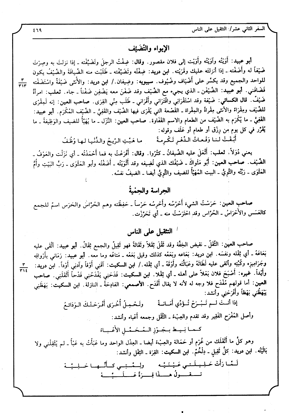 أَبُو عبيد: أوَيْتُه وآويْتُه وأوَيْت إِلَى فلَان مَقْصُور. وَقَالَ: ضِفْت الرجلَ وتضيّفْته - إِذا نزلتَ بِهِ وصِرْت ضيْفاً لَهُ وأضَفْته - إِذا أنزلته عَلَيْك وقرَيْته. ابْن دُرَيْد: ضِفْته وتضيّفته - طلبت مِنْهُ الضِيافة والضّيف يكون للْوَاحِد والجميع وَقد يكسّر على أضْياف وضُيوف. سِيبَوَيْهٍ: وضيفان. ابْن دُرَيْد: وَالْأُنْثَى ضَيْفة واستضفْته فضافَني. أَبُو عبيد: الضَّيْفَن - الَّذِي يَجِيء مَعَ الضَّيْف وَقد ضفن مَعَه يضفِن ضفْناً - جَاءَ. ثَعْلَب: امْرَأَة ضَيْف. قَالَ الْكسَائي: ضيفة وَقد استقْراني واقتراني وأقراني - طلب منّي القِرى. صَاحب الْعين: إِنَّه لمِقْرًى للضيه ومِقراء وَالْأُنْثَى مِقراة والمِقْراة - الْقَصعَة الَّتِي يُقْرى فِيهَا الضَّيْف والقَفيّ - الضّيف المُكْرَم. أَبُو عبيد: القفيّ - مَا يُكرَم بِهِ الضّيف من الطَّعَام وَالِاسْم القَفاوة. صَاحب الْعين: النُّزْل - مَا يُهيّأ للضيف والوظيفة - مَا يُقرر فِي كل يَوْم من رزق أَو طَعَام أَو علَف وَقَوله: أبْقَتْ لنا وقَعات الدّهْر تكرِمة مَا هبّت الرّيح والدُنيا لَهَا وُظُفُ يَعْنِي دوَلاً. ثَعْلَب: أثْعَل عَلَيْهِ الضيفان - كثُروا. وَقَالَ: أفرَعْت بِهِ فَمَا أحمَدْته - أَي نزلْت والعَوْف - الضّيف. صَاحب الْعين: أَبُو مَثْواك - ضيفُك الَّذِي تُضيفه وَقد أثويته - أضفته وَأَبُو المثوى - ربّ الْبَيْت وَأم المَثْوى - تبّته والثّويّ - الْبَيْت المهيّأ للضيف والثّويّ أَيْضا - الضَّيْف نَفسه.