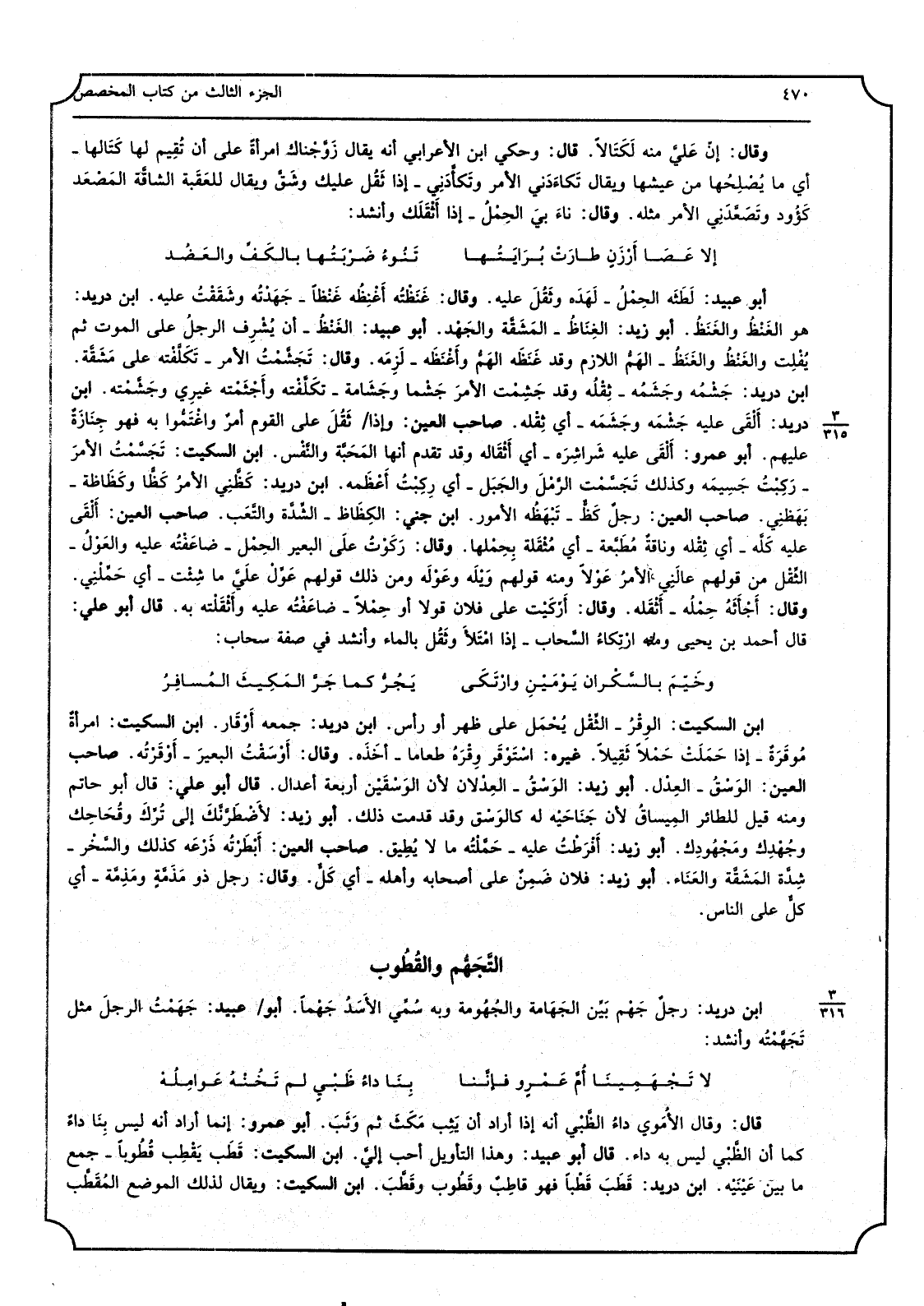 ابْن دُرَيْد: رجل جَهْم بيّن الجهامة والجُهومة وَبِه سمّي الْأسد جَهْماً. أَبُو بعيد: جهَمْت الرجل مثل تجهّمْته وَأنْشد: لَا تجهَمينا أمّ عَمْرو فإننا بِنَا داءُ ظَبي لم تخنْه عواملُهْ قَالَ: وَقَالَ الأُمَوي داءُ الظّبي أَنه إِذا أَرَادَ أَن يثِب مكثَ ثمَّ وثب. أَبُو عَمْرو: إِنَّمَا أَرَادَ أَنه لَيْسَ بِنَا دَاء كَمَا أَن الظّبي لَيْسَ بِهِ دَاء. قَالَ أَبُو عبيد: وَهَذَا التَّأْوِيل أحب إليّ. ابْن السّكيت: قطَب يقطِب قُطوباً - جمع مَا بَين عَيْنَيْهِ. ابْن دُرَيْد: قطَب قطْباً فَهُوَ قاطب وقَطوب وقطّب. ابْن السّكيت: وَيُقَال لذَلِك الْموضع المقطَّب