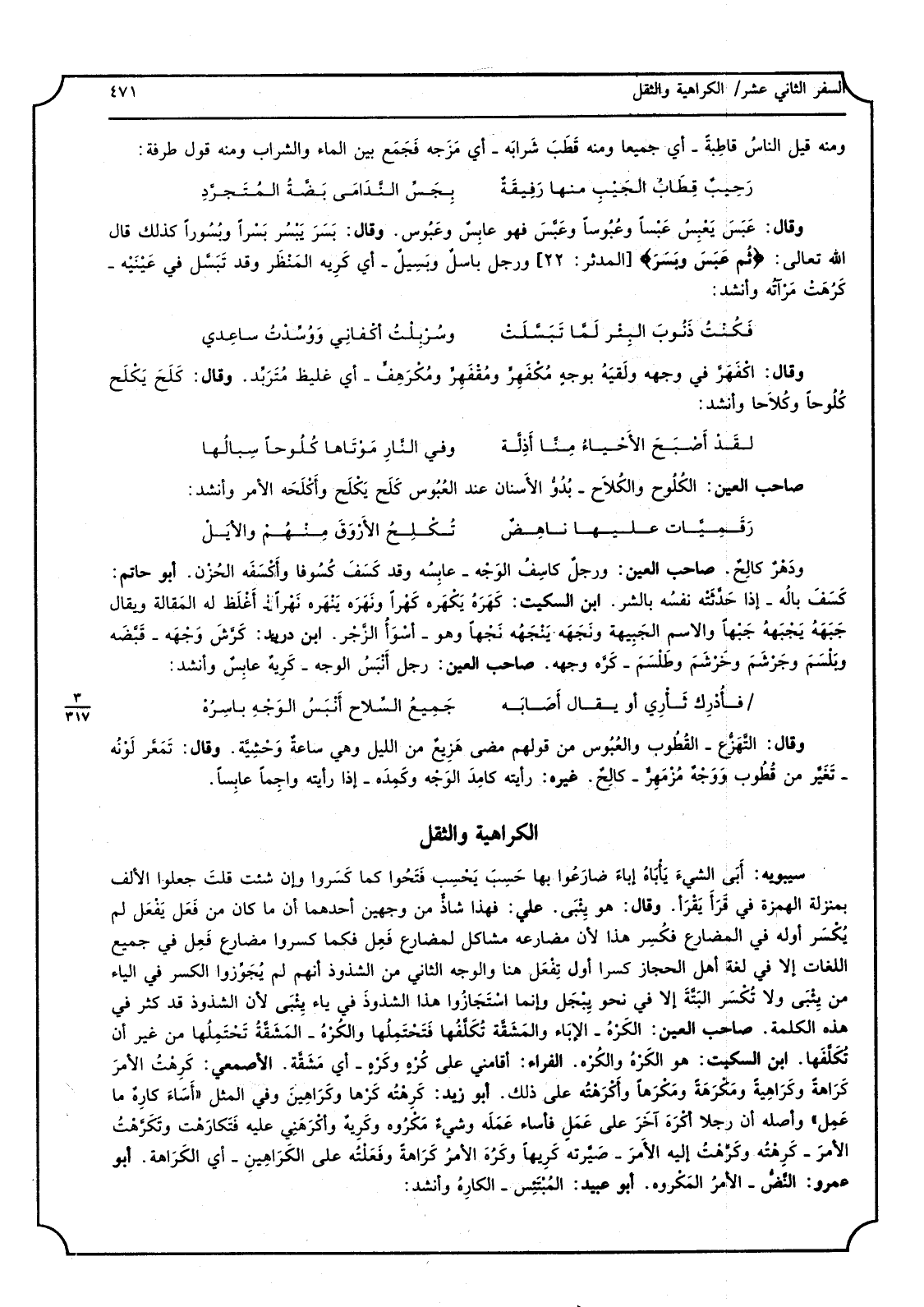 وَمِنْه قيل النَّاس قاطِبة - أَي جَمِيعًا وَمِنْه قطَب شَرابَه - أَي مزجه فَجمع بَين المَاء وَالشرَاب وَمِنْه قَول طرفَة: رَحيبٌ قِطابُ الجيْب مِنْهَا رَفِيقَة بجَسّ النّدامى بضّةُ المتجرّد وَقَالَ: عبَس يعبِس عبْساً وعُبوساً وعبْس فَهُوَ عابِس وعَبوس. وَقَالَ: بسرَ يبسُر بسْراً وبُسوراً كَذَلِك قَالَ الله تَعَالَى) ثمَّ عبس وبسَر (وَرجل باسل وبَسيل - أَي كريه المنْظَر وَقد تبسّل فِي عَيْنَيْهِ - كَرُهَتْ مرآته وَأنْشد: فكنتُ ذَنوبَ الْبِئْر لمّا تبسّلَت وسُربِلْت أكفاني ووسِّدت ساعدي وَقَالَ: اكفهرّ فِي وَجهه ولقيَه بِوَجْه مكفهرّ ومقْفَهرّ ومكرَهفّ - أَي غليظ متربّد. وَقَالَ: كلحض يكلَح كُلوحاً وكُلاحاً وَأنْشد: لقد أصبح الْأَحْيَاء منّا أذلّة وَفِي النَّار موْتاها كُلوحاً سِبالُها صَاحب الْعين: الكُلوح والكُلاح - بُدوّ الْأَسْنَان عِنْد العُبوس كلحَ يكلَح وأكلحَه الْأَمر وَأنْشد: رقميّات عَلَيْهَا ناهضٌ تكلِح الأرْوَق منهُم والأيلْ ودهر كالِح. صَاحب الْعين: رجل كاسف الْوَجْه - عابِسه وَقد كسف كُسوفاً وأكسَفه الْحزن. أَبُو حَاتِم: كسف بالُه - إِذا حدّثَتْه نَفسه بِالشَّرِّ. ابْن السّكيت: كهَرَه يكهَره كهْراً ونهرَه ينهَره نهْراً - أغْلظ لَهُ الْمقَالة وَيُقَال جبَهه يجْبَهه جبْهاً وَالِاسْم الجَبيهة ونجَهَه ينجَهه نجْهاً وَهُوَ - أسْوأ الزّجْر. ابْن دُرَيْد: كرّش الوجهه - قبّضه وبلسَم وجرْشَم وخرْشَم وطلْسَم - كرّه وَجهه. صَاحب الْعين: رجل أنيس الْوَجْه - كريه عابِس وَأنْشد: فأُدرِك ثَأْرِي أَو يُقَال أصابَه جَمِيع السِلاح أنيسُ الْوَجْه باسِرُهْ وَقَالَ: التهزّع - القُطوب والعُبوس من قَوْلهم مضى هزيع من اللَّيْل وَهِي سَاعَة وحْشية. وَقَالَ: تمعّر لونُه - تغيّر من قُطوب وَوجه مزْمَهرّ - كالح. غَيره: رَأَيْته كامِدَ الْوَجْه وكمِدَه - إِذا رَأَيْته واجِماً عابِساً.