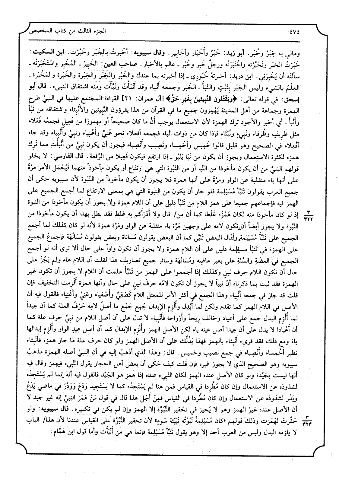 وَمَا لي بِهِ خِبر وخُبر. أَبُو زيد: خبَر وأخبار وأخابير. وَقَالَ سِيبَوَيْهٍ: أخبرتُ بالخَبر وخبّرت. ابْن السّكيت: خبَرْت الخبَر وتخبّرته واختبرْته وَرجل خبِر وخُبْر - عَالم بالأخبار. صَاحب الْعين: الخَبير - المُخبِر واستخبَرْته - سَأَلته أَن يُخبِرَني. ابْن دُرَيْد: أخْبرته خُبوري - إِذا أخْبرته بِمَا عنْدك والخُبْر والخِبْر والخِبرة والخُبرة والمَخبَرة - العِلم بالشَّيْء وَلَيْسَ الخِبْر بثبت والنّبأ - الخَبر وَجمعه أنْباء وَقد أنبأت ونبّأت وَمِنْه اشتقاق النبيء. قَالَ أَبُو إِسْحَق: فِي قَوْله تَعَالَى) ويقتُلون النّبيئين بِغَيْر حق (الْقِرَاءَة الْمُجْتَمع عَلَيْهَا فِي النَّبِي طرح الْهمزَة وَجَمَاعَة من أهل الْمَدِينَة يهمِزون جَمِيع مَا فِي الْقُرْآن من هَذَا يقرؤون النبيئين والأنبِئاء واشتقاقه من نبّأ وأنبأ - أَي أخبر والأجود ترك الْهمزَة لِأَن الِاسْتِعْمَال يُوجب أَن مَا كَانَ صَحِيحا أَو مهموزاً من فَعيل فجمعُه فُعَلاء مثل ظريف وظُرفاء ونَبيء ونُبئاء فَإِذا كَانَ من ذَوَات الْيَاء فَجَمعه أفعلاء نَحْو غَني وأغنياء وَنَبِي وأنبياء وَقد جَاءَ أفعِلاء فِي الصَّحِيح وَهُوَ قَلِيل قَالُوا خَميس وأخمِساء وَنصِيب وأنصِباء فَيجوز أَن يكون نبيّ من أنبأت مِمَّا تُرِك همزَة لِكَثْرَة الِاسْتِعْمَال وَيجوز أَن يكون من نَبا ينْبو - إِذا ارْتَفع فَيكون فَعيلاً من الرِّفعة. قَالَ الْفَارِسِي: لَا يَخْلُو قَوْلهم النبيّ من أَن يكون مأخوذاً من النّبأ أَو من النّبْوة الَّتِي هِيَ ارْتِفَاع أَو يكون مأخوذاً مِنْهُمَا فيُحمَل الْأَمر مرّة على أَنَّهَا يَاء منقلبة عَن الْوَاو ومرّة على أَنَّهَا همزَة فَلَا يجوز أَن يكون مأخوذاً من النّبْوة لِأَن سِيبَوَيْهٍ حكى أَن جَمِيع الْعَرَب يَقُولُونَ تنبّأ مُسَيلِمة فَلَو جَازَ أَن يكون من النُّبُوَّة الَّتِي هِيَ بِمَعْنى الِارْتفَاع لما أجمع الْجَمِيع على الهمْز فِيهِ فإجماعهم جَمِيعًا على همز اللَّام من تنبّأ دَلِيل على أَن اللَّام همزَة وَلَا يجوز أَن يكون مأخوذاً من النُّبُوَّة إِذْ لَو كَانَ مأخوذاً مِنْهُ لَكَانَ همزُه غلَطاً كَمَا أَن من قَالَ وَلَا أدْراكم بِهِ غلط فقد بَطل بِهَذَا أَن يكون مأخوذاً من النَبْوة وَلَا يجوز أَيْضا أَن تكون لامه على وَجْهَيْن مرّة يَاء منقلبة عَن الْوَاو وَمرَّة همزَة لِأَنَّهُ لَو كَانَ كَذَلِك لما أجمع الْجَمِيع على تنبّأ مُسَيْلِمة ولقال الْبَعْض تنبّى كَمَا أَن الْبَعْض يَقُولُونَ مُساناة وَبَعض يَقُولُونَ مُسانَهة فإجماع الْجَمِيع على الْهَمْز فِي تنبّأ مُسَيْلمَة دَلِيل على أَن اللَّام همزَة وَلَا يجوز أَن تكون واواً على حَال أَلا ترى أَنه لَو أجمع الْجَمِيع فِي العِضَة والسّنَة على بعير عاضِه ومُسانَهة وَسَائِر جَمِيع تصاريف هَذَا لَقلت إِن اللَّام هَاء وَلم يجُز على حَال أَن تكون اللَّام حرف لين وَكَذَلِكَ إِذا أَجمعُوا على الْهَمْز من تنبّأ علمت أَن اللَّام لَا يجوز أَن تكون غير الْهمزَة فقد ثَبت بِمَا ذَكرْنَاهُ أنّ نَبيا لَا يجوز أَن تكون لامُه حرفَ لين على حَال وَأَنَّهَا همزَة أُلزِمت التَّخْفِيف فَإِن قلت قد جَازَ فِي جمعه أَنْبيَاء وَهَذَا الْجمع فِي أَكثر الْأَمر للمعتل اللَّام كصَفيّ وأصْفياء وغنيّ وأغنياء فَالْقَوْل فِيهِ إِن الأَصْل فِي اللَّام الْهَمْز كَمَا تقدم وَلَكِن لما أُبدِل وأُلزِم الْإِبْدَال جُمِع جمْع مَا أصل لامه حرْف الْعلَّة كَمَا أَن عيداً لما أُزِم الْبَدَل جمع على أعياد وَخَالف ريحًا وأرْواحاً فأنبياء لَا تدل على أَن أصل اللَّام من نَبِي حرف عِلّة كَمَا أَن أعْياداً لَا يدل على أَن عيداً أصل عينه يَاء لَكِن الأَصْل الْهَمْز وألزِم الْإِبْدَال كَمَا أَن أصل عيد الْوَاو وألزِم إبدالها يَاء وَمَعَ ذَلِك فقد قرئَ أنبئاء بِالْهَمْز فَهَذَا يدلّك على أَن الأَصْل الْهَمْز وَلَو كَانَ حرف عِلّة مَا جَازَ همز