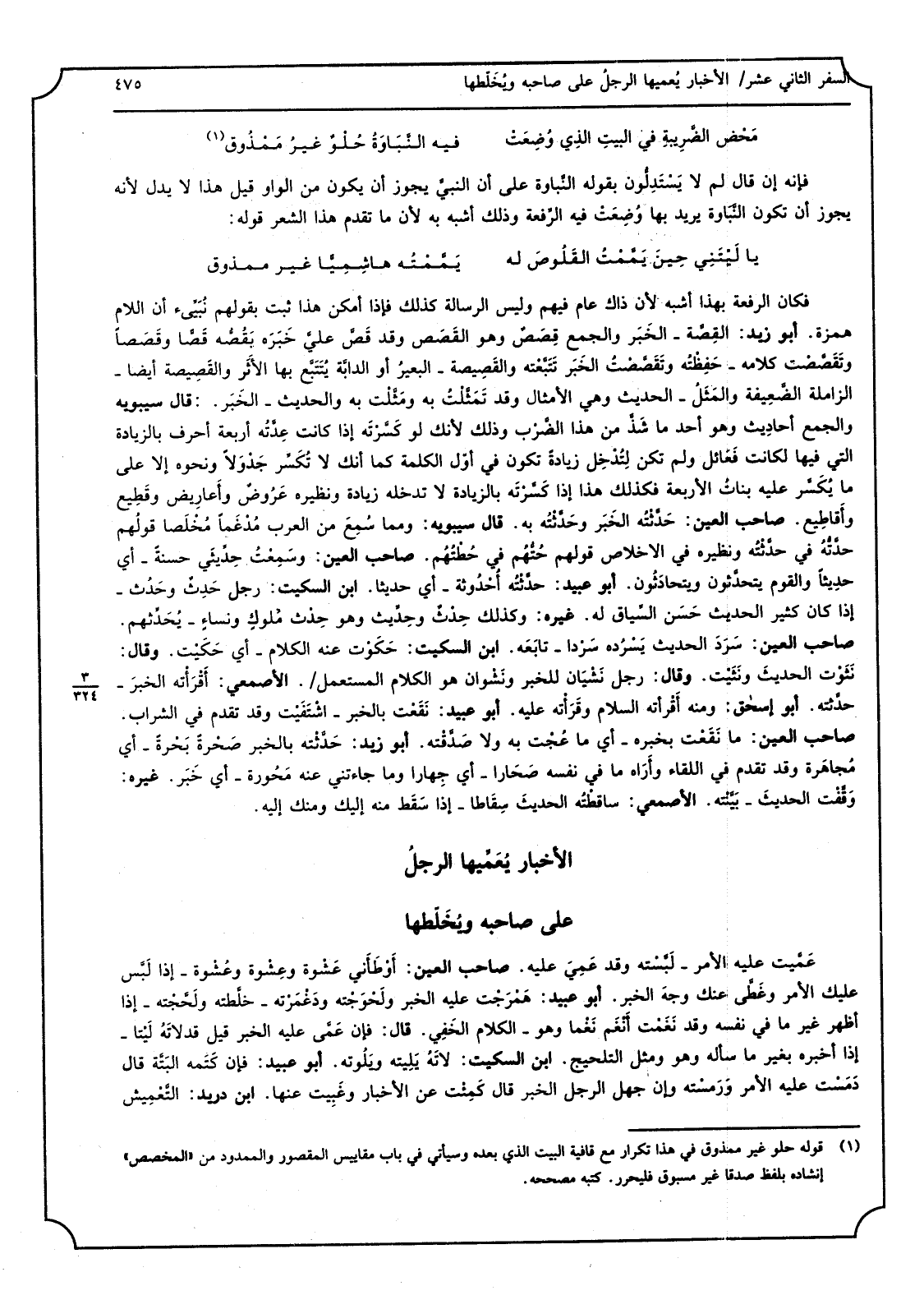 محْض الضّريبة فِي الْبَيْت الَّذِي وُضِعَتْ فِيهِ النّباوةُ حُلو غير ممذوق فَإِنَّهُ إِن قَالَ لم لَا يستدلّون بقوله النّباوة على أَن النّبيّ يجوز أَن يكون من الْوَاو قيل هَذَا لَا يدل لِأَنَّهُ يجوز أَن تكون النّباوة يُرِيد بهَا وُضِعَت فِيهِ الرِفعة وَذَلِكَ أشبه بِهِ لِأَن مَا تقدم هَذَا الشّعْر قَوْله: يَا لَيتني حِين يممت القَلوص لَهُ يمّمْته هاشميّاً غير ممذوق فَكَانَ الرّفْعَة بِهَذَا أشبه لِأَن ذَاك عَام فيهم وَلَيْسَ الرسَالَة كَذَلِك فَإِذا أمكن هَذَا ثَبت بقَوْلهمْ نُبَيّئ أَن اللَّام همزَة. أَبُو زيد: القصّة - الْخَبَر وَالْجمع قِصَص وَهُوَ القَصَص وَقد قصّ عليّ خَبره يقُصّه قصاً وقصَصاً وتقصّصْت كَلَامه - حفظْته وتقصّصت الخبرَ - تتبّعته والقَصيصة - الْبَعِير أَو الدابّة يُتتبّع بهَا الْأَثر والقَصيصة أَيْضا - الزاملة الضّيفة والمثَل - الحَدِيث وَهِي الْأَمْثَال وَقد تمثّلت بِهِ ومثّلت بِهِ والْحَدِيث - الْخَبَر. قَالَ سِيبَوَيْهٍ: وَالْجمع أَحَادِيث وَهُوَ أحد مَا شذّ من هَذَا الضّرْب وَذَلِكَ لِأَنَّك لَو كسّرْته إِذا كَانَت عِدّته أَرْبَعَة أحرف بِالزِّيَادَةِ الَّتِي فِيهَا لكَانَتْ فعائل وَلم تكن لتُدخِل زِيَادَة تكون فِي أول الْكَلِمَة كَمَا أَنَّك لَا تُكسّر جدْوَلاً وَنَحْو الْأَعْلَى مَا يُكسَّر عَلَيْهِ بَنَات الْأَرْبَعَة فَكَذَلِك هَذَا إِذا كسّرْته بِالزِّيَادَةِ لَا تدخله زِيَادَة وَنَظِيره عَروض وأعاريض وقَطيع وأقاطيع. صَاحب الْعين: حدّثْته الخبَر وحدّثْته بِهِ. قَالَ سِيبَوَيْهٍ: وَمِمَّا سُمِع من الْعَرَب مُدْغَماً مُخلَصاً قَوْلهم حدّتّه فِي حدثته وَنَظِيره فِي الْإِخْلَاص قَوْلهم حُتّهم فِي حُظْتهم. صَاحب الْعين: وَسمعت حِدّيثَ حَسَنَة - أَي حَدِيثا وَالْقَوْم يتحدّثون ويتحادثون. أَبُو عبيد: حدّثته أُحدوثة - أَي حَدِيثا. ابْن السّكيت: رجل حَدِث وحَدُث - إِذا كَانَ كثير الحَدِيث حسن السِياق لَهُ. غَيره: وَكَذَلِكَ حِدْث وحدّيث وَهُوَ حِدْث مُلُوك وَنسَاء - يُحَدِّثهُمْ. صَاحب الْعين: سرد الحديثَ يسرُده سرْداً - تَابعه. ابْن السّكيت: حكَوْت عَنهُ الْكَلَام - أَي حكيت. وَقَالَ: نثَوْت الحَدِيث ونثيْت. وَقَالَ: رجل نشيان للْخَبَر ونشْوان هُوَ الْكَلَام الْمُسْتَعْمل. الْأَصْمَعِي: أَقرَأته الْخَبَر - حدّثته. أَبُو إِسْحَق: وَمِنْه أَقرَأته السَّلَام وقرأته عَلَيْهِ. أَبُو عبيد: نقعْت بالْخبر - اشتَفيْت وَقد تقدم فِي الشَّرَاب. صَاحب الْعين: مَا نقَعْت بِخَبَرِهِ - أَي مَا عُجْت بِهِ وَلَا صدّقْته. أَبُو زيد: حِدّثْته بالْخبر صَحْرة بحْرة - أَي مُجاهرة وَقد تقدم فِي اللِّقَاء وَأرَاهُ مَا فِي نَفسه صَحاراً - أَي جِهارا وَمَا جَاءَتْنِي عَنهُ مَحورة - أَي خبر. غَيره: وقّفْت الحديثَ - بيّنْته. الْأَصْمَعِي: ساقطْتُه الحديثَ سِقاطاً - إِذا سقط مِنْهُ إِلَيْك ومنك إِلَيْهِ.