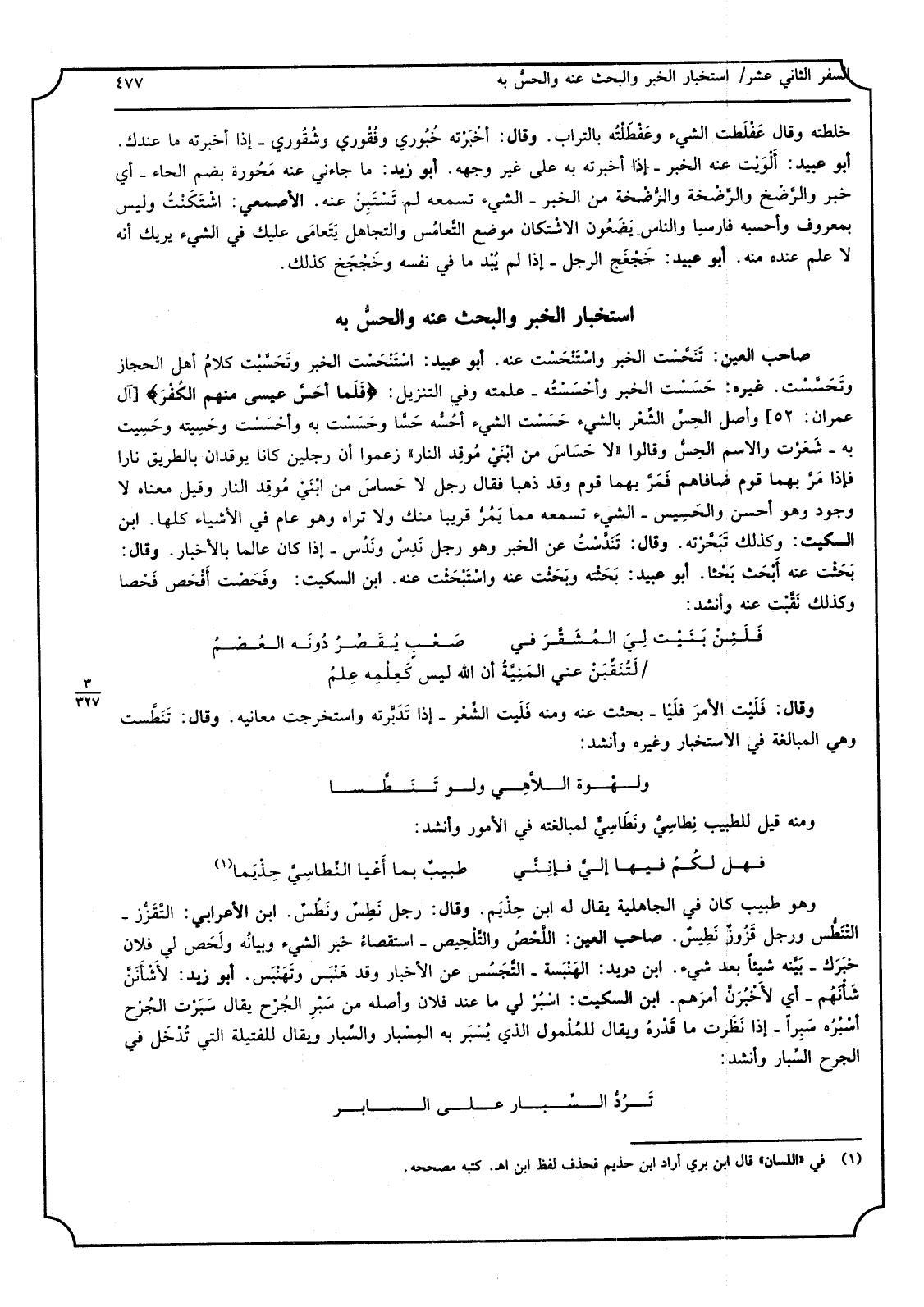 صَاحب الْعين: تنحّسْت الْخَبَر واستنْحَسْت عَنهُ. أَبُو عبيد: استنحَست الْخَبَر وتحسّبت كَلَام أهل الْحجاز وتحسّسْت. غَيره: حسَسْت الْخَبَر وأحسَسْته - علمت وَفِي التَّنْزِيل) فَلَمَّا أحسّ عِيسَى مِنْهُم الكُفر (وأصل الحِس الشِعْر بالشَّيْء حسَسْت الشَّيْء أحُسّه حَسّاً وحسَسْت بِهِ وأحسَست وحسيته وحسِيت بِهِ - شَعرت وَالِاسْم الحسّ وَقَالُوا لَا حَساس من ابنَيْ موقِد النَّار زَعَمُوا أَن رجلَيْنِ كَانَا يوقدان بِالطَّرِيقِ نَارا فَإِذا مرّ بهما قوم ضافاهم فمرّ بهما قوم وَقد ذَهَبا فَقَالَ رجل لَا حَساس من ابنَيْ موقِد النَّار وَقيل مَعْنَاهُ لَا وجود وَهُوَ أحسن والحَسيس - الشَّيْء تسمعه مِمَّا يمرّ قَرِيبا مِنْك وَلَا ترَاهُ وَهُوَ عَام فِي الْأَشْيَاء كلهَا. ابْن السّكيت: وَكَذَلِكَ تبحّرته. وَقَالَ: تندّسْت عَن الْخَبَر وَهُوَ رجل ندِس وندُس - إِذا كَانَ عَالما بالأخبار. وَقَالَ: بحثْت عَنهُ أبحَث بحْثاً. أَبُو عبيد: بحثْته وبحثْت عَنهُ واستبحثْت عَنهُ. ابْن السّكيت: وفَحصْت أفحص فحْصاً وَكَذَلِكَ نقّبْت عَنهُ وَأنْشد: فلئن بَنَيت لي المُشَقِّرَ فِي صعْبٍ يقَصّر دونَه العُصْم لتُنقِّبْن عني الْمنية أَن الله لَيْسَ كعلمِه عِلمُ وَقَالَ: فليت الْأَمر فَلياً - بحثت عَنهُ وَمِنْه فلَيت الشِعْر - إِذا تدبّرته واستخرجت مَعَانِيه. وَقَالَ: تنطّست وَهِي الْمُبَالغَة فِي الاتخبار وَغَيره وَأنْشد: ولَهوة اللاهي وَلَو تنطّسا وَمِنْه قيل للطبيب نِطاسيّ ونَطاسي لمبالغته فِي الْأُمُور وَأنْشد: فَهَل لكُمُ فِيهَا إليّ فإنني طَبِيب بِمَا أعْيا النِطاسيّ حِذْيَما وَهُوَ طَبِيب كَانَ فِي الْجَاهِلِيَّة يُقَال لَهُ ابْن حِذْيَم. وَقَالَ: رجل نَطِس ونطُس. ابْن الْأَعرَابِي: التقزّز - التنطّس وَرجل قزوز نَطيس. صَاحب الْعين: اللحْص والتّلحيص - استقصاء خبر الشَّيْء وَبَيَانه ولحَص لي فلَان خبرَك - بيّنه شَيْئا بعد شَيْء. ابْن دُرَيْد: الهَنبَسة - التجسّس عَن الْأَخْبَار وَقد هنْبَس وتهنْبَس. أَبُو زيد: لأشأننّ شَأْنهمْ - أَي لأخبُرنّ أمرَهم. ابْن السّكيت: اسُبرْ لي مَا عِنْد فلَان وَأَصله من سَبْر الجُرْح يُقَال سَبَرْت الجُرْح أسبُرُه سَبْراً - إِذا نظرت مَا قَدْره وَيُقَال للمُلمول الَّذِي يُسْبَر بِهِ المِسْبار والسِّبار وَيُقَال للفتيلة الَّتِي تُدخَل فِي الْجرْح السِبار وَأنْشد: تردّ السِبار على السابر