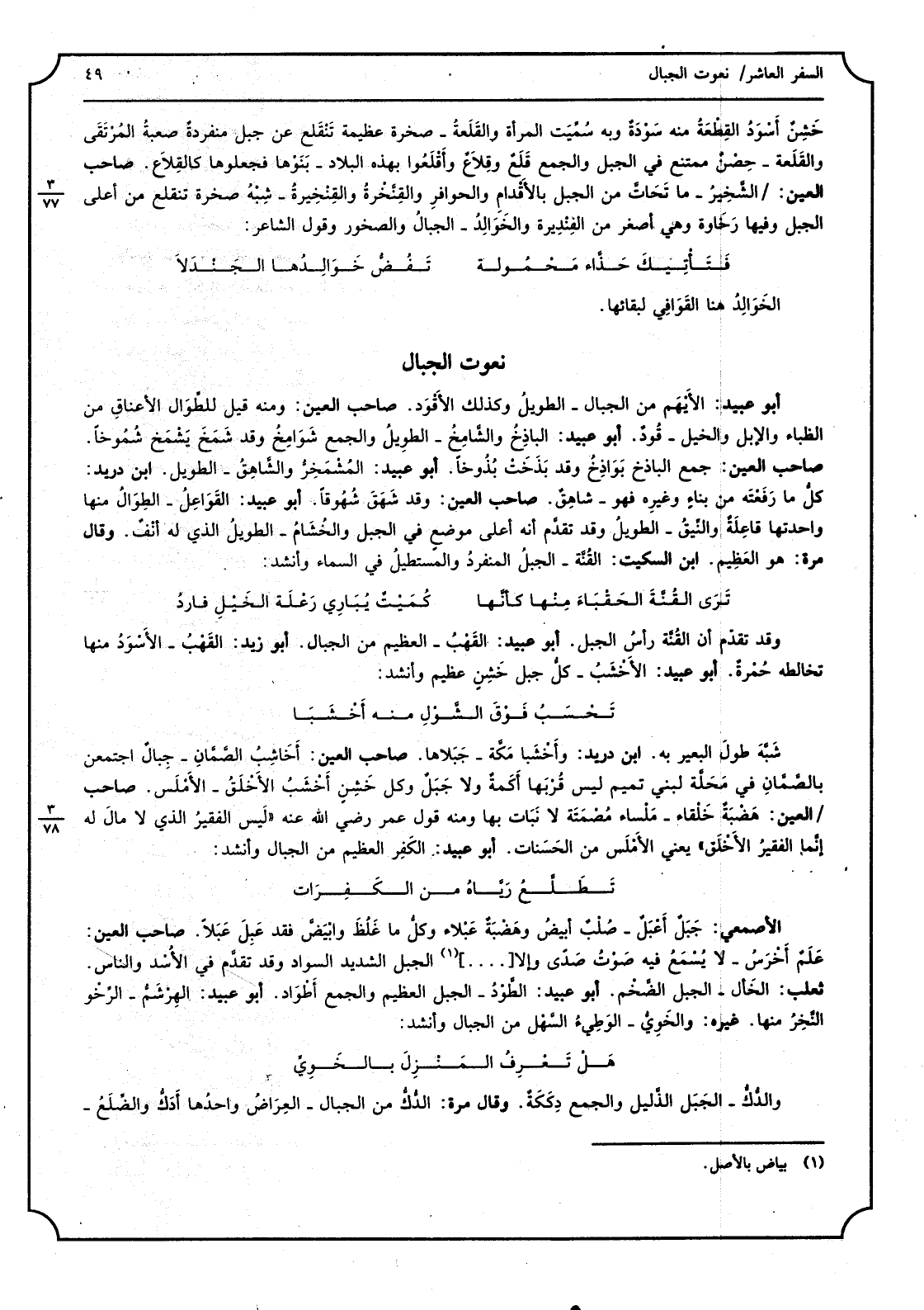 أَبُو عبيد الايهم من الْجبَال - الطَّوِيل وَكَذَلِكَ الأقود صَاحب الْعين وَمِنْه قيل للطوال الْأَعْنَاق من الظباء والابل وَالْخَيْل - قَود أَبُو عبيد الباذخ والشامخ - الطَّوِيل وَالْجمع شوامخ وَقد شمخ يشمخ شموخاً صَاحب الْعين جمع الباذخ بواذخ وَقد بذخت بذوخاً أَبُو عبيد المشمخر والشاهق - الطَّوِيل ابْن دُرَيْد كل مَا رفعته من بِنَاء أَو غَيره فَهُوَ - شَاهِق صَاحب الْعين وَقد شهق شهوقاً أَبُو عبيد القواعل - الطوَال مِنْهَا واحدتها قاعلة والنيق - الطَّوِيل وَقد تقدم أَنه أَعلَى مَوضِع فِي الْجَبَل والخشام - الطَّوِيل الَّذِي لَهُ أنف وَقَالَ مرّة هُوَ الْعَظِيم ابْن السّكيت القنة - الْجَبَل الْمُنْفَرد والمستطيل فِي السَّمَاء وَأنْشد: ترى القنة الحقباء مِنْهَا كَأَنَّهَا كميت يباري رعلة الْخَيل فارد وَقد تقدم أَن القنة رَأس الْجَبَل أَبُو عبيد القهب - الْعَظِيم من الْجبَال أَبُو زيد القهب - الْأسود مِنْهَا تخالطه حمرَة أَبُو عبيد الأخشب - كل جبل خشن عَظِيم وَأنْشد: تحسب فَوق الشول مِنْهُ أخشبا شبه طول الْبَعِير بِهِ ابْن دُرَيْد وأخشبا مَكَّة - جبلاها صَاحب الْعين أخاشب الصمان - جبال اجْتَمعْنَ بالصمان فِي محلّة لبني تَمِيم لَيْسَ قربهَا أكمة وَلَا جبل وكل خشن أخشب الأخلق - الاملس صَاحب الْعين هضبة خلقاء - ملساء مصمتة لَا نَبَات بهَا وَمِنْه قَول عمر رَضِي الله عَنهُ: (لَيْسَ الْفَقِير الَّذِي لَا مَال لَهُ إِنَّمَا الْفَقِير الأخلق) يَعْنِي الأملس من الْحَسَنَات أَبُو عبيد الْكفْر الْعَظِيم من الْجبَال وَأنْشد: تطلع رياه من الكفرات الْأَصْمَعِي جبل أعبل - صلب أَبيض وهضبة عبلاء وكل مَا غلظ وابيض فقد عبل صَاحب الْعين علم أخرس - لَا يسمع فِيهِ صَوت صدى والا الْجَبَل الشَّديد السوَاد وَقد تقدم فِي الْأسد وَالنَّاس ثَعْلَب الْخَال - الْجَبَل الضخم أَبُو عبيد الطود - الْجَبَل الْعَظِيم وَالْجمع أطواد أَبُو عبيد الهرشم - الرخو والنخر مِنْهَا غَيره والخوي - الوطئ السهل من الْجبَال وَأنْشد: هَل تعرف الْمنزل بالخوي والدك - الْجَبَل الذَّلِيل وَالْجمع دككة وَقَالَ مرّة الدك من الْجبَال - العراض وَاحِدهَا أدك والضلع -
