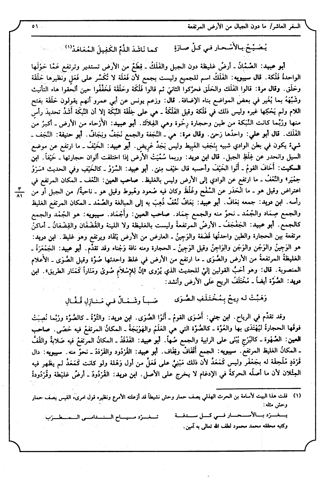 يصبح بالأسحار فِي كل صارة كَمَا نَاشد الذَّم الْكَفِيل الْمعَاهد أَبُو عبيد الصمان - أَرض غَلِيظَة دون الْجَبَل والفلك - قطع من الأَرْض تستدير وترتفع عَمَّا حولهَا الْوَاحِدَة فلكة قَالَ سِيبَوَيْهٍ الْفلك اسْم للْجَمِيع وَلَيْسَت بِجمع لِأَن فعلة لَا تكسر على فعلٍ ونظيرها حَلقَة وَحلق وَقَالَ مرّة قَالُوا الْفلك وَالْحلق فحركوا الثَّانِي ثمَّ قَالُوا فلكة وحلقة فخففوا حِين ألْحقُوا هَاء التَّأْنِيث وَشبهه بِمَا يُغير فِي بعض الْمَوَاضِع بِنَاء الاضافة قَالَ وَزعم يُونُس عَن ابْن عَمْرو أَنهم يَقُولُونَ حَلقَة بِفَتْح اللَّام وَلم يحكها غَيره وَلَيْسَ ذَلِك فِي فلكة وَقيل الفلكة - هِيَ على خلقَة النبكة إِلَّا أَن النبكة أَشد تَحْدِيد رأسٍ مِنْهَا وَرُبمَا كَانَت النبكة من طين وحجارة رخوة وَهِي الفلاك أَبُو عبيد الأرحاء من الأَرْض - أكبر من الْفلك قَالَ أَبُو عَليّ وَاحِدهَا رحى وَقَالَ مرّة هِيَ - النجفة وَالْجمع نجف ونجاف أَبُو حنيفَة النجف - شَيْء يكون فِي بطن الْوَادي شَبيه بنجف الغبيط وَلَيْسَ بجد عريض أَبُو عبيد الْخيف - مَا ارْتَفع عَن مَوضِع السَّيْل وَانْحَدَرَ عَن غلظ الْجَبَل قَالَ ابْن دُرَيْد وَرُبمَا سميت الأَرْض إِذا اخْتلفت ألوان حجالاتها - خيفاً ابْن السّكيت أَخَاف الْقَوْم - أَتَوا الْخيف وَأَحْسبهُ قَالَ خيف مني أَبُو عبيد السرو - كالخيف وَفِي الحَدِيث (سرو حمير) والنعف - مَا ارْتَفع عَن الْوَادي إِلَى الأَرْض وَلَيْسَ بالغليظ صَاحب الْعين النعف - الْمَكَان الْمُرْتَفع فِي اعْتِرَاض وَقيل هُوَ - مَا انحدر عَن السقح وَغلظ وَكَانَ فِيهِ صعُود وهبوط وَقيل هُوَ - ناحيةٌ من الْجَبَل أَو من رَأسه ابْن دُرَيْد جمعه نعاف أَبُو عبيد نعاف تعف ذهب بِهِ إِلَى الْمُبَالغَة والصمد - الْمَكَان الْمُرْتَفع الغليظ وَالْجمع صماد والجمد - نَحْو مِنْهُ وَالْجمع جماد صَاحب الْعين وأجماد سِيبَوَيْهٍ هُوَ الجمد وَالْجمع كالجمع أَبُو عبيد الجفجف - الأَرْض المرتفعة وَلَيْسَت بالغليظة وَلَا اللينة والقضفان - أَمَاكِن مُرْتَفعَة بَين الْحِجَارَة والطين واحدتها قضفة والوجين - الْعَارِض من الأَرْض ينقاد ويرتفع وَهُوَ غليظ ابْن دُرَيْد هُوَ الوجين والوجن والواجن وَقيل الوجين - الْحِجَارَة وَمِنْه نَاقَة وجناء قد تقدم أَبُو عبيد الجمعرة - الغليظة المرتفعة من الأَرْض والصوى - مَا ارْتَفع من الأَرْض فِي غلظ واحدتها صوة وَقيل الصوى - الْأَعْلَام المنصوبة قَالَ وَهُوَ أحب الْقَوْلَيْنِ إِلَى للْحَدِيث الَّذِي يرْوى (أَن للاسلام ومناراً كمنار الطَّرِيق) ابْن دُرَيْد الصوة أَيْضا - مُخْتَلف الرّيح على الأَرْض وَأنْشد: وهبت لَهُ ريح بمختلف الصوى صبا وشمال فِي منَازِل قفال وَقد تقدم فِي الرِّيَاح ابْن جني أصوى الْقَوْم - أَتَوا الصوى ابْن دُرَيْد والثوة - كالصوة وَرُبمَا نصبت فَوْقهَا الْحِجَارَة ليعتدي بهَا والعوة - كالصوة الَّتِي هِيَ الْعلم والهوبجة - الْمَكَان الْمُرْتَفع فِيهِ حَصى صَاحب الْعين الصهوة - كالبرج يبْنى على الرابية وَالْجمع صها أَبُو عبيد الفدفد - الْمَكَان الْمُرْتَفع فِيهِ صلابة والفف - الْمَكَان الغليظ الْمُرْتَفع سِيبَوَيْهٍ الْجمع أقفاف وقفاف أَبُو عبيد القرود والقردد - نَحْو مِنْهُ سِيبَوَيْهٍ دَال قردد مُلْحقَة لَهُ بِجَعْفَر وَلَيْسَ كمعد لِأَن ذَلِك مَبْنِيّ على فعل من أول وهلة وَلَو كَانَ كمعد لم يظْهر فِيهِ المثلان لِأَن مَا أَصله الْحَرَكَة فِي الادغام لَا يخرج على الأَصْل ابْن دُرَيْد القردود - أَرض غَلِيظَة وقردودة