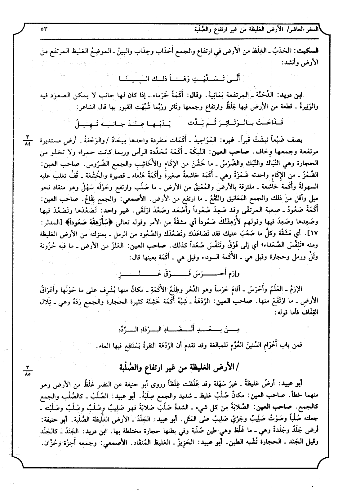 السّكيت الحدب - الغلظ من الأَرْض فِي ارْتِفَاع وَالْجمع أحداب وحداب والبين - الْموضع الغليظ الْمُرْتَفع من الأَرْض وَأنْشد: أَنِّي تسديت وَهنا ذَلِك البينا ابْن دُرَيْد الدحنة - المرتفعة يَمَانِية وَقَالَ أكمة خرماء - إِذا كَانَ لَهَا جَانب لَا يُمكن الصعُود فِيهِ والوتيرة - قِطْعَة من الأَرْض فِيهَا غلظ وارتفاع وَجَمعهَا وتائر وَرُبمَا شبهت الْقُبُور بهَا قَالَ الشَّاعِر: فذاحت بالوتائر ثمَّ بَدَت يَديهَا عِنْد جَانِبه تهيل يصف ضبعاً نبشت قبرا غَيره المواحيد - أكمات مُنْفَرِدَة وَاحِدهَا ميحاد والوحفة - أَرض مستديرة مُرْتَفعَة وَجَمعهَا وحاف صَاحب الْعين النبكة - أكمة محددة الرَّأْس وَرُبمَا كَانَت حَمْرَاء وَلَا تَخْلُو من الْحِجَارَة وَهِي النباك والنبك والضرس - مَا خشن من الأكام والأخاشب وَالْجمع الضروس صَاحب الْعين الضمز - من الأكام واحدته ضمزة وَهِي - أكمة خاشعة صَغِيرَة وأكمة هنعاء - قَصِيرَة والخشعة - قف تغلب عَلَيْهِ السهولة وأكمة خاشعة - ملتزقة بِالْأَرْضِ والمعنق من الأَرْض - مَا صلب وارتفع وَحَوله سهل وَهُوَ منقاد نَحْو ميل وَأَقل من ذَلِك وَالْجمع المعانيق وَالنَّقْع - مَا ارْتَفع من الأَرْض الْأَصْمَعِي وَالْجمع نقاع صَاحب الْعين أكمة صعُود - صعبة المرتقى وَقد صعد صعُودًا وأصعد وَصعد ارْتقى غير وَاحِد تصعدها وتصعد فِيهَا وصعدها وَصعد فِيهَا وَقَوْلهمْ لأرهقنك صعُودًا أَي مشقة من الْأَمر وَقَوله تَعَالَى: (سَأُرْهِقُهُ صعُودًا) أَي مشقة وكل مَا صَعب عَلَيْك فقد تصاعدك وتصعدك والصعود من الرمل - بِمَنْزِلَتِهِ من الأَرْض الغليظة وَمِنْه (تنفس الصعداء) أَي إِلَى فَوق وتنفس صعداً كَذَلِك صَاحب الْعين العنز من الأَرْض - مَا فِيهِ حزونة وتل وَرمل وحجارة وَقيل هِيَ - الأكمة السَّوْدَاء وَقيل هِيَ - أكمة بِعَينهَا قَالَ: وإرم أحرس فَوق عنز الأرم - الْعلم واحرس - أَقَامَ حرساً وَهُوَ الدَّهْر وطلع الأكمة - مَكَان مِنْهَا يشرف على مَا حولهَا وأعراق الأَرْض - مَا ارْتَفع مِنْهَا صَاحب الْعين الردهة - شبه أكمة خشنة كَثِيرَة الْحِجَارَة وَالْجمع رده وَهِي - تلال القفاف فَأَما قَوْله: من بعد أنضاد الرداه الرده فَمن بَاب أَعْوَام السنين للْمُبَالَغَة وَقد تقدم أَن الردهة النفرة يستنقع فِيهَا المَاء