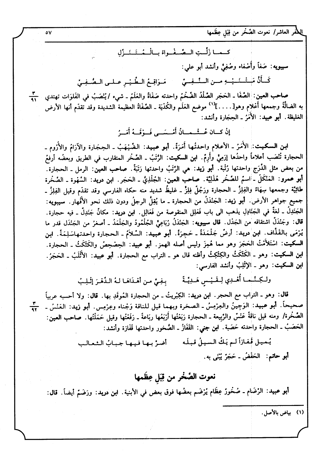 كَمَا زلت الصفواء بالمتنزل سِيبَوَيْهٍ صفا وأصفاء وصفى وَأنْشد أَبُو عَليّ: كَأَن متنيه من النَّفْي مواقع الطير على الصفي صَاحب الْعين الصَّفَا - الْحجر الصَّاد الضخم واحدته صفاةً وَالْعلم - شَيْء ينصب فِي الفلوات تهتدي بِهِ الضَّالة وَجَمعهَا أَعْلَام وَهُوَ مَوضِع الْعلم والكدية - الصفاة الْعَظِيمَة الشَّدِيدَة وَقد تقدم أَنَّهَا الأَرْض الغليظة أَبُو عبيد الْأَمر - الْحِجَارَة وَأنْشد: إِن كَانَ عُثْمَان أَمْسَى فَوْقه أَمر ابْن السّكيت الْأَمر - الْأَعْلَام واحدتها أمرة أَبُو عبيد الضيهب - الْحِجَارَة والآرام والأروم - الْحِجَارَة تنصب أعلاماً وَاحِدهَا إرمى وأرم ابْن السّكيت الرتب - الصخر المتقارب فِي الطَّرِيق وَبَعضه ارْفَعْ من بعض مثل الدرج واحدتها رُتْبَة أَبُو زيد هِيَ الرتب واحدتها رُتْبَة صَاحب الْعين الرمل - الْحِجَارَة أَبُو عَمْرو المنكل - اسْم للصخر هذلية صَاحب الْعين الجلذي - الْحجر ابْن دُرَيْد السهوة - الصَّخْرَة طائية وَجَمعهَا سهاء والفلز - الْحِجَارَة وَرجل فلز - غليظ شَدِيد مِنْهُ حكاء الْفَارِسِي وَقد تقدم وَقيل الفلز - جَمِيع جَوَاهِر الأَرْض أَبُو زيد الجندل من الْحِجَارَة - مَا يقل الرجل وَدون ذَلِك نَحْو الأفهار سِيبَوَيْهٍ الجندل - لُغَة فِي الجنادل يذهب إِلَى بَاب فعلل المنقوصة من فعالل ابْن دُرَيْد مَكَان جندل - فِيهِ حِجَارَة قَالَ وجندل اشتقاقه من الجدل قَالَ سِيبَوَيْهٍ الجندل رباعي الجلمود والجلمد - أَصْغَر من الجندل قدر مَا يرْمى بالقذاف ابْن دُرَيْد أَرض جلمدة - حجرَة أَبُو عبيد السَّلَام - الْحِجَارَة واحدتها سَلمَة ابْن السّكيت استلأمت الْحجر وَهُوَ مِمَّا همز وَلَيْسَ أَصله الْهَمْز أَبُو عبيد الحصحص والكثكث - الْحِجَارَة ابْن السّكيت وَهُوَ - الكثكث والمكثكث وَأَظنهُ قَالَ هُوَ - التُّرَاب مَعَ الْحِجَارَة أَبُو عبيد الأثلب - الْحجر ابْن السّكيت وَهُوَ - الأثلب وَأنْشد الْفَارِسِي: وكنما أهْدى لقيس هَدِيَّة بَقِي من أهداها لَهُ الدَّهْر إثلب قَالَ وَهُوَ - التُّرَاب مَعَ الْحجر ابْن دُرَيْد الكبريت - من الْحِجَارَة الموقد بهَا قَالَ وَلَا أَحْسبهُ عَرَبيا صَحِيحا أَبُو عبيد الوجين والعرمس - الصَّخْرَة وَبِهِمَا قيل للناقة وجناء وعرمس أَبُو زيد العنس - الصَّخْرَة وَمِنْه قيل ناقةٌ عنسٌ والربيعة - الْحِجَارَة ربعتها أربعها رباعةٌ - رفعتها وَقيل حملتها صَاحب الْعين الحصب - الْحِجَارَة واحدته حصبة ابْن جني القفاز - الصخور واحدتها قفازة وَأنْشد: يمِيل قفازاً لم يَك السَّيْل قبله أضربها فِيهَا جباب الثعالب أَبُو حَاتِم الحفض - حجر يبْنى بِهِ