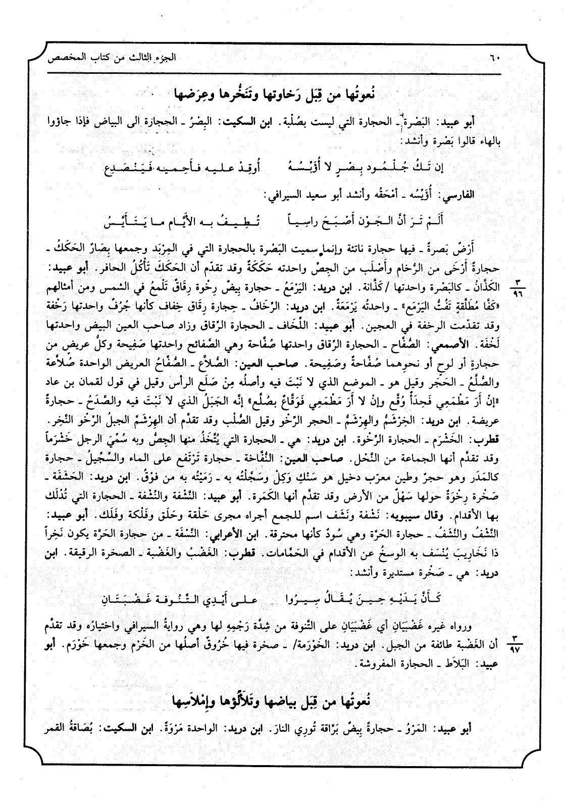 أَبُو عبيد الْبَصْرَة - الْحِجَارَة الَّتِي لَيست بصلبة ابْن السّكيت الْبَصَر - الْحِجَارَة إِلَى الْبيَاض فإّا جاؤوا بِالْهَاءِ قَالُوا بصرة وَأنْشد: إِن تَكُ جلمود بصر لَا أوبه أوقد عَلَيْهِ فأحميه فينصدع الْفَارِسِي أويه - أمحقه وَأنْشد أَبُو سعيد السيرافي: ألم تَرَ أَن الجون أصبح راسياً تطيف بِهِ الأبام مَا يتأيس أَرض بصرة - فِيهَا حِجَارَة ناتئة وَإِنَّمَا سميت الْبَصْرَة بِالْحِجَارَةِ الَّتِي فِي المربد وَجَمعهَا بصار الحكك - حِجَارَة أرْخى من الرخام وأصلب من الجص واحدته حككة وَقد تقدم أَن الحكك تَأْكُل الْحَافِر أَبُو عبيد الكذان - كالبصرة واحدتها كذانة ابْن دُرَيْد اليرمع - حِجَارَة بيض رخوة تلمع فِي الشَّمْس وَمن أمثالهم (كفا مطلقةٍ تفت اليرمع) واحدته يرمعة ابْن دُرَيْد الرخاف - حِجَارَة رقاق خفاف كَأَنَّهَا جرفٌ واحدتها رخفة وَقد تقدّمت الرخفة فِي الْعَجِين أَبُو عبيد اللخاف - الْحِجَارَة الرقَاق وَزَاد صَاحب الْعين الْبيض واحدتها لخفة الْأَصْمَعِي الصفاح - الْحِجَارَة الرقَاق واحدتها صفاحة وَهِي الصفائح واحدتها صفيحة وكل عريض من حِجَارَة أَو لوح أَو نَحْوهمَا صفاحةٌ وصفيحة صَاحب الْعين الصلاع - الصفاح العريض الْوَاحِدَة صلاعة والصلع - الْحجر وَقيل هُوَ - الْموضع الَّذِي لَا نبت فِيهِ وَأَصله من صلع الرَّأْس وَقيل فِي قَول لُقْمَان ابْن عَاد: (إِن أر مطمعي فحدا وَقع وَإِن لَا أر مطمعي فوقاع بصلع) إِنَّه الْجَبَل الَّذِي لَا نبت فِيهِ والصدح - حِجَارَة عريضة ابْن دُرَيْد الخرشم والهرشم - الْحجر الرخو وَقيل الصلب وَقد تقدم أَن الهرشم الْجَبَل الرخو النخر قطرب الخشرم - الْحِجَارَة الرخوة ابْن دُرَيْد هِيَ - الْحِجَارَة الَّتِي يتَّخذ مِنْهَا الجص وَبِه سمي الرجل خشرماً وَقد تقدم أَنَّهَا الْجَمَاعَة من النَّحْل صَاحب الْعين النفاخة - حِجَارَة ترْتَفع على المَاء والسحبيل - حِجَارَة كالمدر وَهُوَ حجر وطين مُعرب دخيل هُوَ سنك وكل وسجلته بِهِ - رميته بِهِ من فَوق ابْن دُرَيْد الْحَشَفَة - صَخْرَة رخوة حولهَا سهل من الأَرْض وَقد تقدم أَنَّهَا الكمرة أَبُو عبيد النشفة والنشفة - الْحِجَارَة الَّتِي تدلك بهَا الْأَقْدَام وَقَالَ سِيبَوَيْهٍ نشفة ونشف اسْم للْجَمِيع أجراه مجْرى حَلقَة وَحلق وفلكة وفلك أَبُو عبيد النشف والنشف - حِجَارَة الْحرَّة وَهِي سود كَأَنَّهَا محترقة ابْن الْأَعرَابِي النسفة - من حِجَارَة الْحرَّة يكون نخراً ذَا نخاريب ينسف بِهِ الْوَسخ عَن الْأَقْدَام فِي الحمامات قطرب الْغَضَب والغضبة - الصَّخْرَة الرقيقة ابْن دُرَيْد هِيَ - صَخْرَة مستديرة وأنشدك كَأَن يَدَيْهِ حِين يُقَال سِيرُوا على أَيدي التنوفة غضبتان وَرَوَاهُ غَيره غضبيان أَي غضبيان على التنوفة من شدَّة رجمه لَهَا وَهِي رِوَايَة السيرافي واختياره وقدتقدم أَن الغضبة طَائِفَة من الْجَبَل ابْن دُرَيْد الخورمة - ضخرة فِيهَا خروق أَصْلهَا من الخرم وَجَمعهَا خروم أَبُو عبيد البلاط - الْحِجَارَة المفروشة