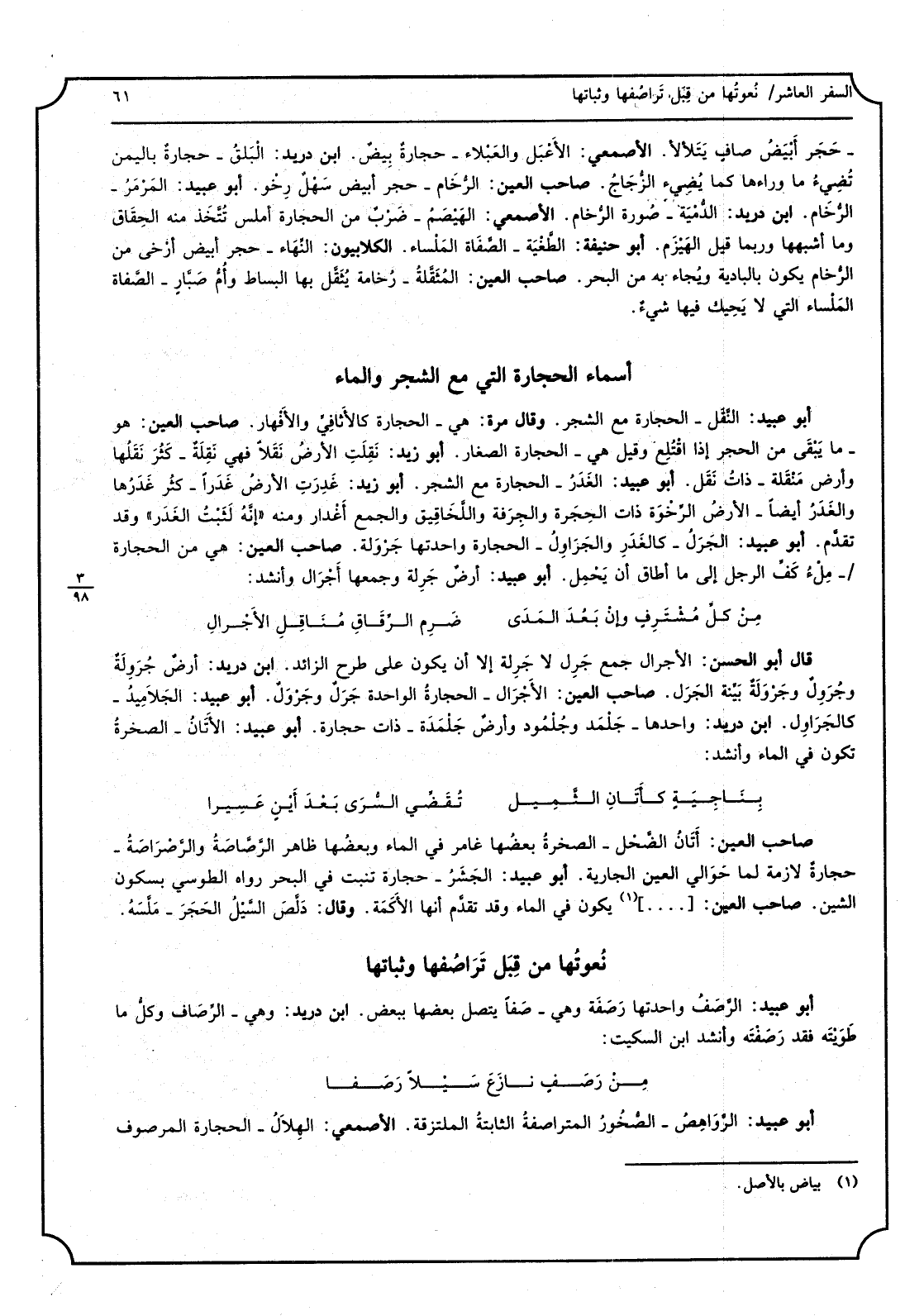 أَبُو عبيد النَّقْل - الْحِجَارَة مَعَ الشّجر وَقَالَ مرّة هِيَ - الْحِجَارَة كالأثافي والأفهار صَاحب الْعين هُوَ - مَا يبْقى من الْحجر إِذا اقتلع وَقيل هِيَ - الْحِجَارَة الصغار أَبُو زيد نقلت الأَرْض نقلا فَهِيَ نقلة - كثر نقلهَا وَأَرْض منقلة - ذَات نقل أَبُو عبيد الْغدر - الْحِجَارَة مَعَ الشّجر أَبُو زيد غدرت الأَرْض غدراً - كثر غدرها والغدر أَيْضا - الأَرْض الرخوة ذَات الْحُجْرَة والجرفة واللخاقيق وَالْجمع أغدار وَمِنْه (إِنَّه لثبت الْغدر) وَقد تقدم أَبُو عبيد الجرل - كالغدر والجراول - الْحِجَارَة واحدتها جرولة صَاحب الْعين هِيَ منالحجارة - ملْء كف الرجل إِلَى مَا أطَاق أَن يحمل أَبُو عبيد أَرض جرلة وَجَمعهَا أجرال وَأنْشد: من كل مشترف وَإِن بعد المدى ضرم الرقَاق مناقل الأجرال قَالَ أَبُو الْحسن الأجرال جمع جرل لَا جرلة إِلَّا أَن يكون على طرح الزَّائِد ابْن دُرَيْد أَرض جرولة وجرول وجرولة بَيِّنَة الجرل صَاحب الْعين الأجرال - الْحِجَارَة الْوَاحِدَة جرل وجرول أَبُو عبيد الجلاميد - كالجراول ابْن دُرَيْد وَاحِدهَا - جلمد وجلمود وَأَرْض جلمدة - ذَات حِجَارَة أَبُو عبيد الأتان - الصَّخْرَة تكون فِي المَاء وَأنْشد: بناجية كأتان الثميل تقضي السرى بعد أَيْن عسيرا صَاحب الْعين أتان الضحل - الصَّخْرَة بَعْضهَا غامر فِي المَاء وَبَعضهَا ظَاهر الرصاصة والرصراصة - حِجَارَة لَا زمة لما حوالي الْعين الْجَارِيَة أَبُو عبيد الجشر - حِجَارَة تنْبت فِي الْبَحْر رَوَاهُ الطوسي بِسُكُون الشين صَاحب الْعين يكون فِي المَاء وَقد تقدم أَنَّهَا الأكمة وَقَالَ دلص السَّيْل الْحجر - ملسه