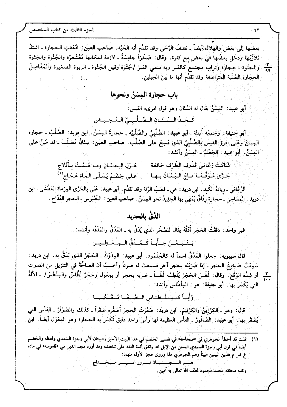 أَبُو عبيد المسن يُقَال لَهُ السنان وَهُوَ قَول امْرِئ الْقَيْس: كَحَد السنان الصلبي النحيض أَبُو حنيفَة وَجمعه أسنة أَبُو عبيد الصلبي والصلبية - حِجَارَة المسن ابْن دُرَيْد الصلب - حِجَارَة المسن وعنى امْرُؤ الْقَيْس بالصلبي الَّذِي مسح على الصلب صَاحب الْعين سِنَان مصلب - قد سنّ على المسن أَبُو عبيد الخضم - المسن وَأنْشد: شاكت رغامى قذوف الطّرف خائفة هول الْجنان وَمَا هَمت بادلاج حرى موقعة ماج البنان بهَا على خضم يسقى المَاء عجاج الرغامى - زِيَادَة الكبد ابْن دُرَيْد هِيَ - قصب الرئة وَقد تقدم أَبُو عبيد عَنى بالحرى المرماة العطشى ابْن دُرَيْد المساحن - حِجَارَة رقاق يمهى بهَا الْحَدِيد نَحْو المسن صَاحب الْعين الخنبوس - الْحجر القداح