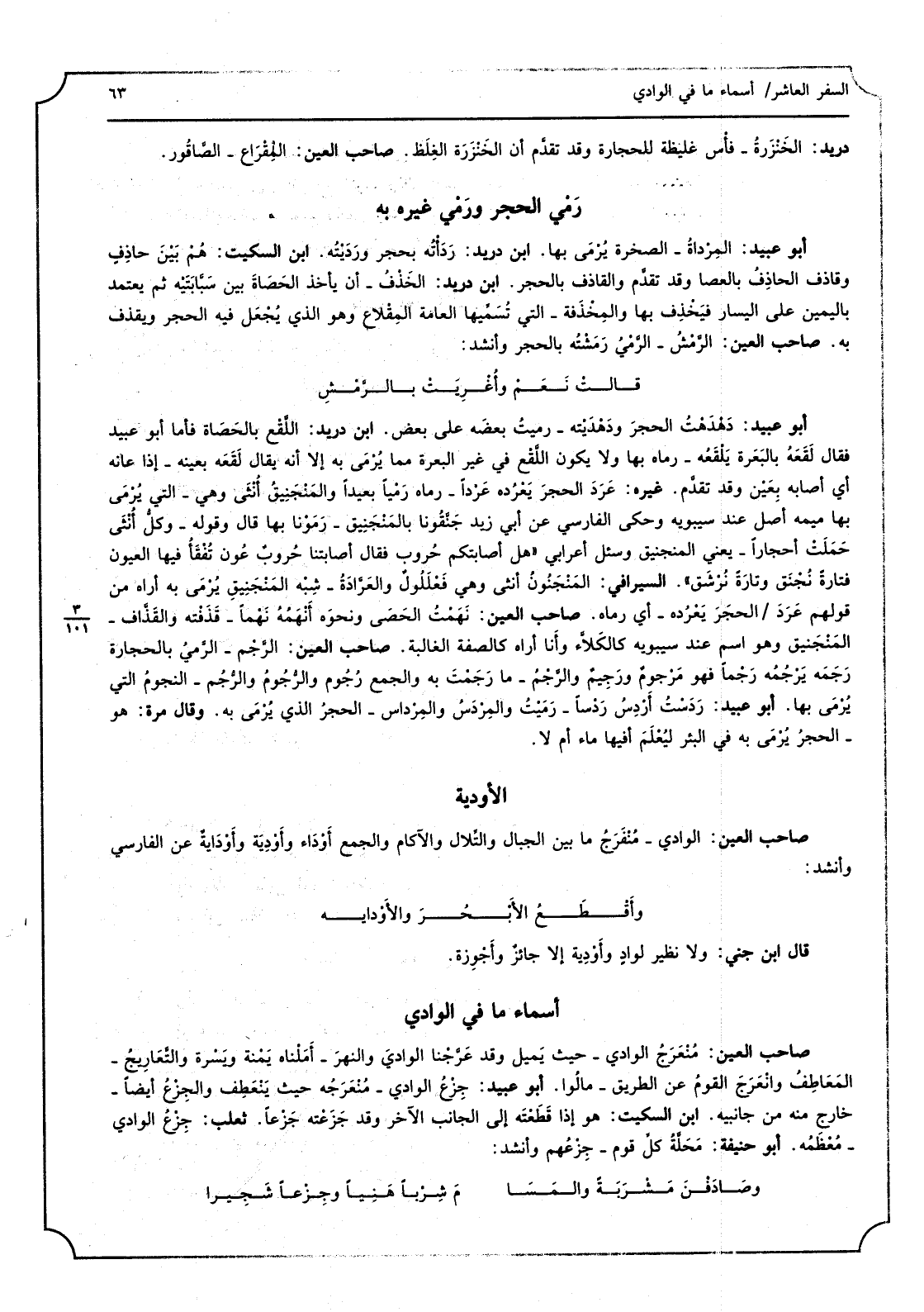 صَاحب الْعين الْوَادي - منفرج مَا بَين الْجبَال والتلال والآكام وَالْجمع أوداء وأودية عَن الْفَارِسِي وَأنْشد: وأقطع الأبحر والأودية قَالَ ابْن جني وَلَا نَظِير لوادٍ وأودية الأجائز وأجوزة
