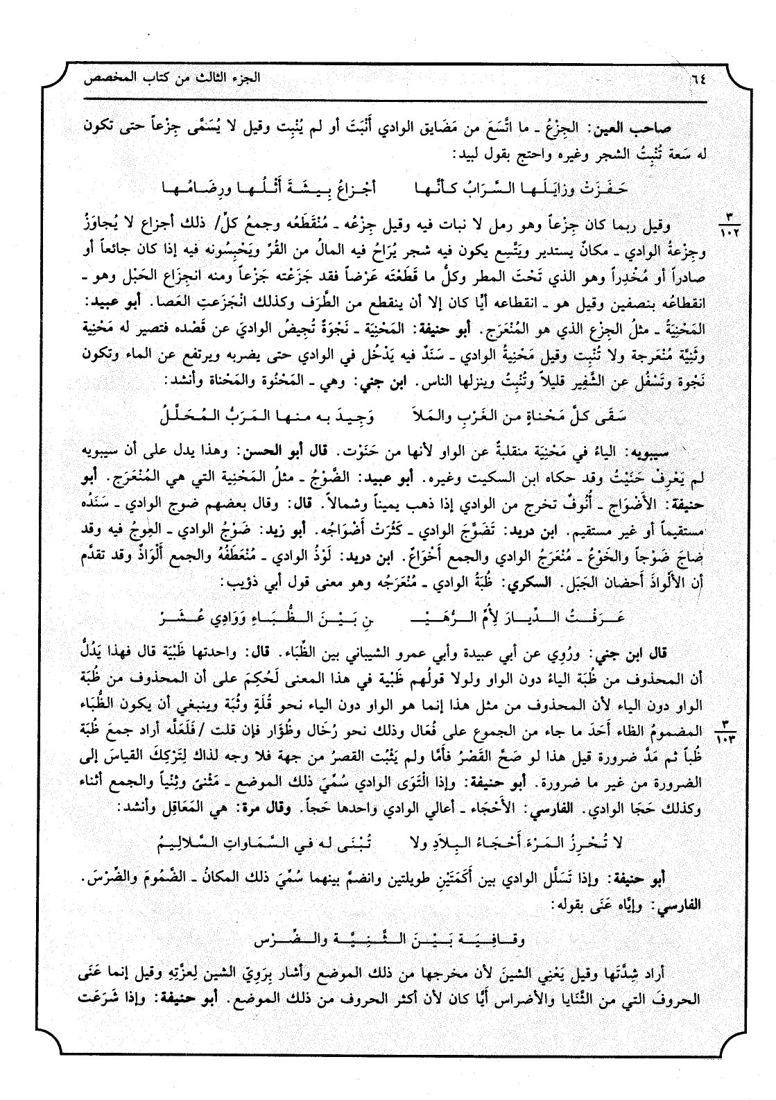 صَاحب الْعين الْجزع - مَا اتَّسع من مضايق الْوَادي أنبت أَو لم ينْبت وَقيل لَا يُسمى جزعاً حَتَّى تكون لَهُ سَعَة تنْبت الشّجر وَغَيره وَاحْتج بقول لبيد: حفزت وزايلها السراب كَأَنَّهَا أجزاع بيشة أثلها ورضامها وَقيل رُبمَا كَانَ جزعاً وَهُوَ رمل لَا نَبَات فِيهِ وَقيل جزعه - منقطعه وَجمع كل ذَلِك أجزاع لَا يُجَاوز وجزعة الْوَادي - مَكَان يستدير ويتسع يكون فِيهِ شجر يراح فِيهِ المَال من القر ويحبسونه فِيهِ إِذا كَانَ جائعاً أَو صادراً أَو مخدراً وَهُوَ الَّذِي تَحت الْمَطَر وكل مَا قطعته عرضا فقد جزعته جزعاً وَمِنْه انجزاع الْحَبل وَهُوَ - انْقِطَاعه بنصفين وَقيل هُوَ - انْقِطَاعه أيا كَانَ إِلَّا أَن يَنْقَطِع من الطّرف وَكَذَلِكَ انجزعت الْعَصَا أَبُو عبيد المحنية - مثل الْجزع الَّذِي هُوَ المنعرج أَبُو حنيفَة المحنية - نجوة تجيض الْوَادي عَن قَصده فَتَصِير لَهُ محنية وثنية منعرجة وَلَا نبت وَقيل محنية الْوَادي - سَنَد فِيهِ يدْخل فِي الْوَادي حَتَّى يضْربهُ ويرتفع عَن المَاء وَتَكون نجوة وتسفل عَن الشفير قَلِيلا وتنبت وينزلها النَّاس ابْن جني وَهِي - المحنوة والمحناة وَأنْشد: سقى كل محناة من الغرب والملا وجيد بِهِ مِنْهَا المرب الْمُحَلّل سِيبَوَيْهٍ الْيَاء فِي محنية منقلبة عَن الْوَاو لِأَنَّهَا من حنوت قَالَ أَبُو الْحسن وَهَذَا يدل على أَن سِيبَوَيْهٍ لم يعرف حنيت وَقد حَكَاهُ ابْن السّكيت وَغَيره أَبُو عبيد الضوح - مثل المحنية الَّتِي هِيَ المنعرج أَبُو حنيفَة الأضواح - أنوف تخرج من الْوَادي إِذا ذهب يَمِينا وَشمَالًا قَالَ وَقَالَ بَعضهم ضوح الْوَادي - سَنَده مُسْتَقِيمًا أَو غير مُسْتَقِيم ابْن دُرَيْد تضوج الْوَادي - كثرت أضواجه أَبُو زيد ضوج الْوَادي - العوج فِيهِ وَقد ضاج ضوجاً والخموع - منعرج الْوَادي وَالْجمع أخواع ابْن دُرَيْد لوذ الْوَادي - منعطفه وَالْجمع ألواذ وَقد تقدم أَن الالواذ أحضان الْجَبَل السكرِي ظبة الْوَادي - منعرجه وَهُوَ قَول أبي ذُؤَيْب: عرقت الديار لَام الرهي ن بَين الظباء ووادي عشر قَالَ ابْن جني وروى عَن أبي عُبَيْدَة وَأبي عَمْرو الشَّيْبَانِيّ بَين الظباء قَالَ واحدتها ظَبْيَة قَالَ فَهَذَا يدل أَن الْمَحْذُوف من ظبة الْيَاء دون الْوَاو وَلَوْلَا قَوْلهم ظَبْيَة فِي هَذَا الْمَعْنى لحكم على أَن الْمَحْذُوف من ظبة الْوَاو دون الْيَاء لآن الْمَحْذُوف من مثل هَذَا إِنَّمَا هُوَ الْوَاو دون الْيَاء نَحْو قلةٍ وثبة وَيَنْبَغِي أَن يكون الظباء المضموم الظَّاء أحد مَا جَاءَ من الجموع على فعال وَذَلِكَ نَحْو رخال وظؤار فَإِن قلت فَلَعَلَّهُ أَرَادَ جمع ظبة ظباً ثمَّ مد ضَرُورَة قيل هَذَا لَو صَحَّ الْقصر فَأَما وَلم يثبت الْقصر من جِهَة فَلَا وَجه لذاك لتركك الْقيَاس إِلَى الضَّرُورَة من غير مَا ضَرُورَة أَبُو حنيفَة وَإِذا التوى الْوَادي سمي ذَلِك الْموضع - مثنى وثنياً وَالْجمع أثْنَاء وَكَذَلِكَ حجا الْوَادي الْفَارِسِي الأحجاء - أعالي الْوَادي وَاحِدهَا حجا وَقَالَ مرّة هِيَ المعاقل وَأنْشد: لَا تحرز الْمَرْء أحجاء الْبِلَاد وَلَا تبني لَهُ فِي السَّمَوَات السلاليم أَبُو حنيفَة وَإِذا تسلل الْوَادي بَين أكمتين طويلتين وانضم بَينهمَا سمي ذَلِك الْمَكَان - الضموم والضرس الْفَارِسِي وإياه عَنى بقوله: وقافية بَين الثَّنية والضرس أَرَادَ شدتها وَقيل يَعْنِي الشين لِأَن مخرجها من ذَلِك الْموضع وَأَشَارَ بروي الشين لعزته وَقيل إِنَّمَا عنىالحروف الَّتِي من الثنايا والأضراس أيا كَانَ أَكثر الْحُرُوف من ذَلِك الْموضع أَبُو حنيفَة وَإِذا شرعت