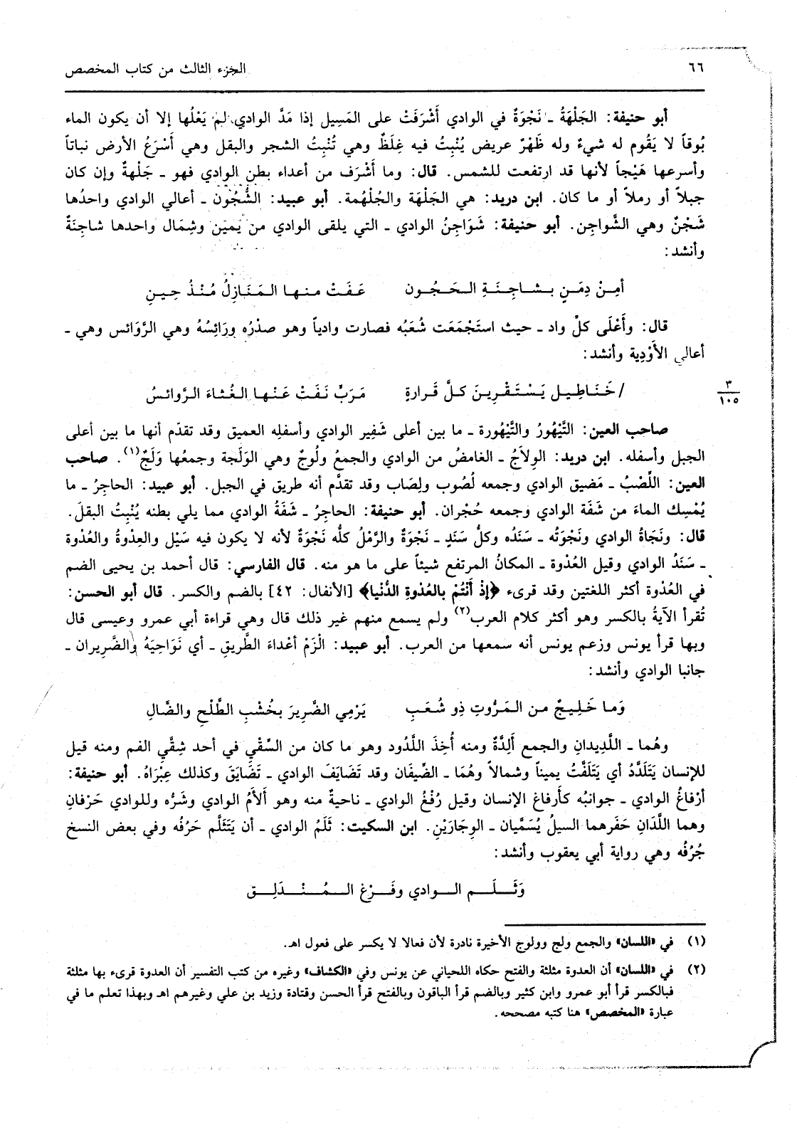 أَبُو حنيفَة الجلهة - نجوة فِي الْوَادي أشرفت على المسيل إِذا مد الْوَادي لم يعلها إِلَّا أَن يكون المَاء بوقاً لَا يقوم لَهُ شَيْء وَله ظهر عريض ينْبت فِيهِ غلظ وَهِي تنْبت الشّجر والبقل وَهِي أسْرع الأَرْض نباتاً وأسرعها هيجاً لِأَنَّهَا قد ارْتَفَعت للشمس قَالَ وَمَا أشرف من أَعدَاء بطن الْوَادي فَهُوَ - جلهة وَإِن كَانَ جبلا أَو رملاً أَو مَا كَانَ ابْن دُرَيْد هِيَ الجلهة والجلهمة أَبُو عبيد الشجون - اعالي الْوَادي وَاحِدهَا شجن وَهِي الشواجن أَبُو حنيفَة شواجن الْوَادي - الَّتِي يلقى الْوَادي من يَمِين وشمال وَاحِدهَا شاجنة وَأنْشد: امن دمن بشاجنة الْحجُون عفت مِنْهَا الْمنَازل مندحين قَالَ وَأَعْلَى كل وَاد - حَيْثُ استجمعت شعبه فَصَارَت وَاديا وَهُوَ صَدره وَرَائه وَهِي الروائس وَهِي - أعلي الأودية وَأنْشد: خناطيل يستقرين كل قرارةٍ مرب نفت عَنْهَا الغثاء الروائس صَاحب الْعين التيهور والتيهورة - مَا بَين أَعلَى شَفير الْوَادي وأسفله العميق وَقد تقدم أَنَّهَا مَا بَين أَعلَى الْجَبَل وأسفله ابْن دُرَيْد الولاج - الغامض من الْوَادي وَالْجمع ولوج وَهِي الولجة وَجَمعهَا ولج صَاحب الْعين اللصب - مضيق الْوَادي وَجمعه لصوب ولصاب وَقد تقدم أَنه طَرِيق فِي الْجَبَل أَبُو عبيد الحاجر - مَا يمسك المَاء من شفة الْوَادي وَجمعه حجران أَبُو حنيفَة الحاجر - شفة الْوَادي مِمَّا يَلِي بَطْنه ينْبت البقل قَالَ وَنَجَاة الْوَادي ونجوته - سَنَده وكل سَنَد - نجوة والرمل كُله نجوة لِأَنَّهُ لَا يكون فِيهِ سيل والعدوة والعدوة - سَنَد الْوَادي وَقيل العدوة - الْمَكَان الْمُرْتَفع شياً على مَا هُوَ مِنْهُ قَالَ الْفَارِسِي قَالَ أَحْمد بن يحيى الضَّم فِي العدوة أَكثر اللغتين وَقد قرئَ (إِذا أَنْتُم بالعدوة الدُّنْيَا) بِالضَّمِّ وَالْكَسْر قَالَ أَبُو الْحسن تقْرَأ الْآيَة بِالْكَسْرِ وَهُوَ أَكثر كَلَام الْعَرَب وَلم يسمع مِنْهُم غير ذَلِك قَالَ وَهِي قِرَاءَة أبي عَمْرو وَعِيسَى قَالَ وَبهَا قَرَأَ يُونُس وَزعم يُونُس أَنه سَمعهَا من الْعَرَب أَبُو عبيد ألزم أَعدَاء الطَّرِيق - أَي نواحيه والضريران - جانبا الْوَادي وَأنْشد: وَمَا خليج من المروت ذُو شعب يرْمى الضَّرِير بخشب الطلح والضال وهما - اللديدان وَالْجمع ألدة وَمِنْه أَخذ اللدود وَهُوَ مَا كَانَ من السَّقْي فِي أحد شقي الْفَم وَمِنْه قيل للانسان يتلدد أَي يتلفت يَمِينا وَشمَالًا وهما - الضيفان وَقد تضايف الْوَادي - تضايق وَكَذَلِكَ عبراه أَبُو حنيفَة أرفاغ الْوَادي - جوانبه كأرفاغ الانسان وَقيل اللدان حفرهما السَّيْل يسميان - الوجارين ابْن السّكيت ثلم الْوَادي - أَن يتثلم حرفه وَفِي بعض النّسخ جرفه وَهِي رِوَايَة أبي يَعْقُوب وَأنْشد: وثلم الْوَادي وَفرغ المندلق