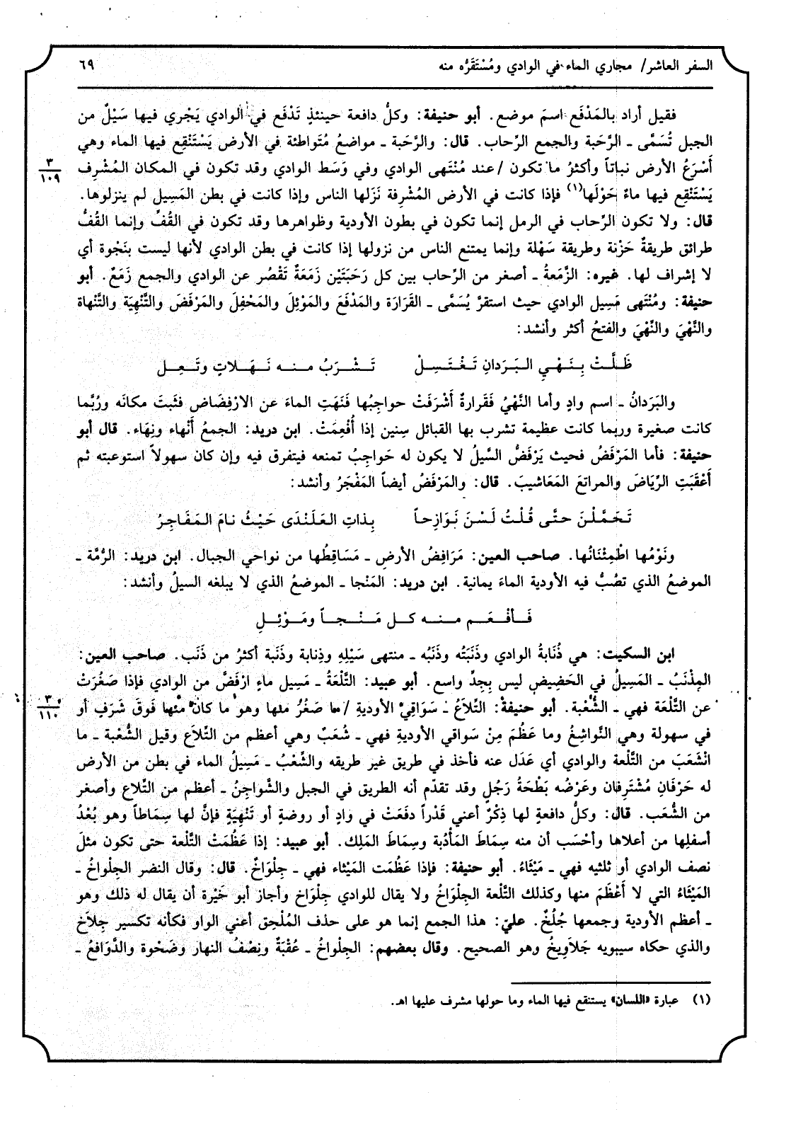 فَقيل أَرَادَ بالمدفع اسْم مَوضِع أَبُو حنيفَة وكل دافعة حِينَئِذٍ تدفع فِي الْوَادي يجْرِي فِيهَا سيل من الْجَبَل تسمى - الرحبة وَالْجمع رحاب قَالَ والرحبة - مَوَاضِع متواطئةة فِي الأَرْض يستنقع فِيهَا المَاء وَهِي أسْرع الأَرْض نباتاً وَأكْثر مَا تكون عِنْد مُنْتَهى الْوَادي وَفِي وسط الْوَادي وَقد تكون فِي الْمَكَان المشرف يستنقع فِيهَا ماءٌ حولهَا فَإِذا كَانَت فِي الأَرْض المشرفة نزلها النَّاس وَإِذا كَانَت فِي بطن المسيل لم ينزلوها قَالَ وَلَا تكون الرحاب فِي الرمل إِنَّمَا تكون فِي بطُون الأودية وظواهرها وَقد تكون فِي القف وَإِنَّمَا القف طرائق طَريقَة حزنة وَطَرِيقَة سهلة وَإِنَّمَا يمْتَنع النَّاس من نُزُولهَا إِذا كَانَت فِي بطن الْوَادي لِأَنَّهَا لَيست بنجوة أَي لَا إشراف لَهَا غَيره الزمعة - أَصْغَر من الرحاب بَين كل رحبتين زَمعَة تقصر عَن الْوَادي وَالْجمع زمع أَبُو حنيفَة ومنتهى مسيل الْوَادي حَيْثُ اسْتَقر يُسمى - القرارة والمدفع والموئل والمحفل والمرفض والتنهية والتنهاة والنهى والنهى والفخ أَكثر وَأنْشد: ظلت بنهى البردان تَغْتَسِل تشرب مِنْهُ نهلات وتعل والبردان - اسْم وادٍ وَأما النهى فقرارةٌ أشرفت حواجبها فنهت المَاء عَن الارفضاض فَثَبت مَكَانَهُ وَرُبمَا كَانَت صَغِيرَة وَرُبمَا كَانَت عَظِيمَة تشرب بهَا الْقَبَائِل سِنِين إِذا أفعمت ابْن دُرَيْد الْجمع أنهاء ونهاء قَالَ أَبُو حنيفَة فَأَما المرفض فَحَيْثُ يرفض السَّيْل لَا يكون لَهُ حواجب تَمنعهُ فَيَتَفَرَّق فِيهِ وَإِن كَانَ سهولا استوعبته ثمَّ أعقبت الرياض والمراتع المعاشيب قَالَ والمرفض أَيْضا المفجر وَأنْشد: تحملن حَتَّى قلت لسن نوازحاً بِذَات العلدي حَيْثُ نَام المفاخر ونومها اطمئنانها صَاحب الْعين مرافض الأَرْض - مساقطها من ناحي الْجبَال ابْن دُرَيْد الرمة - الْموضع الَّذِي تصب فِيهِ الأودية المَاء يَمَانِية ابْن دُرَيْد المنجا - الْموضع الَّذِي لَا يبلغهُ السَّيْل وَأنْشد: فأفعم مِنْهُ كل منجا وموئل ابْن السّكيت هِيَ ذنابة الْوَادي وذنبته وذنبه - مُنْتَهى سيله وذنابة وذنبة أَكثر من ذَنْب صَاحب الْعين المذنب - المسيل فِي الحضيض لَيْسَ بجد وَاسع أَبُو عبيد التلعة - مسيل مَاء ارْفض من الْوَادي فَإِذا صغرت عَن التلعة فَهِيَ - الشعبة أَبُو حنيفَة التلاع - سواقي الأودية مَا صغر مِنْهَا وَهُوَ مَا كَانَ مِنْهَا فَوق شرفٍ أَو فِي سهولة وَهِي النواشغ وَمَا عظم من سواقي الأودية فَهِيَ - شعب وَهِي أعظم منالتلاع وَقيل الشعبة - مَا انشعب من التلعة والوادي أَي عدل عَنهُ فَأخذ فِي طَرِيق غير طَرِيقه والشعب - مسيل المَاء فِي بطن من الأَرْض لَهُ حرفان مشترفان وَعرضه بطحه رجلٍ وَقد تقدم أَنه الطَّرِيق فِي الْجَبَل والشواجن - أعظم من التلاع وأصغر من الشّعب قَالَ وكل دافعة لَهَا ذكر أعنى قدرا دفعت فِي وادٍ أَو رَوْضَة أَو تنهية فَإِن لَهَا سماطاً وه بعد أَسْفَلهَا من أَعْلَاهَا وأحسب أَن مِنْهُ سماط المأدبة وسماط الْملك أَبُو عبيد إِذا عظمت التلعة حَتَّى تكون مثل نصف الْوَادي أَو ثُلثَيْهِ فَهِيَ - ميثاء أَبُو حنيفَة فَإِذا عظمت الميثاء فَهِيَ - جلواخ قَالَ وَقَالَ النَّضر الجلواخ - الميثاء الَّتِي لَا أعظم مِنْهَا وَكَذَلِكَ التلعة الجلواخ وَلَا يُقَال للوادي جلواخ وَأَجَازَ أَبُو خيرة أَن يُقَال لَهُ ذَلِك وَهُوَ - أعظم الأودية وَجَمعهَا جلخ عَليّ هَذَا الْجمع إِنَّمَا هُوَ على حذف الملحق أعنى الْوَاو فَكَأَنَّهُ تكسير جلاخ وَالَّذِي حَكَاهُ سِيبَوَيْهٍ جلاويخ وَهُوَ الصَّحِيح وَقَالَ بَعضهم الجلواخ - عقبَة وَنصف النَّهَار وضحوة والدوافع -