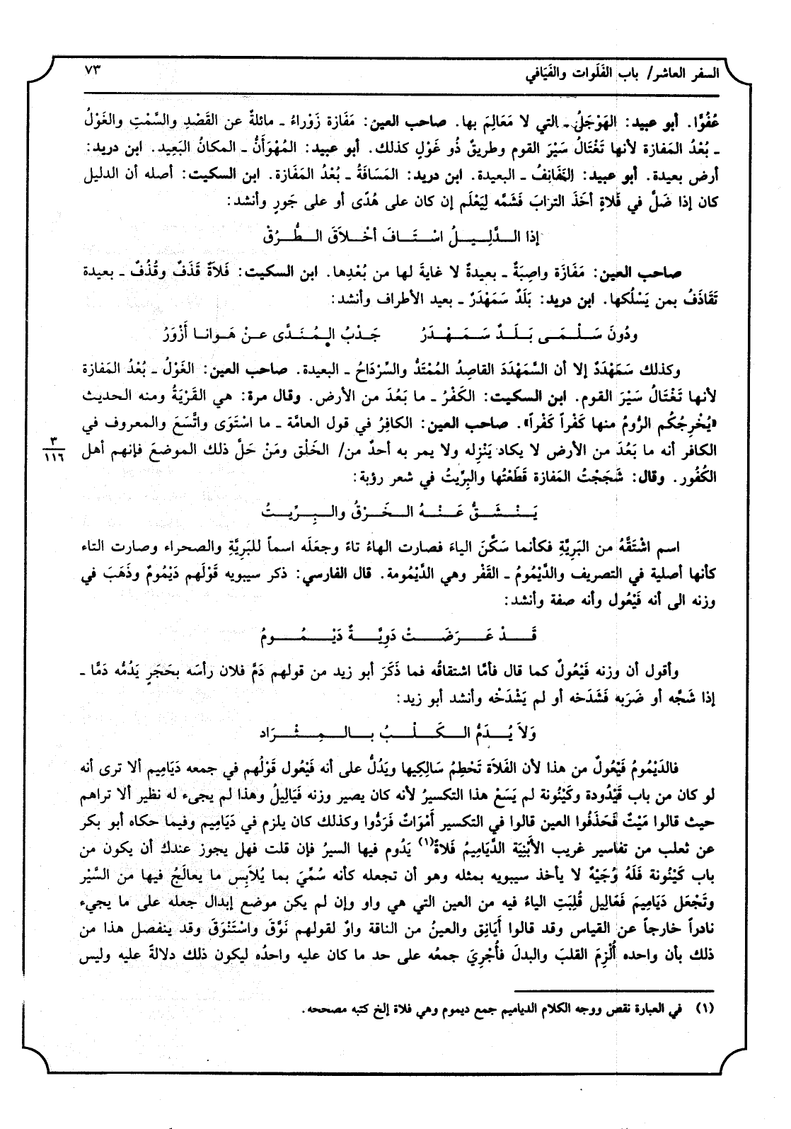 عفوا أَبُو عبيد الهوجل - الَّتِي لَا معالم بهَا صَاحب الْعين مفازة زوراء - مائلة عَن الْقَصْد والسمت والغول - بعد الْمَفَازَة لِأَنَّهَا تغتال سير الْقَوْم وَطَرِيق ذُو غول كَذَلِك أَبُو عبيد المهوأن - الْمَكَان الْبعيد ابْن دُرَيْد أَرض بعيدَة أَبُو عبيد النفانف - الْبَعِيدَة ابْن دُرَيْد الْمسَافَة - بعد الْمَفَازَة ابْن السّكيت أَصله أَن الدَّلِيل كَانَ إِذا ضل فِي فلاة أَخذ التُّرَاب فشمه ليعلم إِن كَانَ على هدى أَو على جورٍ وَأنْشد: إِذا الدَّلِيل استاف أَخْلَاق الطّرق صَاحب الْعين مفازة واصبة - بعيدَة لَا غَايَة لَهَا من بعْدهَا ابْن السّكيت فلاة قذف وَقذف - بعيدَة تقاذف بِمن يسلكها ابْن دُرَيْد بلد سمهدر - بعيد الْأَطْرَاف وَأنْشد: وَدون سلمى بلد سمهدر جَدب المندى عَن هوانا أَزور وَكَذَلِكَ سمهدر إِلَّا أَن السمهدر القاصد الممتد والسرداح - الْبَعِيدَة صَاحب الْعين الغول - بعد الْمَفَازَة لِأَنَّهَا تغتال سير الْقَوْم ابْن السّكيت الْكفْر - مَا بعد من الأَرْض وَقَالَ مرّة هِيَ الْقرْبَة وَمِنْه الحَدِيث (يخرجكم الرّوم مِنْهَا كفرا كفرا) صَاحب الْعين الْكَافِر فِي قَول الْعَامَّة - مَا اسْتَوَى واتسع وَالْمَعْرُوف فِي الْكَافِر أَنه مَا بعد من الأَرْض لَا يكَاد ينزله وَلَا يمر بِهِ أحد من الْخلق وَمن حل ذَلِك الْموضع فانهم أهل الكفور وَقَالَ شججت الْمَفَازَة - قطعتها والبريت فِي شعر رؤبة: ينشق عَنهُ الْخرق والبريت اسْم اشتقه من البربة فَكَأَنَّمَا سكن إِلَيْهِ فَصَارَت الْهَاء تَاء وَجعله اسْما للبرية والصحراء وَصَارَت التَّاء كَأَنَّهَا أَصْلِيَّة فِي التصريف والديموم - القفر وَهِي الديمومة قَالَ الْفَارِسِي ذكر سِيبَوَيْهٍ قَوْلهم ديموم وَذهب فِي وَزنه إِلَى أَنه فيعول وَأَنه صفة وَأنْشد: قد عرضت دوية دموم واقول أَن وَزنه كَمَا قَالَ فَأَما اشتقاقه فَمَا ذكر أَبُو زيد من قَوْلهم دم فلَان رَأسه بحجرٍ يدمه دَمًا - إِذا شجه أَو ضربه فشدخه أَو لم يشدخه وَأنْشد أَبُو زيد: وَلَا يدم الْكَلْب بالمثراد فالديموم فيعول من هَذَا لِأَن الفلاة تحطم سالكيها وَيدل على أَن فيعول قَوْلهم فِي جمعه دياميم أَلا ترى أَنه لَو كَانَ من بَاب قيدودة وكينونة لم يسع هَذَا التكسير لِأَنَّهُ كَانَ يصير وَزنه فياليل وَهَذَا لم يجِئ لَهُ نَظِير أَلا تراهم حَيْثُ قَالُوا ميت فحذفوا الْعين قَالُوا فِي التكسير أموات فَردُّوا وَكَذَلِكَ كَانَ يلْزم فِي دياميم وَفِيمَا حَكَاهُ أَبُو بكر عَن ثَعْلَب من تفاسير غَرِيب الْأَبْنِيَة الدياميم قلاة يَدُوم فِيهَا السّير فان قلت فَهَل يجوز عنْدك أَن يكون من بَاب كينونة فَلهُ وجيه لَا يَأْخُذ سِيبَوَيْهٍ بِمثلِهِ وَهُوَ أَن تَجْعَلهُ كَأَنَّهُ سمي بِمَا يلابس مَا يعالج فِيهَا من السّير وَتجْعَل دياميم فعاليل قلبت الْيَاء فِيهِ من الْعين الَّتِي هِيَ وَاو وان لم يكن مَوضِع ابدال جعله على مَا يَجِيء نَادرا خَارِجا عَن الْقيَاس وَقد قَالُوا أبالق وَالْعين من النَّاقة وَاو لقَولهم نُوق واستنوق وَقد ينْفَصل هَذَا من ذَلِك بِأَن وَاحِد ألزم الْقلب وَالْبدل فَأجرى جمعه على حد مَا كَانَ عَلَيْهِ واحده ليَكُون ذَلِك دلَالَة عَلَيْهِ وَلَيْسَ