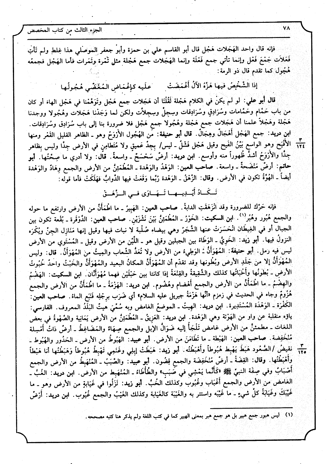 فَإِنَّهُ قَالَ وَاحِد الهجلات هجل قَالَ أَبُو الْقَاسِم عَليّ بن حَمْزَة وَأَبُو جَعْفَر الْموصِلِي هَذَا غلط وَلم تأت فعلات جمع فعل وَإِنَّمَا تَأتي جمع فعلة وَإِنَّمَا الهجلات جمع هجلة مثل تَمْرَة وتمرات فَأَما الهجل فَجَمعه هجول كَمَا تقدم قَالَ ذُو الرمة: إِذا الشَّخْص فِيهَا هزه الْآل أغمضت عَلَيْهِ كاغماض المغضي هجولها قَالَ أَبُو عَليّ لَو لم يكن فِي الْكَلَام هجلة لقلنا أَن هجلات جمع هجل وتوهمنا فِي هجل الْهَاء أَو كَانَ من بَاب حمام وحمامات وسرادق وسرادقات وسجل وسجلات وَلَكِن لما وجدنَا هجلات وهجولا وَوجدنَا هجلة وهجلاً علما أَن هجلات جمع هجلة وهجولا جمع هجل فَلَا ضَرُورَة بن إِلَى بَاب سرادق وسرادقات ابْن دُرَيْد جمع هجل اهجال وهجال قَالَ أَبُو حنيفَة من الهجول الآروح وَهُوَ - الظَّاهِر الفليل الفعر وَمِنْهَا الأفيج وَهُوَ الْوَاسِع بَين الفيح وَقيل هجل فشل - لَيْسَ بجد عميق وَلَا متطامن فِي الأَرْض جدا وَلَيْسَ بِظَاهِر جدا والآروع أَشد ظهوراً مِنْهُ وأوسع ابْن دُرَيْد أَرض سحسح - وَاسِعَة قَالَ وَلَا أَدْرِي مَا صِحَّتهَا أَبُو حَاتِم أَرض منضحة - وَاسِعَة صَاحب الْعين الوهد والوهدة - المطمئن من الأَرْض وَالْجمع وهاد والوهدة أَيْضا - الهوة تكون فِي الأَرْض وَقَالَ الزهق - الوهدة رُبمَا وَقعت فِيهَا الدَّوَابّ فَهَلَكت فَأَما قَوْله: تكَاد أيديها تهاوى فِي الزهق فَإِنَّهُ حرك للضَّرُورَة وَقد انزهقت الدَّابَّة صَاحب الْعين الهبير - مَا اطْمَأَن من الأَرْض وارتفع مَا حوله وَالْجمع هبور وهبر ابْن السّكيت الخور - المطمئن بَين نشزين صَاحب الْعين الدوقرة - بقْعَة تكون بَين الْجبَال أَو فِي الْغِيطَان انحسرت عَنْهَا الشّجر وَهِي بَيْضَاء صلبة لَا نَبَات فِيهَا وَقيل إِنَّهَا منَازِل الْجِنّ وَيكرهُ النُّزُول فِيهَا أَبُو زيد الخوى - الوطاء بَين الجبلين وَقيل هُوَ - اللين من الأَرْض وَقيل - المستوى من الأَرْض لَيْسَ فِيهِ رمل أَبُو حنيفَة المهوأن - الوطئ من الأَرْض ةلا تعد الشعاب والميث من المهوأن قَالَ وَلَيْسَ المهوأن إِلَّا من جلد الأَرْض وبطونها وَقد تقدم أَن المهوأن الْمَكَان الْبعيد والمهوأن والخبت وَاحِد خبوت الأَرْض - بطونها وأخبأتها كَذَلِك والشقيقة والقنعة إِذا كَانَتَا بَين جبلين فهما مهوأنان ابْن السّكيت الهضم والهضم - مااطمأن من الأَرْض وَالْجمع أهضام وهضوم ابْن دُرَيْد الهزمة - مااطمأن من الرض وَالْجمع هزوم وَجَاء فِي الحَدِيث فِي زَمْزَم (إِنَّهَا هزمة جِبْرِيل عَلَيْهِ السَّلَام) أَي ضرب برجاه فنبع المَاء صَاحب الْعين الْكَفَرَة - الوهدة المستديرة ابْن دُرَيْد الهيت - الْموضع الغامض وَبِه سمي هيت الْبَلَد الْمَعْرُوف الْفَارِسِي ياؤه منقلبة عَن وَاو من الهوتة وَهِي الوهدة ابْن دُرَيْد العريق - المطمئن من الأَرْض يَمَانِية والصهوة فِي بعض اللُّغَات - مطمئن من الأَرْض غامض تلجأ اليه ضوال الابل وَالْجمع صهاء والمضاغط - أَرض ذَات أمسلة منخفضة صَاحب الْعين الهبطة - مَا تطامن من الأَرْض أَبُو عبيد الهبوط من الأَرْض - الحدور والهبوط - نقيض الصعُود هَبَط يهْبط هبوطاً وأهبطته أَبُو زيد هَبَطت إبلي وغنمي تهبط هبوطاً وهبطتها أَنا هبطاً وأهبطتها قَالَ القضة - أَرض منخفضة وَالْجمع قضون أَبُو عبيد والصبب - المنهبط من الأَرْض وَالْجمع أصباب وَفِي صفة النَّبِي صلى الله عَلَيْهِ وَسلم (كَأَنَّمَا يمشي فِي صبب) والطأطاء - المنهبط من الأَرْض ابْن دُرَيْد الغب - الغامض من الأَرْض وَالْجمع أغباب وغبوب وَكَذَلِكَ الخب أَبُو زيد نزلُوا فِي غبابة من الأَرْض وَهُوَ - مَا غيبك وغيابة كل شَيْء - مَا غيبته واستتر بِهِ والغيبة كالغيابة وَكَذَلِكَ الْغَيْب وَالْجمع غيوب ابْن دُرَيْد أَرض