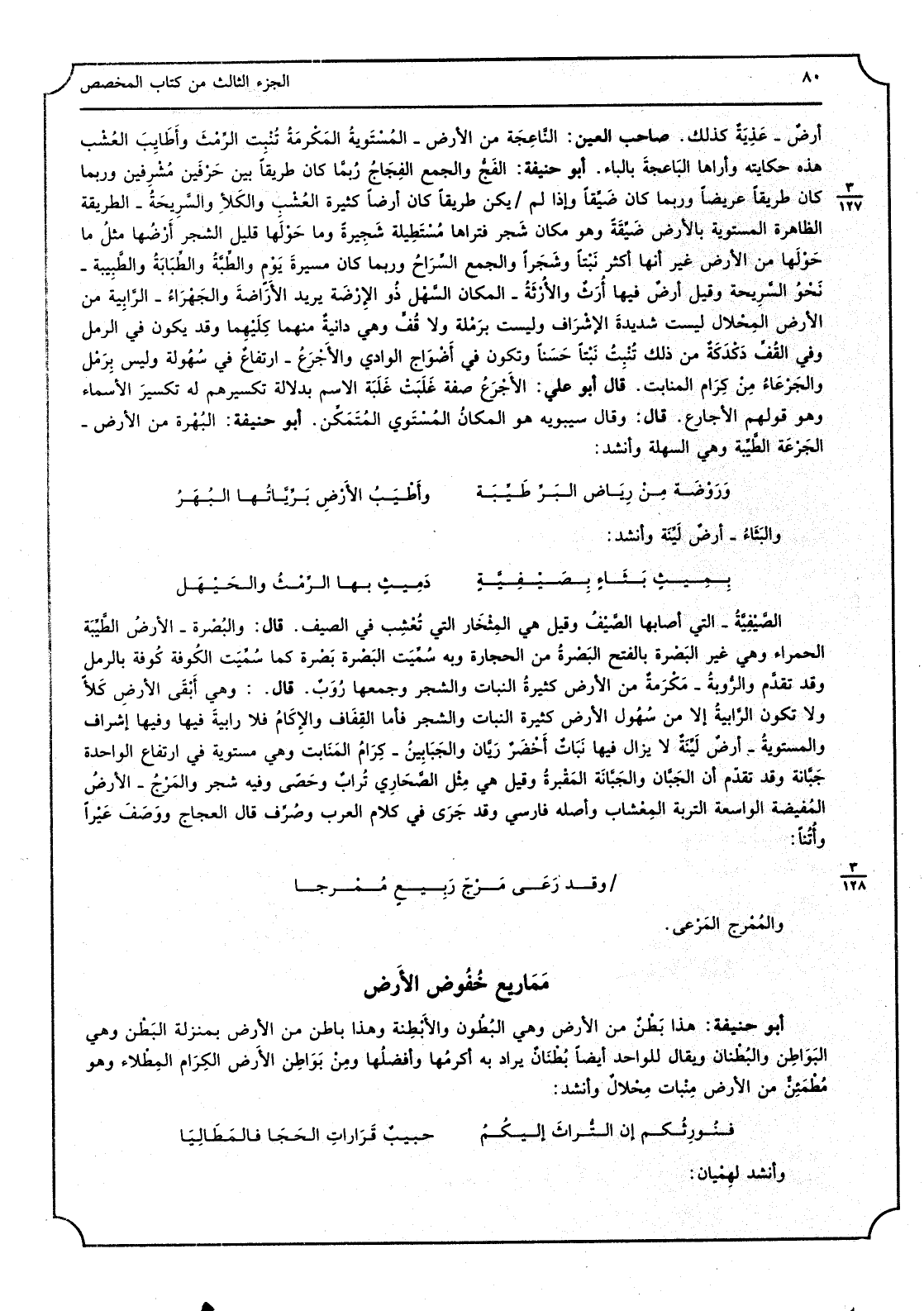 أَرض - عذبة كَذَلِك صَاحب الْعين الناعجة من الأَرْض - المستوية المكرمة تنْبت الرمث وأطايب العشب هَذِه حكايته وأراها الباعجة بِالْبَاء أَبُو حنيفَة الْفَج وَالْجمع الفجاج رُبمَا كَانَ طَرِيقا بَين حرفين مشرفين وَرُبمَا كَانَ طَرِيقا عريضاً وَرُبمَا كَانَ ضيقا وَإِذا لم يكن طَرِيقا كَانَ أَرضًا كَثِيرَة العشب والكلأ والسريحة - الطَّرِيقَة الظَّاهِرَة المستوية بِالْأَرْضِ ضيقَة وَهُوَ مَكَان شجر فتراها مستطيلة شجيرة وَمَا حولهَا قَلِيل الشّجر أرْضهَا مثل مَا حولهَا من الأَرْض غير أَنَّهَا أَكثر نبتاً وشجراً وَالْجمع السراح وَرُبمَا كَانَ مسيرَة يومٍ والطبة والطبابة والطبيبة - نَحْو السريحة وَقيل أَرض فِيهَا أرث والأرثة - الْمَكَان السهل ذُو الأرضة يُرِيد الأراضة والجهراء - الرأبية من الأَرْض المحلال لَيست شَدِيدَة الاشراف وَلَيْسَت برملة وَلَا قف وَهِي دانية مِنْهُمَا كليهمَا وَقد يكون فِي الرمل وَفِي القف دكدكة من ذَلِك تنْبت نبتاً حسنا وَتَكون فِي أضواج الْوَادي والأجرع - ارْتِفَاع فِي سهولة وَلَيْسَ برمل والجرعاء من كرام المنابت قَالَ أَبُو عَليّ الأجرع صفة غلبت غَلَبَة الِاسْم بِدلَالَة تكسيرهم لَهُ تكسير الاسماء وَهُوَ قَوْلهم الأجارع قَالَ وَقَالَ سِيبَوَيْهٍ هُوَ الْمَكَان المستوي المتمكن أَبُو حنيفَة البهرة من الأَرْض - الجرعة الطّيبَة وَهِي السهلة وَأنْشد: وروضة من رياض الْبر طيبَة وَأطيب الأَرْض برياتها البهر وَالْبناء - أَرض لينَة وَأنْشد: بميث بثاءٍ بصفيةٍ دميثٍ بهَا الرمث والحيهل الصيفية - الَّتِي أَصَابَهَا الصَّيف وَقيل هِيَ المثخار الَّتِي تعشب فِي الصَّيف قَالَ وَالْبَصْرَة - الأَرْض الطّيبَة الْحَمْرَاء هِيَ غير الْبَصْرَة بِالْفَتْح الْبَصْرَة من الْحِجَارَة وَبِه سميت الْبَصْرَة بصرة كَمَا سميت الْكُوفَة كوفة بالرمل وَقد تقدم والروبة - مكرمَة من الأَرْض كَثِيرَة النَّبَات وَالشَّجر وَجَمعهَا روب قَالَ وَهِي أبقى الأَرْض كلأ وَلَا تكون الرابية الا من سهول الأَرْض كَثِيرَة النَّبَات وَالشَّجر فَأَما القفاف والاكام فَلَا رابية فِيهَا وفيهَا إشراف والمستوية - أَرض لينَة لَا يزَال فِيهَا نباتٌ أَخْضَر رَيَّان والجبابين - كرام المنابت وَهِي مستوية فِي ارْتِفَاع الْوَاحِدَة جبانة وَقد تقدم أَن الجبان والجبانة الْمقْبرَة وَقيل هِيَ مثل الصحارى تُرَاب وحصى وَفِيه شجر والمرج - الأَرْض المفيضة الواسعة التربة المعشاب وَأَصله فَارسي وَقد جرى فِي كَلَام الْعَرَب وَصرف قَالَ العجاج وَوصف عيرًا وأتناً: وَقد رعى مرج ربيعٍ ممرجاً والممرج المرعى
