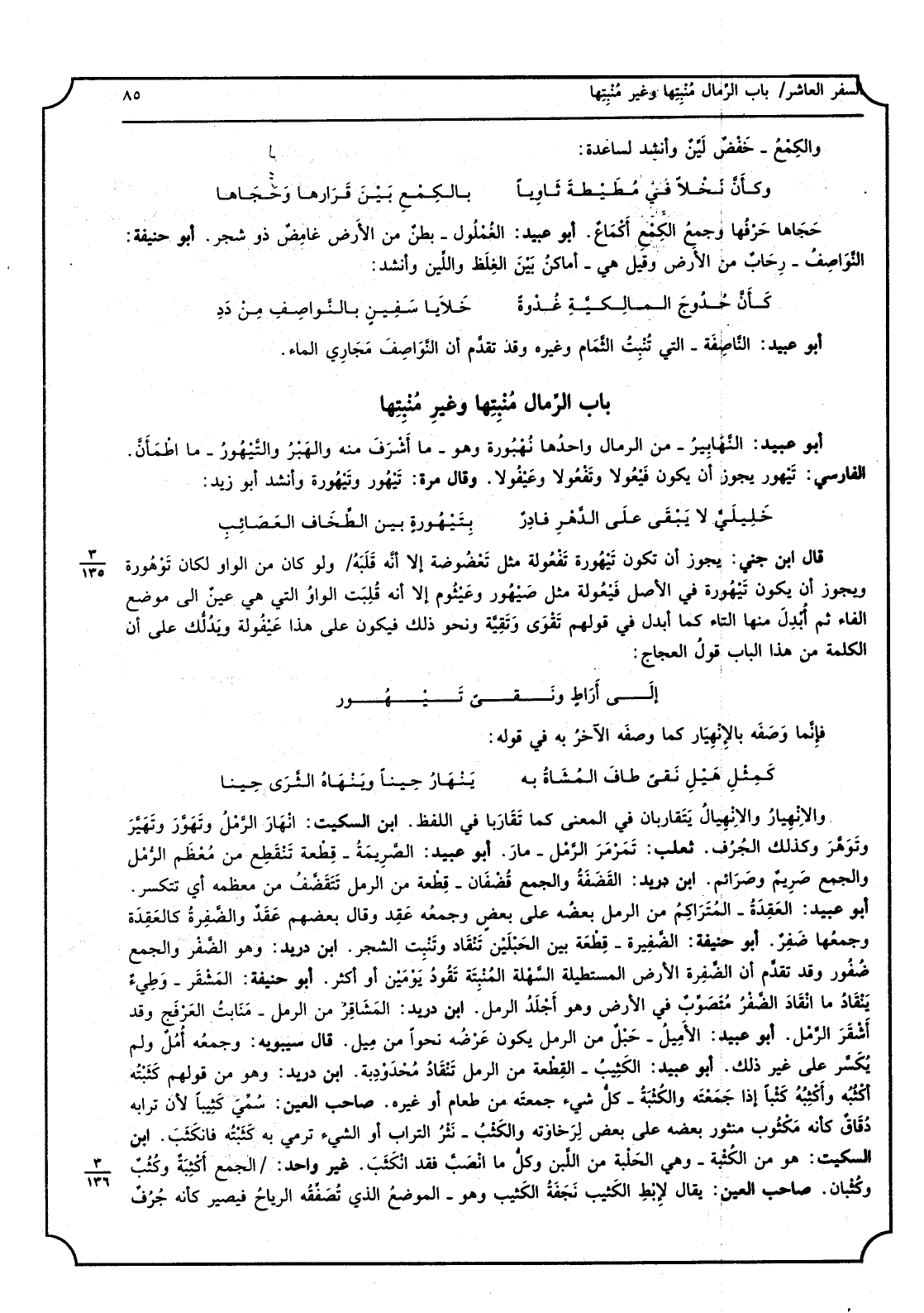 أَبُو عبيد النهابير - من الرمال وَاحِدهَا نهبورة وَهُوَ - مَا أشرف مِنْهُ والهبر والتيهور - مَا اطْمَأَن الْفَارِسِي تيهور يجوز أَن يكون فيعولاً وتفعولاً وعيفولاً وَقَالَ مرّة تيهور وتيهورة وَأنْشد أَبُو زيد: خليلي لَا يبْقى على الدَّهْر فادرٌ بتيهورة بَين الطخاف الصائب قَالَ ابْن جني يجوز أَن تكون تيهورة تفعولة مثل تعضوضة إِلَّا أَنه قلبه وَلَو كَانَ من الْوَاو لَكَانَ توهورة وَيجوز أَن يكون تيهورة فِي الأَصْل فيعولة مثل صيهور وعيثوم إِلَّا أَنه قلبت الْوَاو الَّتِي هِيَ عين إِلَى مَوضِع الْفَاء ثمَّ أبدل مِنْهَا التَّاء كَمَا أبدل فِي قَوْلهم تقوى وتقية وَنَحْو ذَلِك فَيكون على هَذَا عيقولة ويدلك على أَن الْكَلِمَة من هَذَا الْبَاب قَول العجاج: إِلَى أراطٍ ونقىً تيهور فانما وَصفه بالانهيار كَمَا وَصفه الآخر بِهِ فِي قَوْله: كَمثل هيل نفى طَاف المشاة بِهِ ينهار حينا وينهاه الثرى حينا والانهيار والانهيال يتقاربان فِي الْمَعْنى كَمَا تقاربا فِي اللَّفْظ ابْن السّكيت انهار الرمل وتهور وتهير وتوهر وَكَذَلِكَ الجرف ثَعْلَب تمرمر الرمل - مار أَبُو عبيد الصريمة - قِطْعَة تَنْقَطِع من مُعظم الرمل وَالْجمع صريم وصرائم ابْن دُرَيْد القضفة وَالْجمع قضفان - قِطْعَة من الرمل تتقضف من معظمه أَي تتكسر أَبُو عبيد الْعقْدَة - المتراكم من الرمل بعضه على بعض وَجمعه عقد وَقَالَ بَعضهم عقد والضفرة كالعقدة وَجَمعهَا ضفر أَبُو حنيفَة الضفيرة - قِطْعَة بَين الحبلين تنقاد وتنبت الشّجر ابْن دُرَيْد وَهُوَ الضفر وَالْجمع ضفور وَقد تقدم أَن الضفرة الأَرْض المستطيلة السهلة المنبتة تفود يَوْمَيْنِ أَو أَكثر أَبُو حنيفَة المشقر - وطئ ينقاد مَا انْقَادَ الضفر متصوب فِي الأَرْض وَهُوَ أجلد الرمل ابْن دُرَيْد المشاقر من الرمل - منابت العرفج وَقد أشقر الرمل أَبُو عبيد الأميل - حَبل من الرمل يكون عرضه نَحوا من ميل قَالَ سِيبَوَيْهٍ وَجمعه أمل وَلم يكسر على غير ذَلِك أَبُو عبيد الْكَثِيب - الْقطعَة من الرمل تنقاد محدودبة ابْن دُرَيْد وَهُوَ من قَوْلهم كثبته أكثبه وأكثبه كثباً إِذا جمعته والكثبة - كل شَيْء جمعته من طَعَام أوغيره صَاحب الْعين سمي كثيباً لِأَن ترابه دقاق كَأَنَّهُ مَكْتُوب منثور بعضه على بعض لرخاوته والكثب - نثر التُّرَاب أَو الشَّيْء ترمى بِهِ كثبته فانكثب ابْن السّكيت هُوَ من الكثبة - وَهِي الحلبة من اللَّبن وكل مَا انصب فقد انكثب غير وَاحِد الْجمع أكثبة وكثب وكثبان صَاحب الْعين يُقَال لأبط الْكَثِيب نجفة الْكَثِيب وَهُوَ - الْموضع الَّذِي تصفقه الرِّيَاح فَيصير كَأَنَّهُ جرفٌ