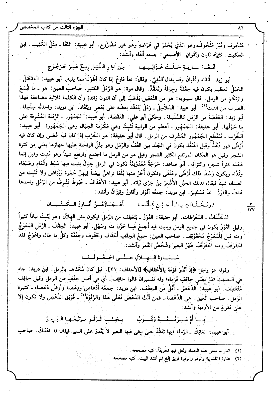 منجوف وقبر منجوف وَهُوَ الَّذِي يحقر فِي عرضه وَهُوَ غير مضروح أَبُو عبيد النقا - مثل الْكَثِيب ابْن السّكيت تثنيته نقيان ونقوان الْأَصْمَعِي جمعه أنقاء وَأنْشد: أنقاء ساريةٍ حلت عزاليها من آخر اللَّيْل ريح غير حرجوج أَبُو زيد أنقاء ونقيان وَقد يُقَال النقي وَقَالَ نقا فارغٌ إِذا كَانَ أطول مِمَّا يَلِيهِ أَبُو عبيد الْعَقَنْقَل - الْحَبل الْعَظِيم يكون فِيهِ حقفة وجرقةٌ وتعقدٌ وَقَالَ مرّة هُوَ - الرمل الْكثير صَاحب الْعين هُوَ - مَا اتَّسع وارتكم من الرمل قَالَ سِيبَوَيْهٍ هُوَ من التعقيل يذهب إِلَى أَن النُّون زَائِدَة وَأَن الْكَلِمَة ثلاثية مضاعفة فَهَذَا الضَّرْب من النبت أَبُو عبيد السلَاسِل - رمل يتعقد بعضه على بعض وينقاد ابْن دُرَيْد واحدته سلسلة أَبُو زيد العقصة من الرمل كالسلسلة وَحكى أَبُو عَليّ العقصة أَبُو عبيد الْجُمْهُور - الرملة المشرفة على مَا حولهَا أَبُو حنيفَة الْجُمْهُور - أعظم من الرابية تنْبت وَهِي مكرمَة الحبال وَهِي الجمهورة أَبُو عبيد الخرب - مُنْقَطع الْجُمْهُور المشرف من الرمل قَالَ أَبُو حنيفَة هُوَ الخرب إِذا كَانَ فِيهِ غضى وَإِن كَانَ فِيهِ أرطى فَهُوَ قنفذ وَقيل الْقُنْفُذ يكون فِي الْجلد بَين القف والرمل وَهُوَ مثل الرَّاحِلَة عَلَيْهَا جهازها يَعْنِي من كَثْرَة الشّجر وَقيل هُوَ الْمَكَان الْمُرْتَفع الْكثير الشّجر وَقيل هُوَ من الرمل مَا اجْتمع وارتفع شياً وَهُوَ منبت وَقيل إِنَّمَا قنفذه كَثْرَة شَجَره والتزاقه أَبُو صاعد حرجة مغدودنة تكون فِي الرمل حبال ينْبت فِيهَا سبط وَتَمام وصبغاء وثداء وَيكون وسط ذَلِك أرطى وعلقى وَتَكون أخر مِنْهَا بلقاء تراهن بيضًا فِيهِنَّ حمرَة وَبَيَاض وَلَا تنْبت من العيدان شيأ فَيُقَال لذَلِك الْحَبل الْأَشْعر من جرى نَبَاته أَبُو عبيد الاهداف - خيوط تشرف من الرمل وَاحِدهَا هدفٌ والقوز - نقا مستدير ابْن دُرَيْد جمعه أقواز وأقاوز وقيزان وَأنْشد: ومخلدات باللجين كَأَنَّمَا أعجازهن أقاوز الكثبان المخلدات - المفرطات أَبُو حنيفَة القوز - يَنْعَطِف من الرمل فَيكون مثل الْهلَال وَهُوَ ينْبت نباتاً كثيرا وَقيل القوز يكون فِي جَمِيع الرمل وينبت فِيهِ أجمع فِيمَا حزن مِنْهُ وَسَهل أَبُو عبيد الحقف - الرمل المعوج وَمِنْه قيل للمعوج محقوقف صَاحب الْعين جمع الحقف أحقاف وحقوف وحقفة وكل مَا طَال واعوج فقد احقوقف وَمِنْه احقوقف ظهر الْبَعِير وشخص التَّمْر وَأنْشد: سماوة الْهلَال حَتَّى احقوقفا وَقَوله عز وَجل: (إِذْ أنذر قومه بالأحقاف) قيل كَانَ سكناهم بالرمل ابْن دُرَيْد جَاءَ فِي الحَدِيث (مر بِظَبْيٍ حَاقِف فَرَمَاهُ) وَله تفسيران قَالُوا حَاقِف - أَي فِي أصل حقف من الرمل وَقيل حَاقِف منعطف أَبُو عبيد الدعص - أقل من الحقف ابْن دُرَيْد جمعه أدعاص ودعصة وَأَرْض دعصاء - كَثِيرَة الرمل صَاحب الْعين هِيَ الدعصة - فَمن أنث الدعص فعلى هَذَا والرقوة - فويق الدعص وَلَا تكون الْأَعْلَى مقربةٍ من الأودية وَأنْشد: لَهَا أم موقفةٌ وكوبٌ بِجنب الرقو مرتعها البرير أَبُو عبيد العانك - الرملة فِيهَا تعقد حَتَّى يبْقى فِيهَا الْبَعِير لَا يقدر على الْبر فَيُقَال قد اعتنك صَاحب