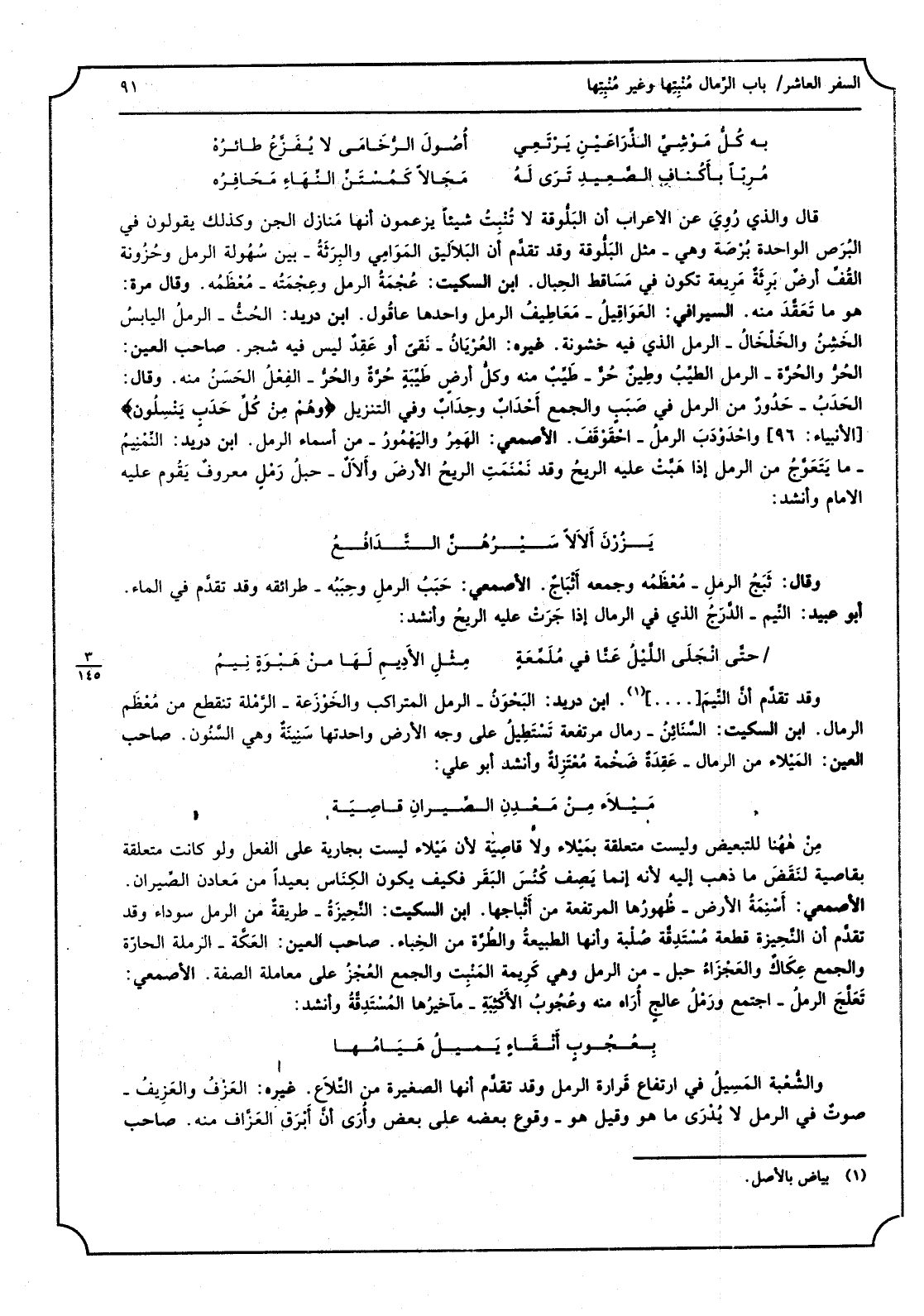 بِهِ كل موشى الذراعين يرتعي أصُول الرخامي لَا يفزع طَائِره مربا بِأَكْنَافِ الصَّعِيد ترى لَهُ مجالاً كمستن النهاء محافره قَالَ وَالَّذِي روى عَن الْأَعْرَاب أَن البلوقة لَا تنْبت شيأ يَزْعمُونَ أَنَّهَا منَازِل الْجِنّ وَكَذَلِكَ يَقُولُونَ فِي البرص الْوَاحِدَة برصة وَهِي - مثل البلوقة وَقد تقدم أَن البلاليق الموامي والبرثة - بَين سهولة الرمل وحزونة القف أرضٌ برثةٌ مريعة تكون فِي مساقط الحبال ابْن السّكيت عجمة الرمل وعجمته - معظمه وَقَالَ مرّة هُوَ مَا تعقد مِنْهُ السيرافي العواقيل - معاطيف الرمل وَاحِدهَا عاقول ابْن دُرَيْد الْحَث - الرمل الْيَابِس الخشن والخلخال - الرمل الَّذِي فِيهِ خشونة غَيره الْعُرْيَان - نقي أَو عقدٌ لَيْسَ فِيهِ شجر صَاحب الْعين الْحر والحرة - الرمل الطّيب وطين حر - طيب مِنْهُ وكل أرضٍ طيبَة حرَّة وَالْحر - الْفِعْل الْحسن مِنْهُ وَقَالَ الحدب - حدور من الرمل فِي صببٍ وَالْجمع أحداب وحداب وَفِي التَّنْزِيل (وهم م كل حدبٍ يَنْسلونَ) واحدودب الرمل - احقوقف الْأَصْمَعِي الهمر واليهمور - من أَسمَاء الرمل ابْن دُرَيْد النمثيم - مَا يتعوج من الرمل إِذا هبت عَلَيْهِ الرّيح وَقد نمنمت الرّيح الأَرْض وألال - حَبل رملٍ معروفٌ يقوم عَلَيْهِ الامام وَأنْشد: يزرن ألالا سيرهن التدافع وَقَالَ ثبج الرمل - معظمه وَجمعه أثباج الْأَصْمَعِي حبب الرمل وحببه - طرائقه وَقد تقدم فِي المَاء أَبُو عبيد النيم - الدرج الَّذِي فِي الرمال إِذا جرت عَلَيْهِ الرّيح وَأنْشد: حَتَّى انجلى اللَّيْل عَنَّا فِي ملمعةٍ مثل الْأَدِيم لَهَا من هبوةٍ نيم وَقد تقدم أَن النيم ابْن دُرَيْد البحون - الرمل المتراكب والخوزعة - الرملة تَنْقَطِع من مُعظم الرمال ابْن السّكيت السنائن - رمال مُرْتَفعَة تستطيل على وَجه الأَرْض واحدتها سنينة وَهِي السنون صَاحب الْعين الميلاء من الرمال - عقدَة ضخمة معتزلة وَأنْشد أَبُو عَليّ: ميلاء من مَعْدن الصيران قاصية من هَهُنَا للتَّبْعِيض وَلَيْسَت مُتَعَلقَة بميلاء وَلَا قاصية أَن ميلاء لَيست بِجَارِيَة على الْفِعْل وَلَو كَانَت مُتَعَلقَة بقاصية لنقض مَا ذهب إِلَيْهِ لِأَنَّهُ إِنَّمَا يصف كنس الْبَقر فَكيف يكون بَعيدا من معادن الصيران الْأَصْمَعِي أسمنة الأَرْض - ظُهُورهَا المرتفعة من أثباجها ابْن السّكيت النحيزة - طريقةٌ من الرمل سَوْدَاء وَقد تقدم أَن النحيزة قِطْعَة مستدقة صلبة وَإِنَّهَا الطبيعة والطرة من الخباء صَاحب الْعين العكة - الرملة الحازة وَالْجمع عكاك والعجزاء - حَبل من الرمل وَهِي كَرِيمَة المنبت وَالْجمع الْعَجز على مُعَاملَة الصّفة الْأَصْمَعِي تعلج الرمل - اجْتمع وَرمل عالجٍ أرَاهُ مِنْهُ وعجوب الأكثبة - مآخيرها المستدقة وَأنْشد: بعجوب أنقاء يمِيل هيامها والشعبة المسيل فِي ارْتِفَاع قرارة الرمل وَقد تقدم أَنَّهَا الصَّغِيرَة من التلاع غَيره العزف والعزيف - صَوت فِي الرمل لَا يدْرِي مَا هُوَ وَقيل هُوَ - وُقُوع بعضه على بعض وَأرى أَن أبرق العزاف مِنْهُ صَاحب