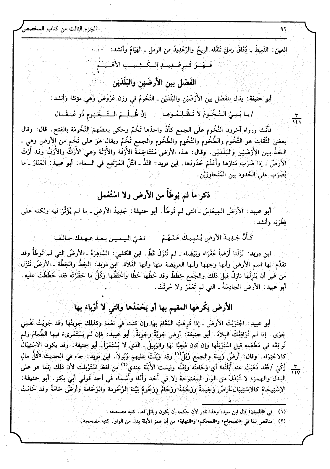 أَبُو عبيد الأَرْض الميعاس - الَّتِي لم تُوطأ أَبُو حنيفَة جَدِيد الأَرْض - مَا لم يُؤثر فِيهِ وَلكنه على فطرته وَأنْشد: كَأَن جَدِيد الأَرْض يتبيك عَنْهُم تَقِيّ الْيَمين بعد عَهْدك حَالف ابْن دُرَيْد نزلنَا أَرضًا عفراء وبيضاء - لم تنزل قطّ ابْن الْكَلْبِيّ الساهرة - الأَرْض الَّتِي لم تُوطأ وَقد تقدم أَنَّهَا اسْم الأَرْض وانها وَجههَا وَأَنَّهَا العريضة مِنْهَا وَأَنَّهَا الفلاة ابْن دُرَيْد الْخط والخطة - الأَرْض تنزل من غير أَن ينزلها نازلٌ قبل ذَلِك وَالْجمع خطط وَقد خطها خطا واختطها وكل مَا خطرته فقد خططت عَلَيْهِ أَبُو عبيد الأَرْض الجادسة - الَّتِي لم تعمر وَلَا حرثت