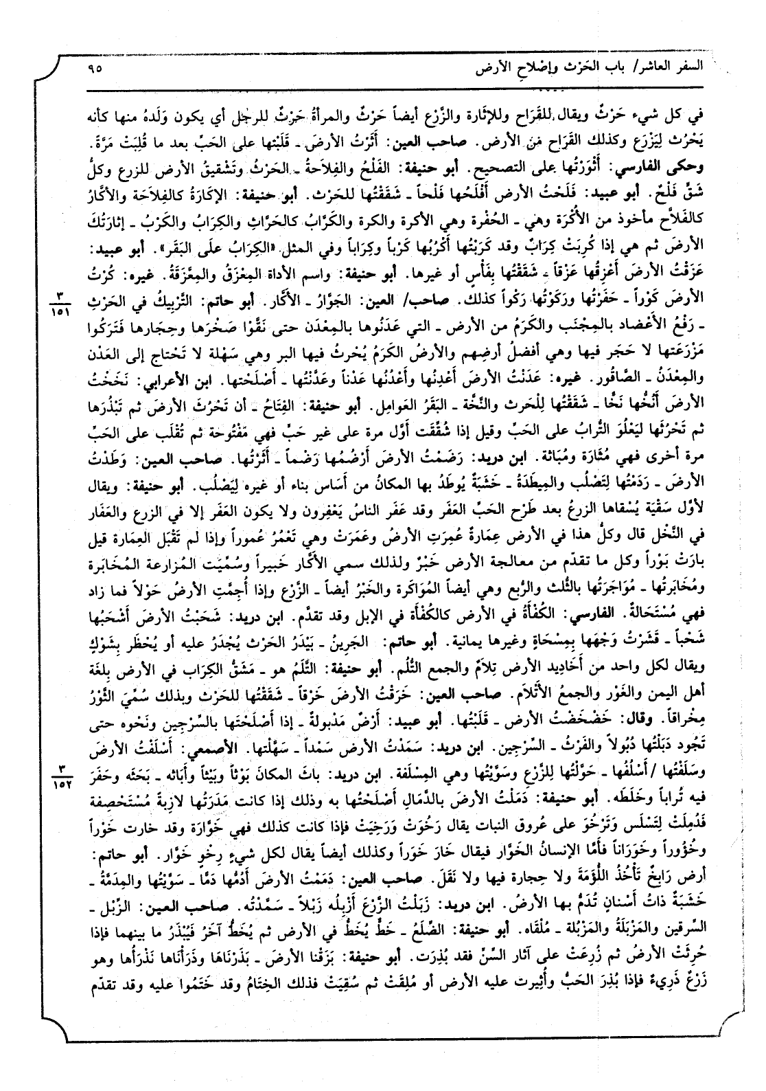 فِي كل شَيْء حرثٌ وَيُقَال للقراح وللاثارة وَالزَّرْع أَيْضا حرث والرمأة حرثٌ للرجل أَي يكون وَلَده مِنْهَا كَأَنَّهُ يحرث ليزرع وَكَذَلِكَ القراح من الأَرْض صَاحب الْعين أثرت الأَرْض - قلبتها على الْحبّ بعد مَا قلبت مرّة وَحكى الْفَارِسِي أثورتها على التَّصْحِيح أَبُو حنيفَة الفلح والفلاحة - الْحَرْث وتشقيق الأَرْض للزَّرْع وكل شقٍِ فلح أَبُو عبيد فلحت الأَرْض أفلحها فلحاً - شققتها للحرث أَبُو حنيفَة الا كارة كالفلاحة والأكار كالفلاح مَأْخُوذ من الأكرة وَهِي - الحفرة وَهِي الأكرة والكرة والكراب كالحرث والكراب وَالْكرب - إثارتك الأَرْض ثمَّ هِيَ إِذا كربت كرابٌ وَقد كربتها أكربها كرباً وكراباً وَفِي الْمثل (الكراب على الْبَقر) أَبُو عبيد عزقت الأَرْض أعزقها عزقاً - شققتها بفأسٍ أَو غَيرهَا أَبُو حنيفَة وَاسم الادارة المعزق والمعزقة غَيره كرت الأَرْض كوراً - حفرتها وركوتها ركواً كَذَلِك صَاحب الْعين الْجوَار - الأكار أَبُو حَاتِم التربيك فِي الْحَرْث - رفع الأعضاد بالمجنب وَالْكَرم من الأَرْض - الَّتِي عدنوها بالمعدن حَتَّى نقوا صخرها وحجارها فتركوا مزرعتها لَا حجر فِيهَا وَهِي أفضل أَرضهم وَالْأَرْض الْكَرم يحرث فِيهَا الْبر وَهِي سهلة لَا تحْتَاج إِلَى العدن والمعدن - الصاقور غَيره عدنت الأَرْض أعدنها وأعدنها عدنا وعدنتها - اصلحتها ابْن الْأَعرَابِي نخخت الأَرْض أنخها نخاً - شققتها للحرث والنخة - الْبَقر العوامل أَبُو حنيفَة الفتاح - أَن تحرث الأَرْض ثمَّ تبذرها ثمَّ تحرثها ليعلو التُّرَاب على الْحبّ وَقيل إِذا شققت أول مرّة على غير حب فَهِيَ مَفْتُوحَة ثمَّ تقلب على الْحبّ مرّة أُخْرَى فَهِيَ مثارة ومباثة ابْن دُرَيْد رضمت الأَرْض ارضمها رضماً - أثرتها صَاحب الْعين وطدت الأَرْض - ردمتها لتصلب والميطدة - خَشَبَة يوطد بهَا الْمَكَان من أساس بِنَاء أَو غَيره ليصلب أَبُو حنيفَة وَيُقَال لأوّل سقية يسقاها الزَّرْع بعد طرح الْحبّ العفر وَقد عفر النَّاس يعفرون وَلَا يكون العفر إِلَّا فِي الزَّرْع والعفار فِي النّخل قَالَ وكل هَذَا فِي الأَرْض عمارةٌ عمرت الأَرْض وعمرت وَهِي تعمر عموراً وَإِذا لم تقبل الْعِمَارَة قيل بارت بوراً وكل مَا تقدم من معالجة الأَرْض خبر وَلذَلِك سمي الأكار خَبِيرا وَسميت الْمُزَارعَة المخابرة ومخابرتها - مواجرتها بِالثُّلثِ وَالرّبع وَهِي أَيْضا المواكرة وَالْخَبَر أَيْضا - الزَّرْع وَإِذا أجمت الأَرْض حولا فَمَا زَاد فَهِيَ مستحالة الْفَارِسِي الكفأة فِي الأَرْض كالكفأة فِي الابل وَقد تقدم ابْن دُرَيْد شحبت الأَرْض أشحبها شحباً - قشرت وَجههَا بمسحاة وَغَيرهَا يَمَانِية أَبُو حَاتِم الجرين - بيدر الْحَرْث يجدر عَلَيْهِ أَو يحظر بشوكٍ وَيُقَال لكل واحدٍ من أخاديد الأَرْض تلامٌ وَالْجمع التلم أَبُو حنيفَة التلم هُوَ - مشق الكراب فِي الأَرْض بلغَة أهل الْيمن والغور وَالْجمع الأتلام صَاحب الْعين خرقت الأَرْض خرقاً - شققتها للحرث وَبِذَلِك سمي الثور مخراقاً وَقَالَ خضخضت الأَرْض - قلبتها أَبُو عبيد أَرض مدبولةٌ - إِذا أصلحتها بالسرجين وَنَحْوه حَتَّى تجود دبلتها دبولاً والفرث - السرجين ابْن دُرَيْد سمدت الأَرْض سمداً - سهلتها الْأَصْمَعِي أسلفت الأَرْض وسلفتها أسلفها - حولتها للزَّرْع وسويتها وَهِي المسفلة ابْن دُرَيْد باث الْمَكَان بوثاً وبيثاً وأباثه - بَحثه وحفر فِيهِ تُرَابا وخلطه أَبُو حنيفَة دملت الأَرْض بالدمال - أصلحتها بِهِ وَذَلِكَ إِذا كَانَت مدرتها لَا زبة مستحصفة فدملت لتسلس وترخو على عروق النَّبَات يُقَال رخوت ورخيت فَإِذا كَانَت كَذَلِك فَهِيَ خوارة وَقد خارت خوراً وخؤوراً وخوراناً فَأَما الانسان الخوار فَيُقَال خار خوراً وَكَذَلِكَ أَيْضا يُقَال لكل شَيْء رخوٍ خوار أَبُو حَاتِم أَرض رابخ تَأْخُذ اللؤمة وَلَا حِجَارَة فِيهَا وَلَا نقل صَاحب الْعين دممت الأَرْض أدمها دَمًا - سويتها والمدم