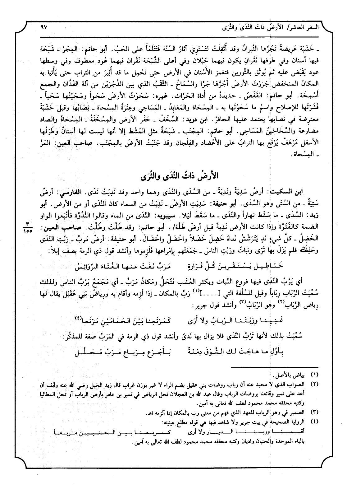 ابْن السّكيت أرضٌ سديةٌ ونديةٌ - من السدى والند وهما وَاحِد وَقد نذيت ندىً الْفَارِسِي أرشٌ ستيةٌ - من الستي وَهُوَ السدى أَبُو حنيفَة سديت الأَرْض - نديت من السَّمَاء كَانَ الندى أَو من الأَرْض أَبُو زيد السدى - مَا سقط نَهَارا والندى - مَا سقط لَيْلًا سِيبَوَيْهٍ الندى من المَاء وَقَالُوا الندوة فأتبعوا الْوَاو الضمة كالفتوة وَإِذا كَانَت الضمة نديةً قيل أرضٌ طلة أَبُو حَاتِم وَقد طلت وطلت صَاحب الْعين الخضل - كل شيءٍ ندٍ يترشش نداه خضل خضلاً واخضل واخضال أَبُو حنيفَة أرضٌ مربٌ - ربت الندى وحفظته فَلم يزل بهَا ثرى ونبات وربت النَّاس - جمعتهم بامراعها فلزموها وَأنْشد قَول ذِي الرمة يصف ابلاً: خناطيل يستقرين كل قرارةٍ مربٍ نفت عَنْهَا الغثاء الروائس أَي يرب الندى فِيهَا فروع النَّبَات وَيكثر العشب فَتحل وَمَكَان مرب - أَي مجمع يرب النَّاس وَلذَلِك سميت الربَاب رباباً وَقيل للسلفة الَّتِي رب بِالْمَكَانِ - إِذا لزمَه واقام بِهِ وياض بني عقيل يُقَال لَهَا رياض الربَاب وَهُوَ الربَاب وَأنْشد قَول جرير: غنينا وربتنا الربَاب وَلَا أرى كمرتعنا بَين الحمامين مرتعا سميت بذلك لِأَنَّهَا ترب الندى فَلَا يزَال بهَا ندى وَأنْشد قَول ذِي الرمة فِي المرب صفة للمذكر: بِأول مَا هَاجَتْ لَك الشوق دمنةٌ بأجرع مرباع مرب مُحَلل