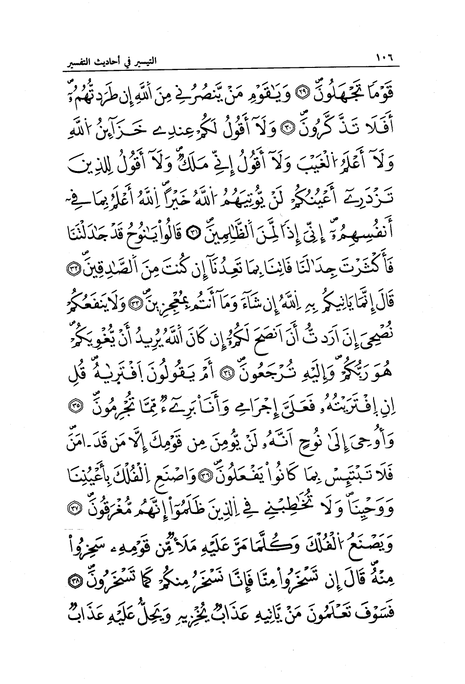 قَوْمًا تَجْهَلُونَ (29) وَيَا قَوْمِ مَنْ يَنْصُرُنِي مِنَ اللَّهِ إِنْ طَرَدْتُهُمْ أَفَلَا تَذَكَّرُونَ (30) وَلَا أَقُولُ لَكُمْ عِنْدِي خَزَائِنُ اللَّهِ وَلَا أَعْلَمُ الْغَيْبَ وَلَا أَقُولُ إِنِّي مَلَكٌ وَلَا أَقُولُ لِلَّذِينَ تَزْدَرِي أَعْيُنُكُمْ لَنْ يُؤْتِيَهُمُ اللَّهُ خَيْرًا اللَّهُ أَعْلَمُ بِمَا فِي أَنْفُسِهِمْ إِنِّي إِذًا لَمِنَ الظَّالِمِينَ (31) قَالُوا يَا نُوحُ قَدْ جَادَلْتَنَا فَأَكْثَرْتَ جِدَالَنَا فَأْتِنَا بِمَا تَعِدُنَا إِنْ كُنْتَ مِنَ الصَّادِقِينَ (32) قَالَ إِنَّمَا يَأْتِيكُمْ بِهِ اللَّهُ إِنْ شَاءَ وَمَا أَنْتُمْ بِمُعْجِزِينَ (33) وَلَا يَنْفَعُكُمْ نُصْحِي إِنْ أَرَدْتُ أَنْ أَنْصَحَ لَكُمْ إِنْ كَانَ اللَّهُ يُرِيدُ أَنْ يُغْوِيَكُمْ هُوَ رَبُّكُمْ وَإِلَيْهِ تُرْجَعُونَ (34) أَمْ يَقُولُونَ افْتَرَاهُ قُلْ إِنِ افْتَرَيْتُهُ فَعَلَيَّ إِجْرَامِي وَأَنَا بَرِيءٌ مِمَّا تُجْرِمُونَ (35) وَأُوحِيَ إِلَى نُوحٍ أَنَّهُ لَنْ يُؤْمِنَ مِنْ قَوْمِكَ إِلَّا مَنْ قَدْ آمَنَ فَلَا تَبْتَئِسْ بِمَا كَانُوا يَفْعَلُونَ (36) وَاصْنَعِ الْفُلْكَ بِأَعْيُنِنَا وَوَحْيِنَا وَلَا تُخَاطِبْنِي فِي الَّذِينَ ظَلَمُوا إِنَّهُمْ مُغْرَقُونَ (37) وَيَصْنَعُ الْفُلْكَ وَكُلَّمَا مَرَّ عَلَيْهِ مَلَأٌ مِنْ قَوْمِهِ سَخِرُوا مِنْهُ قَالَ إِنْ تَسْخَرُوا مِنَّا فَإِنَّا نَسْخَرُ مِنْكُمْ كَمَا تَسْخَرُونَ (38) فَسَوْفَ تَعْلَمُونَ مَنْ يَأْتِيهِ عَذَابٌ يُخْزِيهِ وَيَحِلُّ عَلَيْهِ عَذَابٌ
