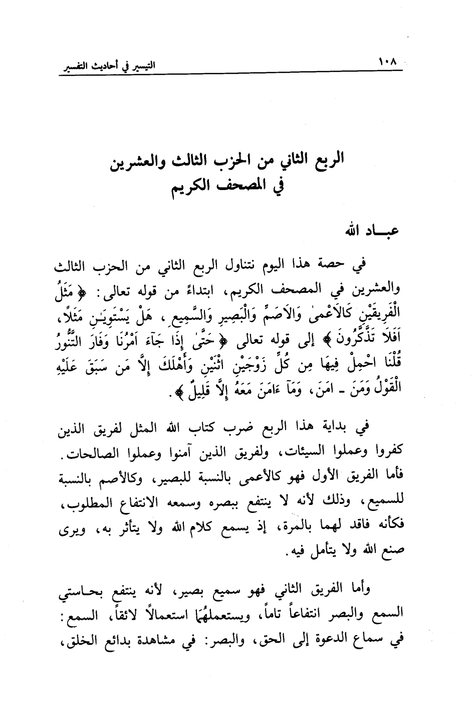في بداية هذا الربع، ضرب كتاب الله المثل لفريق الذين كفروا وعملوا السيئات، ولفريق الذين آمنوا وعملوا الصالحات. فأما الفريق الأول فهو كالأعمى بالنسبة للبصير، وكالأصم بالنسبة للسميع، وذلك لأنه لا ينتفع ببصره وسمعه الانتفاع المطلوب، فكأنه فاقد لهما بالمرة، إذ يسمع كلام الله ولا يتأثر به، ويرى صنع الله ولا يتأمل فيه.