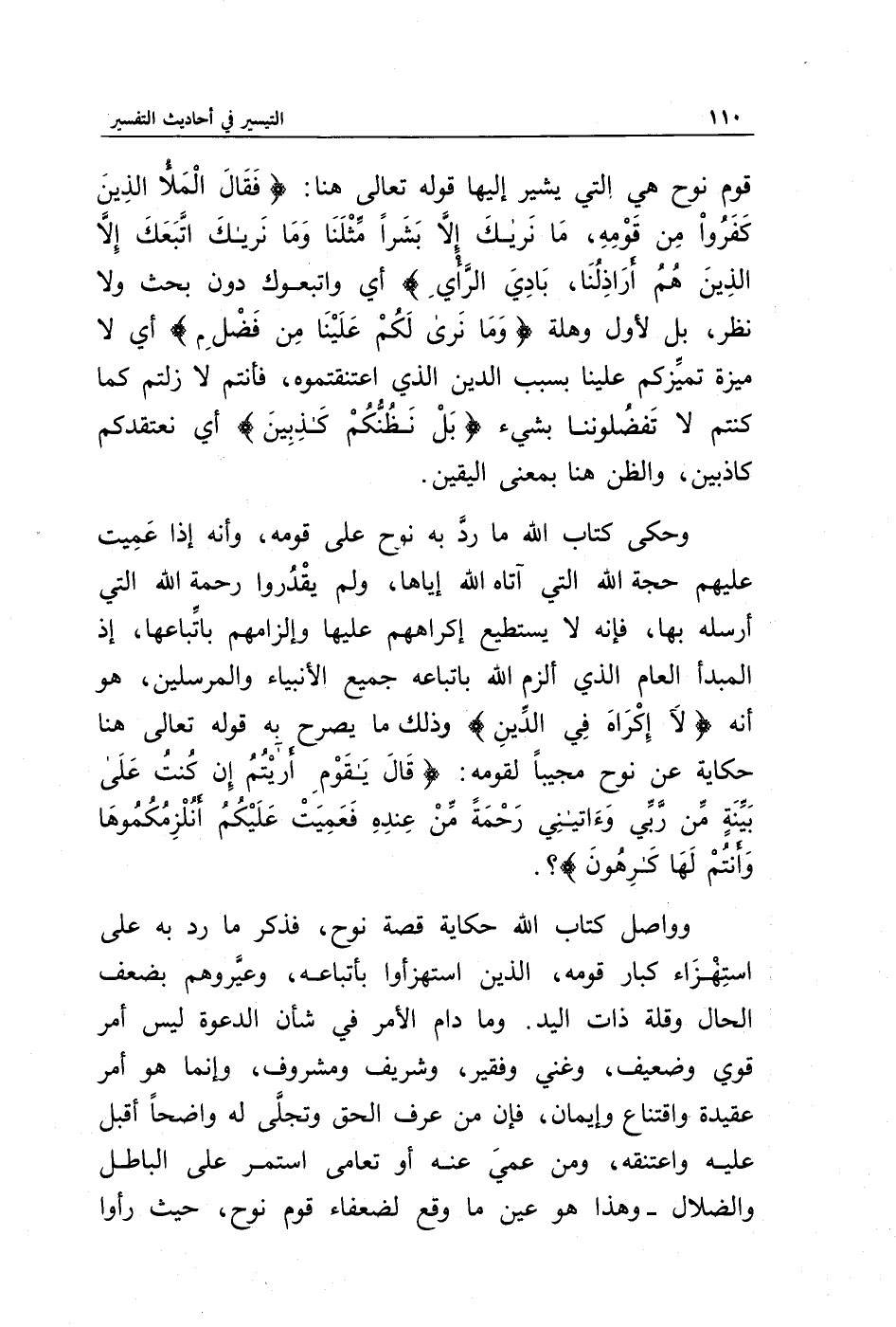 وواصل كتاب الله حكاية قصة نوح، فذكر ما رد به على استهزاء كبار قومه، الذين استهزأوا بأتباعه، وعيروهم بضعف الحال وقلة ذات اليد. وما دام الأمر في شأن الدعوة ليس أمر قوي وضعيف، وغني وفقير، وشريف ومشروف، وإنما هو أمر عقيدة واقتناع وإيمان، فإن من عرف الحق وتجلى له واضحا أقبل عليه واعتنقه، ومن عمي عنه أو تعامى استمر على الباطل والضلال -وهذا هو عين ما وقع لضعفاء قوم نوح، حيث رأوا