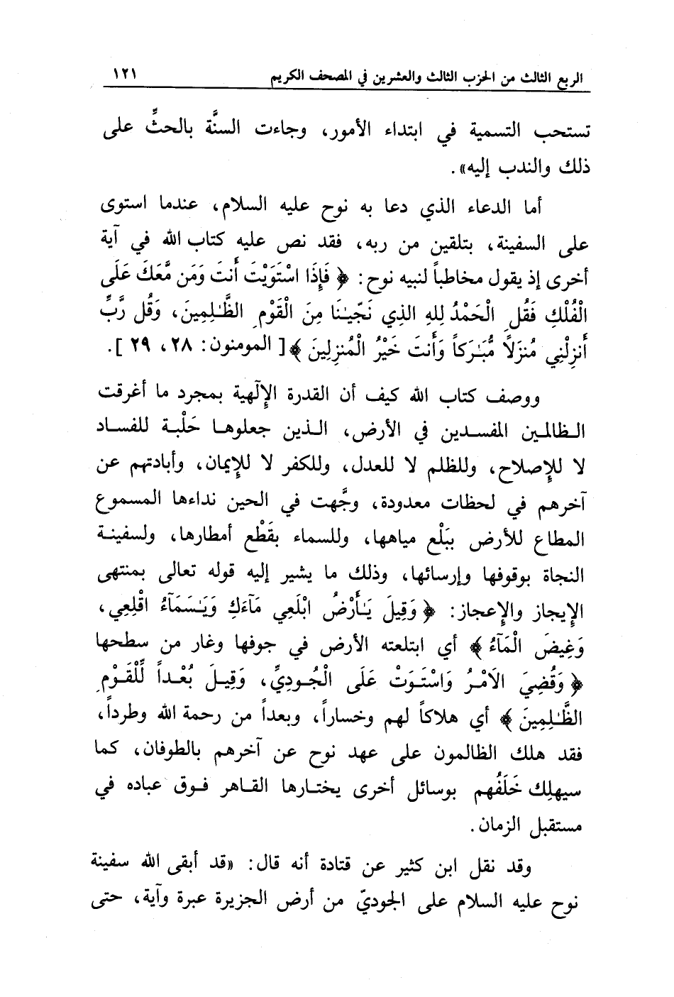 ووصف كتاب الله كيف أن القدرة الإلهية بمجرد ما أغرقت الظالمين المفسدين في الأرض، الذين جعلوها حلبة للفساد لا للإصلاح، وللظلم لا للعدل، وللكفر لا للإيمان، وإبادتهم عن آخرهم في لحظات معدودة، وجهت في الحين نداءها المسموع المطاع للأرض ببلع مياهها، وللسماء بقطع أمطارها، ولسفينة النجاة بوقوفها وإرسائها، وذلك ما يشير إليه قوله تعالى بمنتهى الإيجاز والإعجاز: {وَقِيلَ يَا أَرْضُ ابْلَعِي مَاءَكِ وَيَا سَمَاءُ أَقْلِعِي وَغِيضَ الْمَاءُ} أي ابتلعته الأرض في جوفها وغار من سطحها {قُضِيَ الْأَمْرُ وَاسْتَوَتْ عَلَى الْجُودِيِّ وَقِيلَ بُعْدًا لِلْقَوْمِ الظَّالِمِينَ} أي هلاكا لهم وخسارا، وبعدا من رحمة الله وطردا، فقد هلك الظالمون على عهد نوح عن آخرهم بالطوفان، كما سيهلك خلفهم بوسائل أخرى يختارها القاهر فوق عباده في مستقبل الزمان.