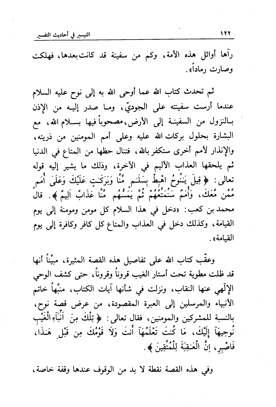 ثم تحدث كتاب الله عما أوحى الله به إلى نوح عليه السلام عندما أرست سفينته على الجودي، وما صدر إليه من الإذن بالنزول من السفينة إلى الأرض، مصحوبا فيها بسلام الله، مع البشارة بحلول بركات الله عليه وعلى أمم المؤمنين من ذريته، والإنذار لأمم أخرى ستكفر بالله، فتنال حظها من المتاع في الدنيا ثم يلحقها العذاب الأليم في الآخرة، وذلك ما يشير إليه قوله تعالى: {قِيلَ يَا نُوحُ اهْبِطْ بِسَلَامٍ مِنَّا وَبَرَكَاتٍ عَلَيْكَ وَعَلَى أُمَمٍ مِمَّنْ مَعَكَ وَأُمَمٌ سَنُمَتِّعُهُمْ ثُمَّ يَمَسُّهُمْ مِنَّا عَذَابٌ أَلِيمٌ}. قال محمد بن كعب: " دخل في هذا السلام كل مؤمن ومؤمنة إلى يوم القيامة، وكذلك دخل في العذاب والمتاع كل كافر وكافرة إلى يوم القيامة ".