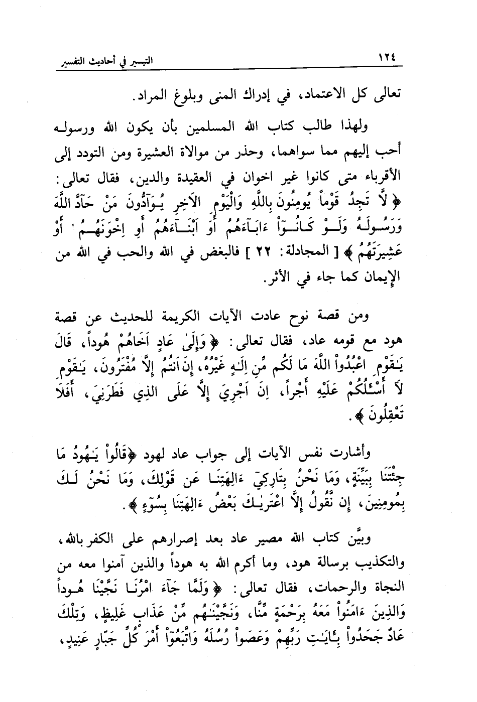 ولهذا طالب كتاب الله المسلمين بأن يكون الله ورسوله أحب إليهم مما سواهما، وحذر من موالاة العشيرة ومن التودد إلى الأقرباء متى كانوا غير إخوان في العقيدة والدين، فقال تعالى: {لَا تَجِدُ قَوْمًا يُؤْمِنُونَ بِاللَّهِ وَالْيَوْمِ الْآخِرِ يُوَادُّونَ مَنْ حَادَّ اللَّهَ وَرَسُولَهُ وَلَوْ كَانُوا آبَاءَهُمْ أَوْ أَبْنَاءَهُمْ أَوْ إِخْوَانَهُمْ أَوْ عَشِيرَتَهُمْ} [المجادلة: 22] فالبغض في الله والحب في الله من الإيمان كما جاء في الأثر.