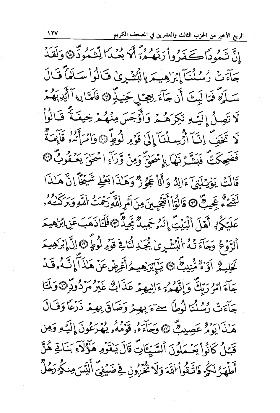 إِنَّ ثَمُودَ كَفَرُوا رَبَّهُمْ أَلَا بُعْدًا لِثَمُودَ (68) وَلَقَدْ جَاءَتْ رُسُلُنَا إِبْرَاهِيمَ بِالْبُشْرَى قَالُوا سَلَامًا قَالَ سَلَامٌ فَمَا لَبِثَ أَنْ جَاءَ بِعِجْلٍ حَنِيذٍ (69) فَلَمَّا رَأَى أَيْدِيَهُمْ لَا تَصِلُ إِلَيْهِ نَكِرَهُمْ وَأَوْجَسَ مِنْهُمْ خِيفَةً قَالُوا لَا تَخَفْ إِنَّا أُرْسِلْنَا إِلَى قَوْمِ لُوطٍ (70) وَامْرَأَتُهُ قَائِمَةٌ فَضَحِكَتْ فَبَشَّرْنَاهَا بِإِسْحَاقَ وَمِنْ وَرَاءِ إِسْحَاقَ يَعْقُوبَ (71) قَالَتْ يَا وَيْلَتَى أَأَلِدُ وَأَنَا عَجُوزٌ وَهَذَا بَعْلِي شَيْخًا إِنَّ هَذَا لَشَيْءٌ عَجِيبٌ (72) قَالُوا أَتَعْجَبِينَ مِنْ أَمْرِ اللَّهِ رَحْمَتُ اللَّهِ وَبَرَكَاتُهُ عَلَيْكُمْ أَهْلَ الْبَيْتِ إِنَّهُ حَمِيدٌ مَجِيدٌ (73) فَلَمَّا ذَهَبَ عَنْ إِبْرَاهِيمَ الرَّوْعُ وَجَاءَتْهُ الْبُشْرَى يُجَادِلُنَا فِي قَوْمِ لُوطٍ (74) إِنَّ إِبْرَاهِيمَ لَحَلِيمٌ أَوَّاهٌ مُنِيبٌ (75) يَا إِبْرَاهِيمُ أَعْرِضْ عَنْ هَذَا إِنَّهُ قَدْ جَاءَ أَمْرُ رَبِّكَ وَإِنَّهُمْ آتِيهِمْ عَذَابٌ غَيْرُ مَرْدُودٍ (76) وَلَمَّا جَاءَتْ رُسُلُنَا لُوطًا سِيءَ بِهِمْ وَضَاقَ بِهِمْ ذَرْعًا وَقَالَ هَذَا يَوْمٌ عَصِيبٌ (77) وَجَاءَهُ قَوْمُهُ يُهْرَعُونَ إِلَيْهِ وَمِنْ قَبْلُ كَانُوا يَعْمَلُونَ السَّيِّئَاتِ قَالَ يَا قَوْمِ هَؤُلَاءِ بَنَاتِي هُنَّ أَطْهَرُ لَكُمْ فَاتَّقُوا اللَّهَ وَلَا تُخْزُونِ فِي ضَيْفِي أَلَيْسَ مِنْكُمْ رَجُلٌ