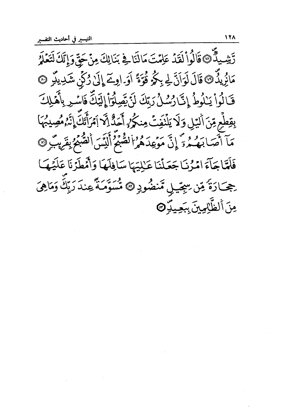 رَشِيدٌ (78) قَالُوا لَقَدْ عَلِمْتَ مَا لَنَا فِي بَنَاتِكَ مِنْ حَقٍّ وَإِنَّكَ لَتَعْلَمُ مَا نُرِيدُ (79) قَالَ لَوْ أَنَّ لِي بِكُمْ قُوَّةً أَوْ آوِي إِلَى رُكْنٍ شَدِيدٍ (80) قَالُوا يَا لُوطُ إِنَّا رُسُلُ رَبِّكَ لَنْ يَصِلُوا إِلَيْكَ فَأَسْرِ بِأَهْلِكَ بِقِطْعٍ مِنَ اللَّيْلِ وَلَا يَلْتَفِتْ مِنْكُمْ أَحَدٌ إِلَّا امْرَأَتَكَ إِنَّهُ مُصِيبُهَا مَا أَصَابَهُمْ إِنَّ مَوْعِدَهُمُ الصُّبْحُ أَلَيْسَ الصُّبْحُ بِقَرِيبٍ (81) فَلَمَّا جَاءَ أَمْرُنَا جَعَلْنَا عَالِيَهَا سَافِلَهَا وَأَمْطَرْنَا عَلَيْهَا حِجَارَةً مِنْ سِجِّيلٍ مَنْضُودٍ (82) مُسَوَّمَةً عِنْدَ رَبِّكَ وَمَا هِيَ مِنَ الظَّالِمِينَ بِبَعِيدٍ (83)