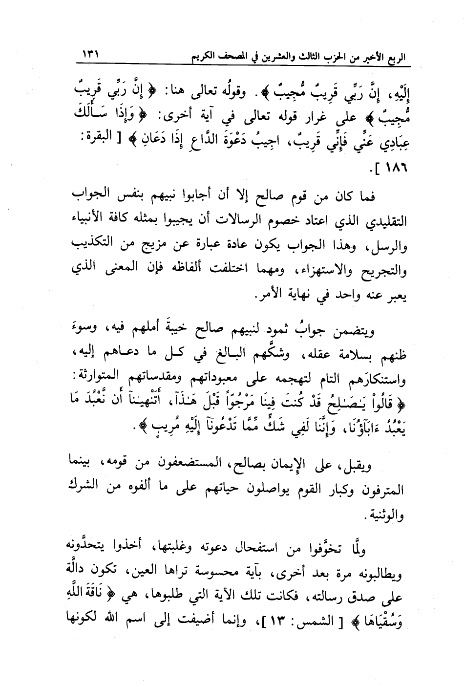 ولمَّا تخوَّفوا من استفحال دعوته وغلبتها، أخذوا يتحدَّونه ويطالبونه مرة بعد أخرى، بآية محسوسة تراها العين، تكون دالة على صدق رسالته، فكانت تلك الآية التي طلبوها، هي {نَاقَةَ اللَّهِ وَسُقْيَاهَا} [الشمس: 13]، وإنما أضيفت إلى اسم الله لكونها