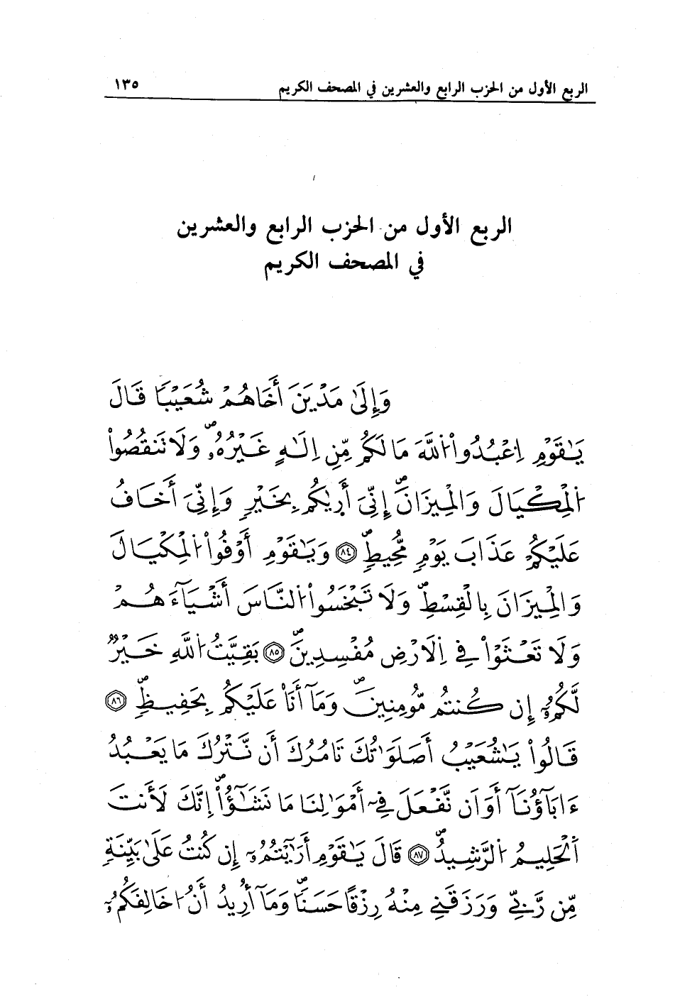 وَإِلَى مَدْيَنَ أَخَاهُمْ شُعَيْبًا قَالَ يَا قَوْمِ اعْبُدُوا اللَّهَ مَا لَكُمْ مِنْ إِلَهٍ غَيْرُهُ وَلَا تَنْقُصُوا الْمِكْيَالَ وَالْمِيزَانَ إِنِّي أَرَاكُمْ بِخَيْرٍ وَإِنِّي أَخَافُ عَلَيْكُمْ عَذَابَ يَوْمٍ مُحِيطٍ (84) وَيَا قَوْمِ أَوْفُوا الْمِكْيَالَ وَالْمِيزَانَ بِالْقِسْطِ وَلَا تَبْخَسُوا النَّاسَ أَشْيَاءَهُمْ وَلَا تَعْثَوْا فِي الْأَرْضِ مُفْسِدِينَ (85) بَقِيَّتُ اللَّهِ خَيْرٌ لَكُمْ إِنْ كُنْتُمْ مُؤْمِنِينَ وَمَا أَنَا عَلَيْكُمْ بِحَفِيظٍ (86) قَالُوا يَا شُعَيْبُ أَصَلَاتُكَ تَأْمُرُكَ أَنْ نَتْرُكَ مَا يَعْبُدُ آبَاؤُنَا أَوْ أَنْ نَفْعَلَ فِي أَمْوَالِنَا مَا نَشَاءُ إِنَّكَ لَأَنْتَ الْحَلِيمُ الرَّشِيدُ (87) قَالَ يَا قَوْمِ أَرَأَيْتُمْ إِنْ كُنْتُ عَلَى بَيِّنَةٍ مِنْ رَبِّي وَرَزَقَنِي مِنْهُ رِزْقًا حَسَنًا وَمَا أُرِيدُ أَنْ أُخَالِفَكُمْ