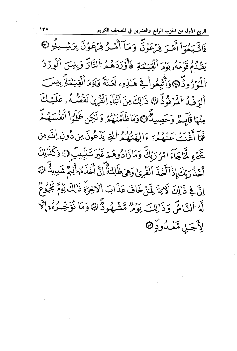 فَاتَّبَعُوا أَمْرَ فِرْعَوْنَ وَمَا أَمْرُ فِرْعَوْنَ بِرَشِيدٍ (97) يَقْدُمُ قَوْمَهُ يَوْمَ الْقِيَامَةِ فَأَوْرَدَهُمُ النَّارَ وَبِئْسَ الْوِرْدُ الْمَوْرُودُ (98) وَأُتْبِعُوا فِي هَذِهِ لَعْنَةً وَيَوْمَ الْقِيَامَةِ بِئْسَ الرِّفْدُ الْمَرْفُودُ (99) ذَلِكَ مِنْ أَنْبَاءِ الْقُرَى نَقُصُّهُ عَلَيْكَ مِنْهَا قَائِمٌ وَحَصِيدٌ (100) وَمَا ظَلَمْنَاهُمْ وَلَكِنْ ظَلَمُوا أَنْفُسَهُمْ فَمَا أَغْنَتْ عَنْهُمْ آلِهَتُهُمُ الَّتِي يَدْعُونَ مِنْ دُونِ اللَّهِ مِنْ شَيْءٍ لَمَّا جَاءَ أَمْرُ رَبِّكَ وَمَا زَادُوهُمْ غَيْرَ تَتْبِيبٍ (101) وَكَذَلِكَ أَخْذُ رَبِّكَ إِذَا أَخَذَ الْقُرَى وَهِيَ ظَالِمَةٌ إِنَّ أَخْذَهُ أَلِيمٌ شَدِيدٌ (102) إِنَّ فِي ذَلِكَ لَآيَةً لِمَنْ خَافَ عَذَابَ الْآخِرَةِ ذَلِكَ يَوْمٌ مَجْمُوعٌ لَهُ النَّاسُ وَذَلِكَ يَوْمٌ مَشْهُودٌ (103) وَمَا نُؤَخِّرُهُ إِلَّا لِأَجَلٍ مَعْدُودٍ (104)