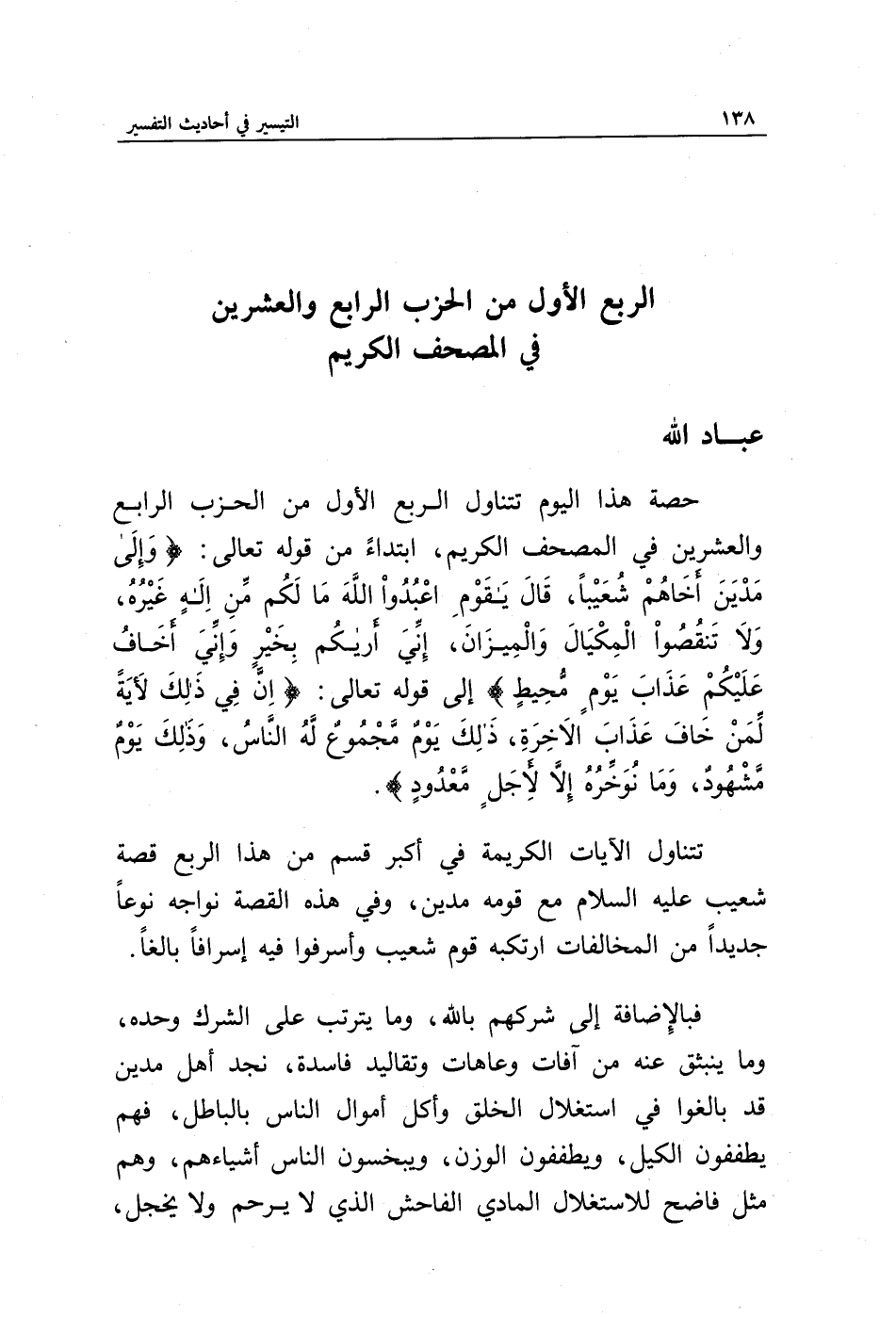 حصة هذا اليوم تتناول الربع الأول من الحزب الرابع والعشرين في المصحف الكريم، ابتداء من قوله تعالى: {وَإِلَى مَدْيَنَ أَخَاهُمْ شُعَيْبًا قَالَ يَا قَوْمِ اعْبُدُوا اللَّهَ مَا لَكُمْ مِنْ إِلَهٍ غَيْرُهُ وَلَا تَنْقُصُوا الْمِكْيَالَ وَالْمِيزَانَ إِنِّي أَرَاكُمْ بِخَيْرٍ وَإِنِّي أَخَافُ عَلَيْكُمْ عَذَابَ يَوْمٍ مُحِيطٍ} إلى قوله تعالى: {إِنَّ فِي ذَلِكَ لَآيَةً لِمَنْ خَافَ عَذَابَ الْآخِرَةِ ذَلِكَ يَوْمٌ مَجْمُوعٌ لَهُ النَّاسُ وَذَلِكَ يَوْمٌ مَشْهُودٌ * وَمَا نُؤَخِّرُهُ إِلَّا لِأَجَلٍ مَعْدُودٍ}.
